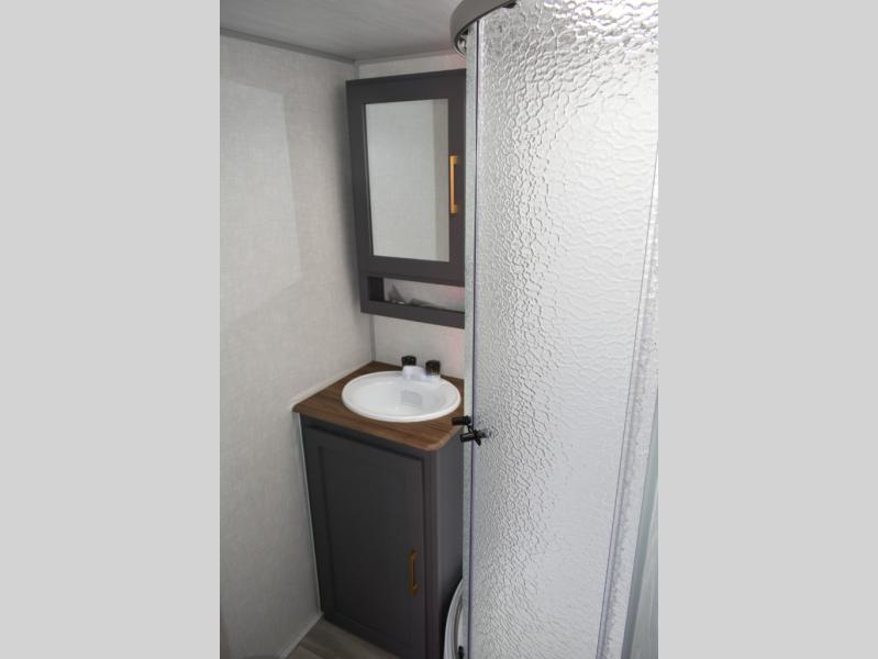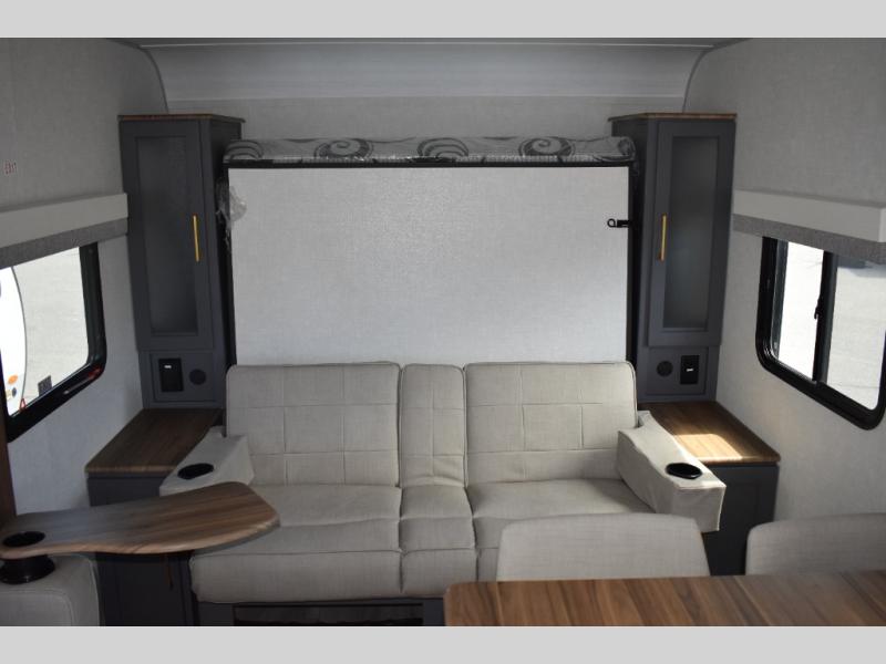 This Ibex travel trailer is incredibly versatile! With two sofas, there's plenty of room to relax inside, or set up outdoors under the 16' awning. There's a 60" x 80" Murphy bed where you'll be able to sleep comfortably, and you can dine in style at the L-shaped countertop with bar stool seats and chat with the cook in the kitchen. At the rear you'll find a full bath with a radius shower, a toilet, and a sink with a medicine cabinet above it.
