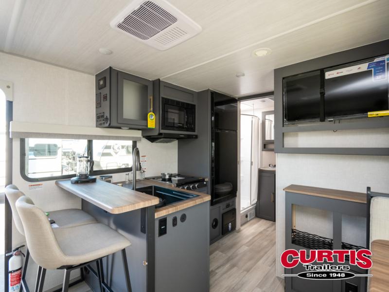 This Forest River IBEX travel trailer has a clever use of space that gives you a lot of options. The kitchen features an L-shaped countertop with bar stool seats, or you can eat at the booth dinette that is tucked into its own slide out so there's plenty of floor space. The sofa is across from the entertainment center and fireplace so you can relax in the evenings. When it's time for bed, there's a 60" x 80" Murphy bed which will be super comfortable for a good night's sleep! The rear bath has a roomy shower plus a wardrobe and linen closet to store all your things.