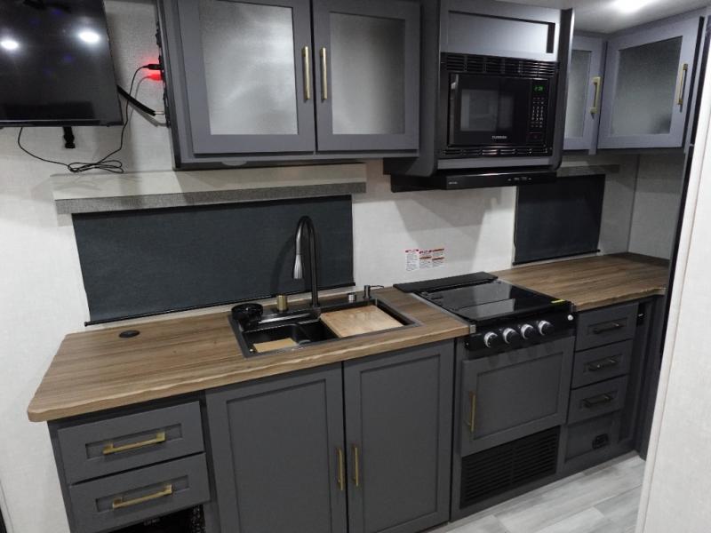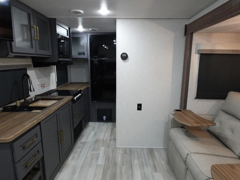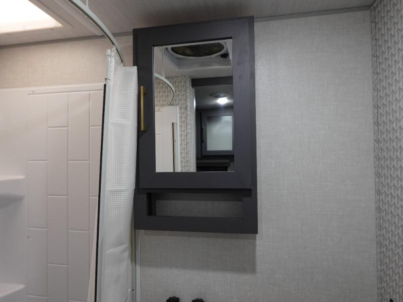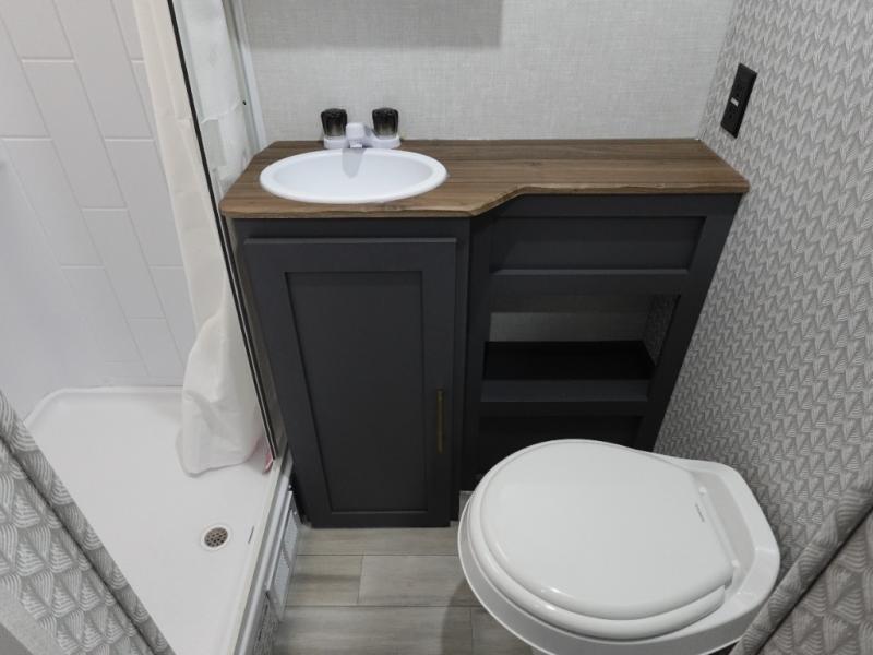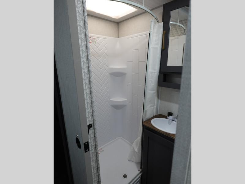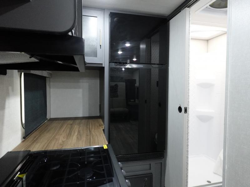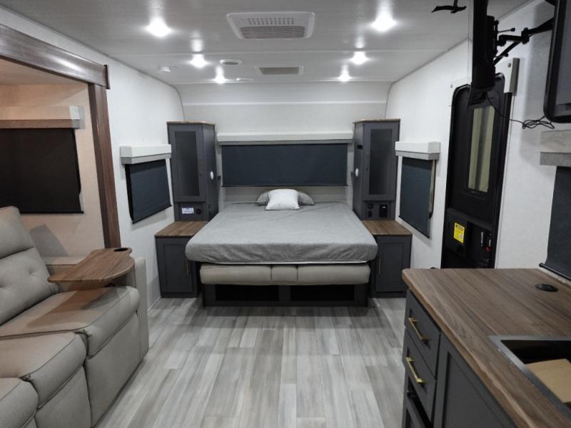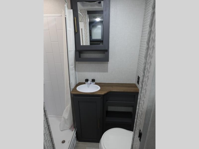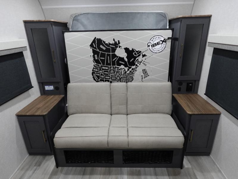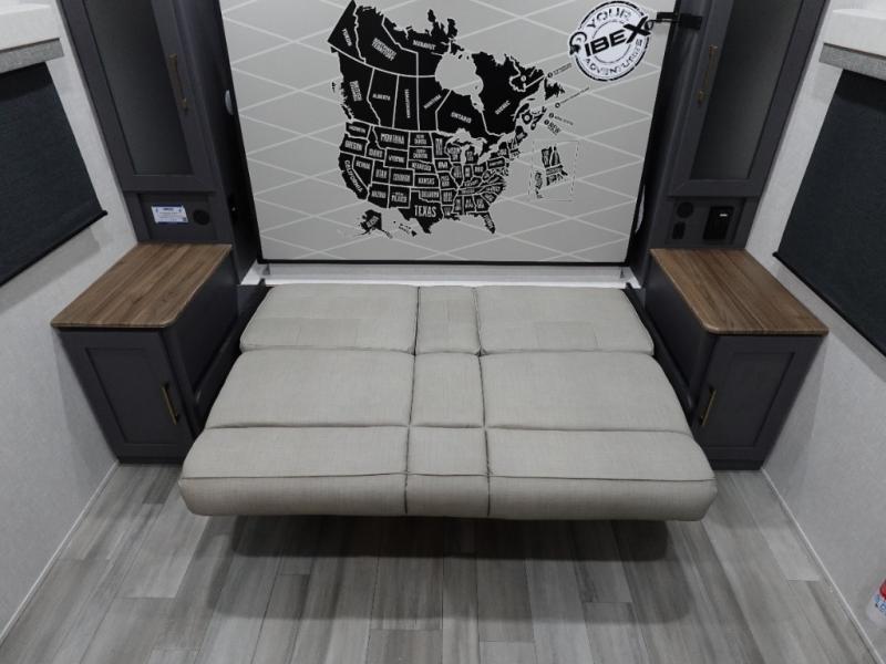 This Forest River IBEX travel trailer has a clever use of space that gives you a lot of options. The kitchen features ample counter space to prep meals, and you can relax on the sofa slide out after dinner. When it's time for bed, there's a 60" x 80" Murphy bed which will be super comfortable for a good night's sleep! The rear corner bath has a roomy shower to freshen up each day, along with a toilet, sink, and medicine cabinet.