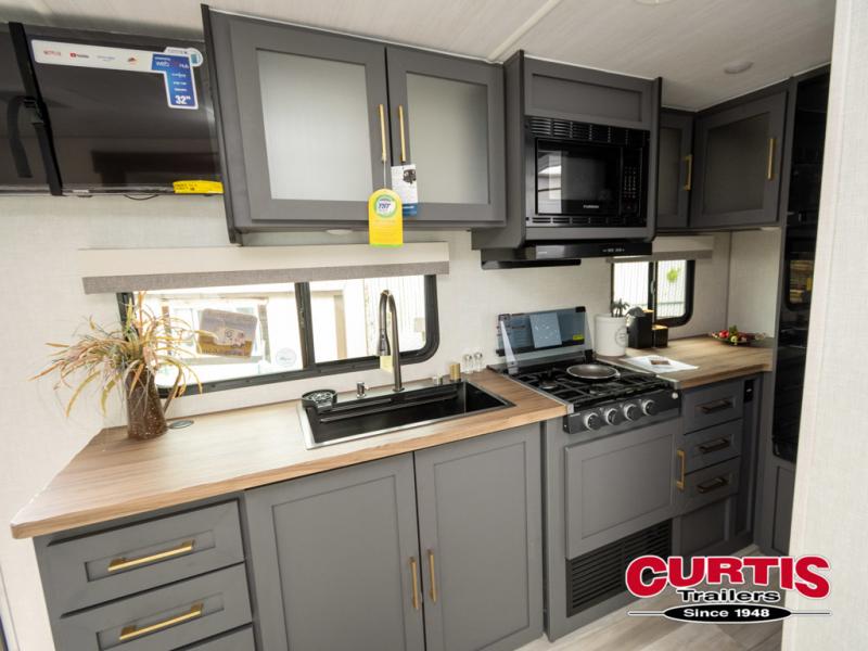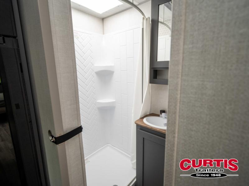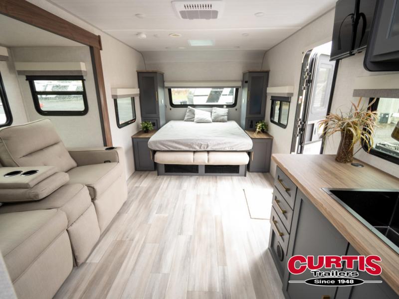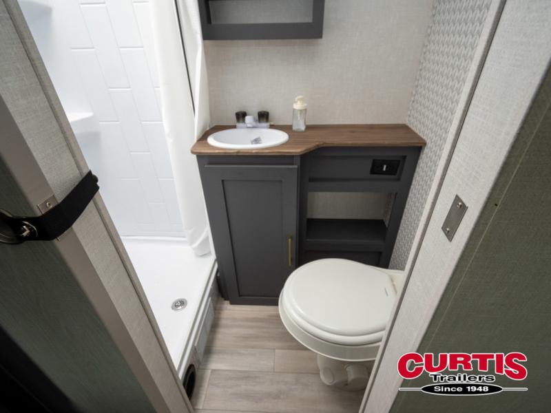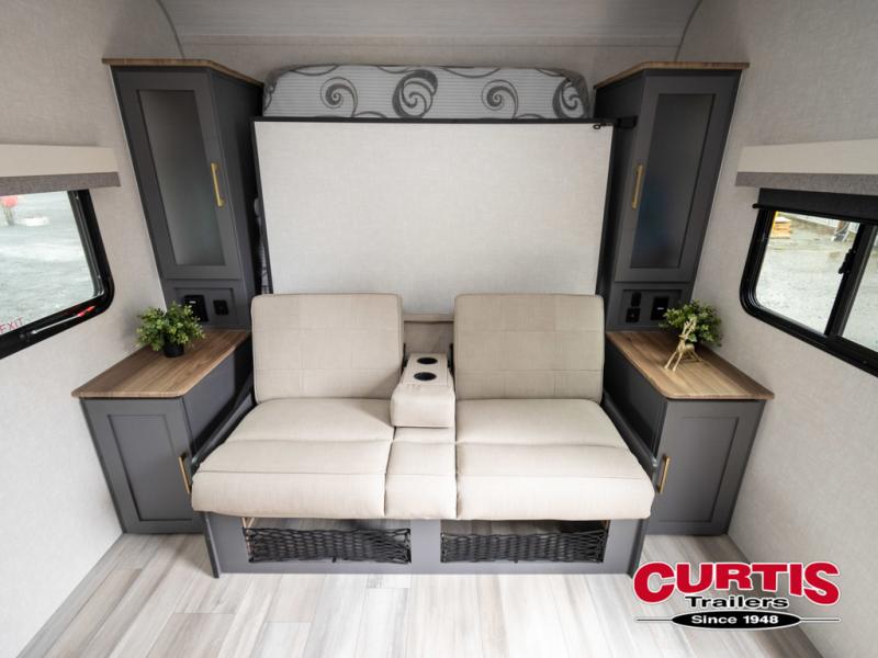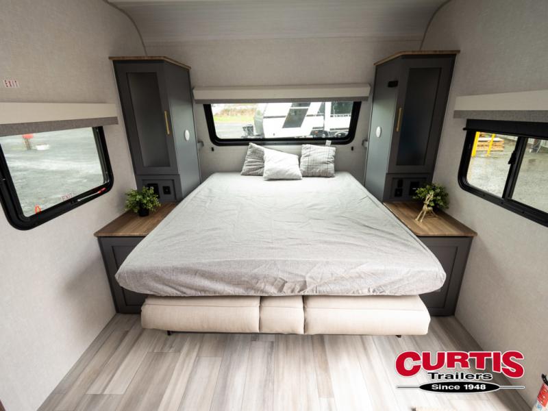 This Forest River IBEX travel trailer has a clever use of space that gives you a lot of options. The kitchen features ample counter space to prep meals, and you can relax on the sofa slide out after dinner. When it's time for bed, there's a 60" x 80" Murphy bed which will be super comfortable for a good night's sleep! The rear corner bath has a roomy shower to freshen up each day, along with a toilet, sink, and medicine cabinet.