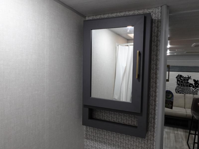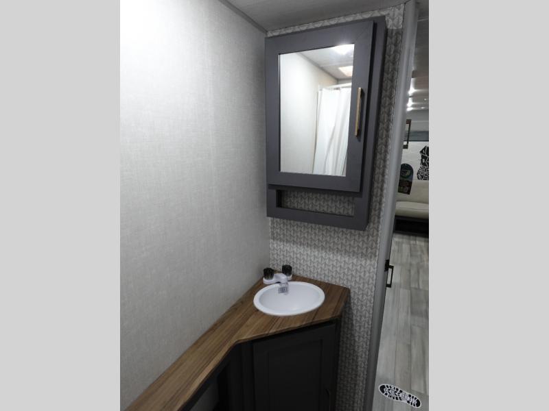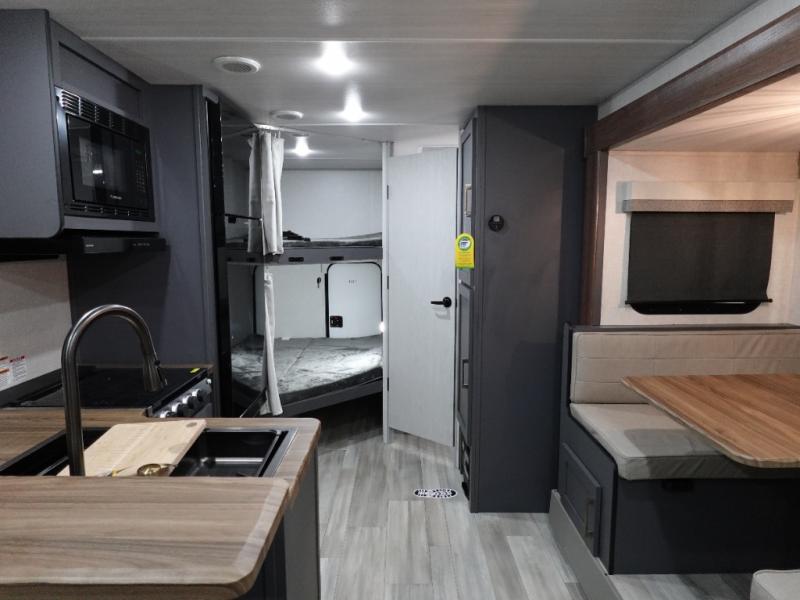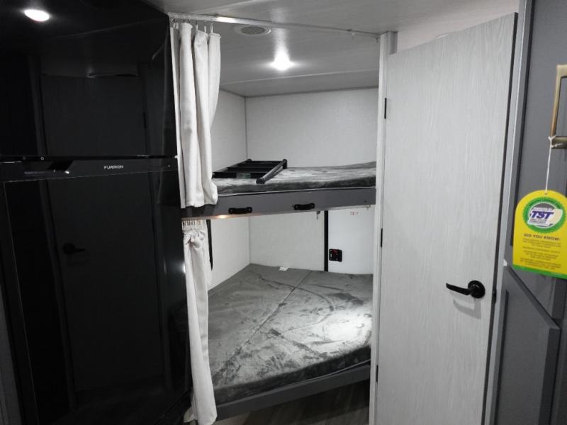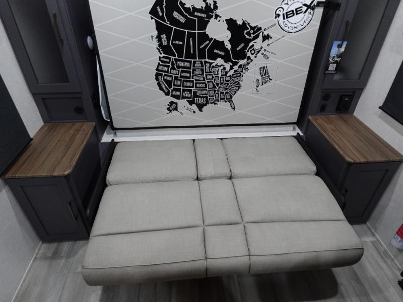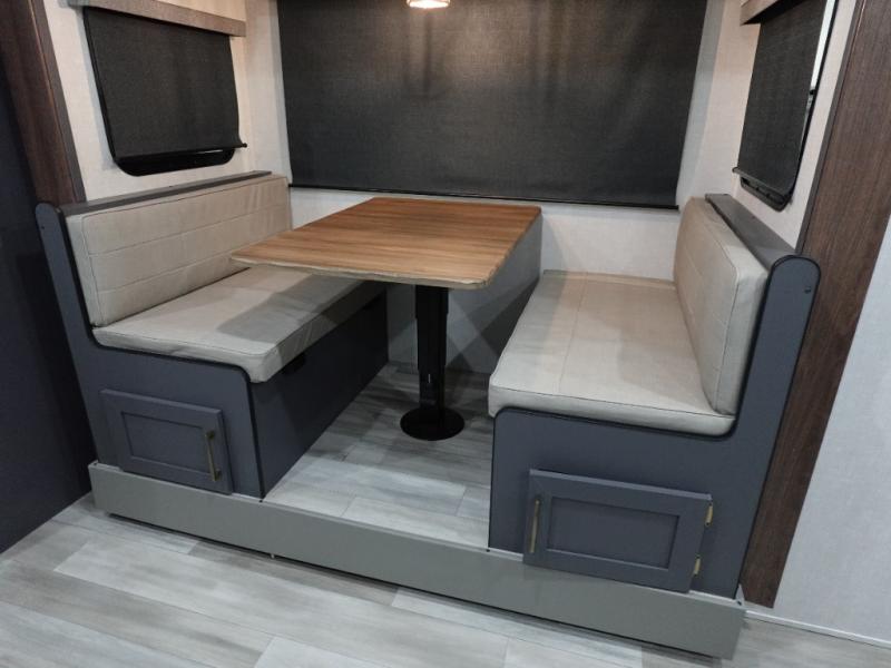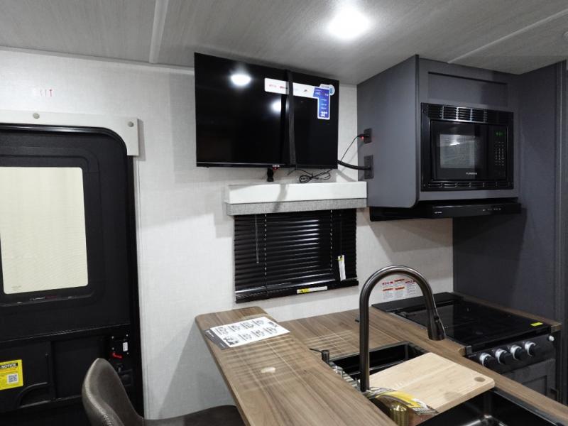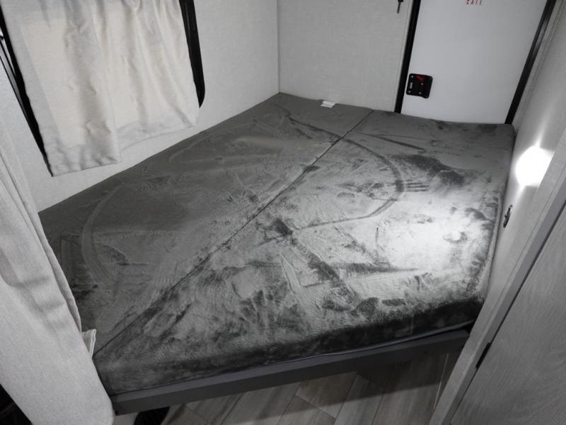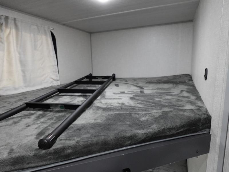 This Forest River IBEX travel trailer has a clever use of space that gives you a lot of options. The kitchen includes an all-in-one microwave and air fryer to cook meals plus a pantry and refrigerator for food storage. When it's time for bed, there's a 60" x 80" Murphy bed which will be super comfortable for a good night's sleep, and the little ones can claim the double-size bunks towards the back. A full bath onboard means you won't have to use the camp's facilities at night, and you'll find plenty of storage throughout this unit for all your gear!