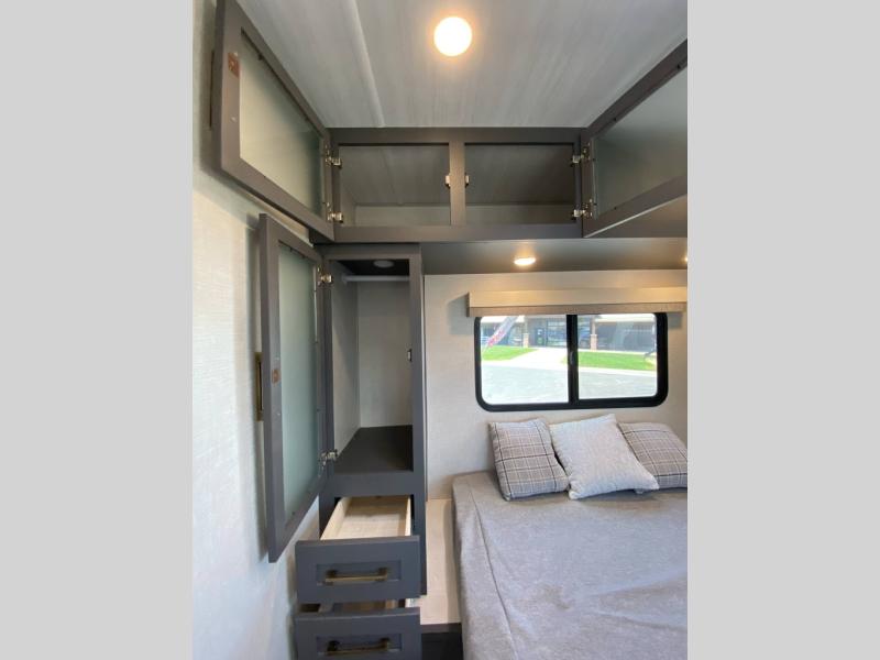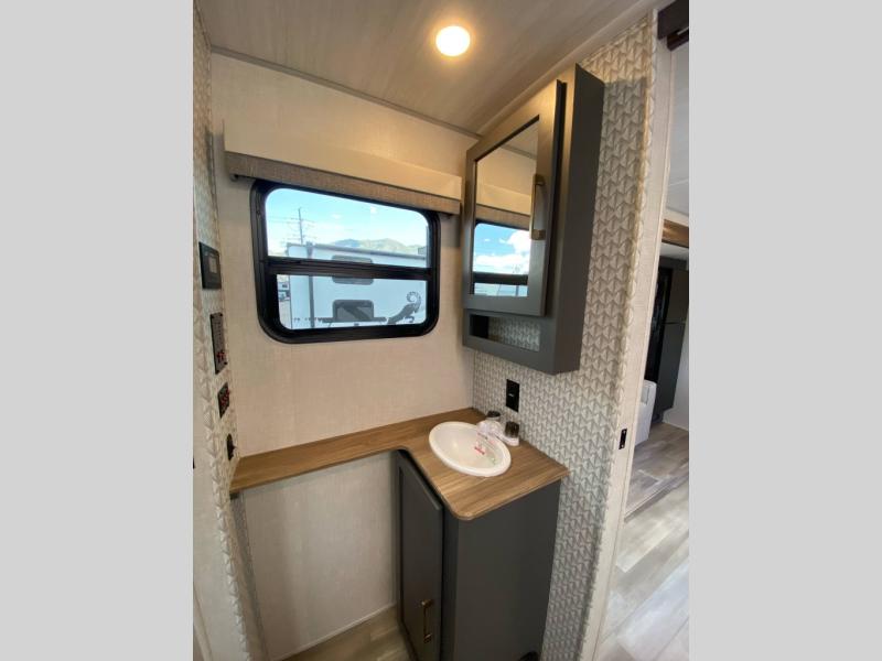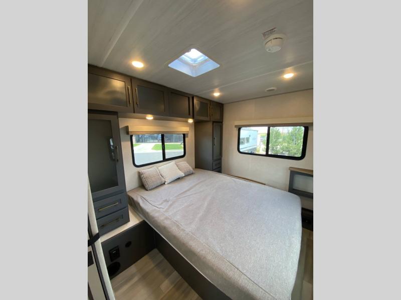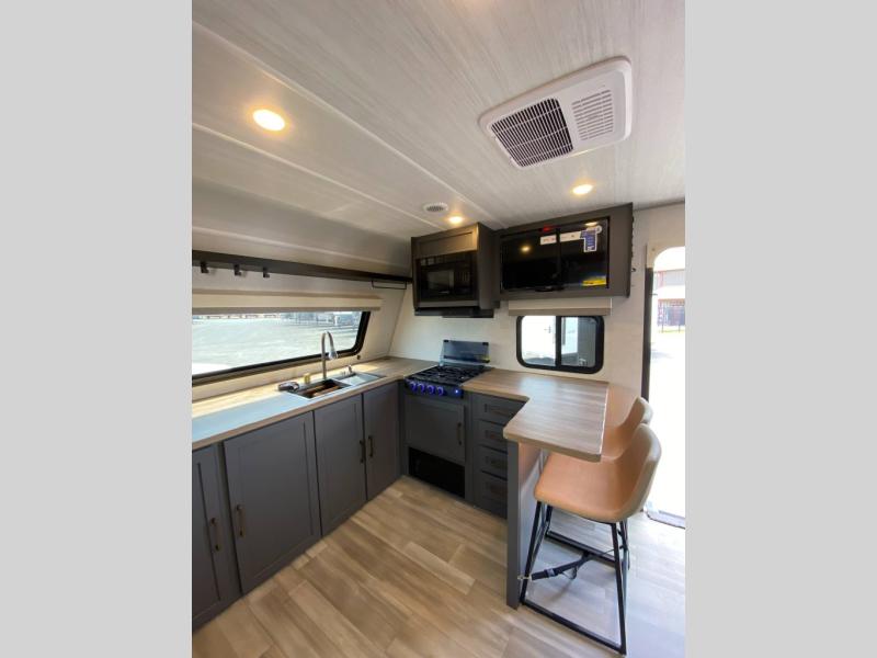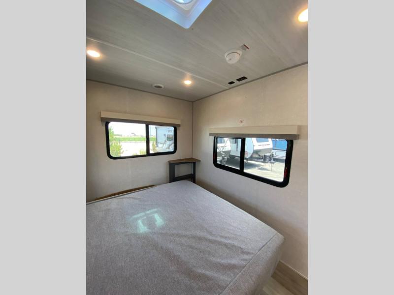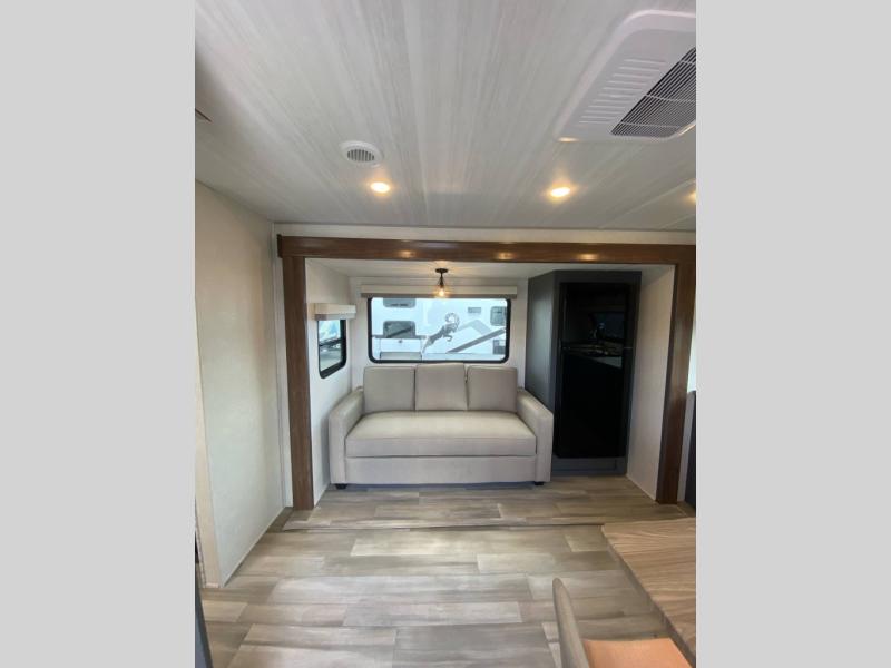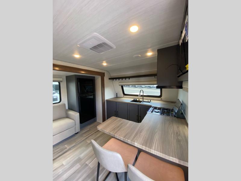 Enjoy fun camping trips in this front kitchen travel trailer! The chef of your group will appreciate the ample counter space to prep meals and set out snacks, plus there is a countertop with stools where you can enjoy your morning coffee at. A sofa slide out provides more seating space, as well as sleeping space for a guest or two little ones. You can freshen up each day in the walk-thru bath, and the rear master bedroom includes a queen bed for more comfort. There are also dual bedroom wardrobes, an overhead cabinet, and a bench where you can sit to pull your hiking boots on.