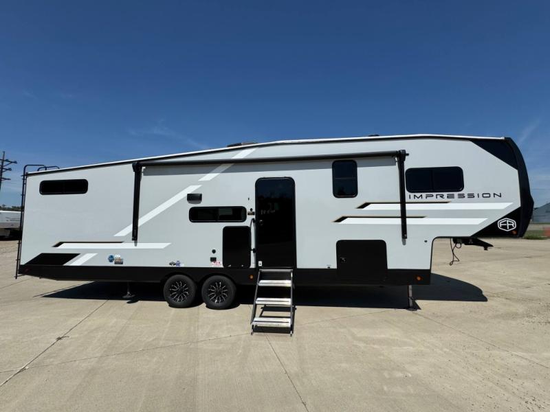 With any Impression mid-profile fifth wheel by Forest River, the focus of the design is comfort and value, built with quality craftsmanship and attention to customer's desires in each Impression! The exterior includes upgraded E-rated MAXXIS tires, custom exterior graphics package, and insulated slam latch baggage doors. There is also an enclosed docking station, an outside shower, and a 100W roof solar panel for off-grid capabilities. The fully heated and enclosed AccessiBelly has removable underbelly panels and offers four seasons of travel, and there is an industry leading 15K A/C plus 35K BTU furnace to keep you comfortable. The interior has lumbercore cabinetry, residential linoleum, residential backsplash in the kitchen, and oversized opening windows in the living area for more natural lighting and good air flow.