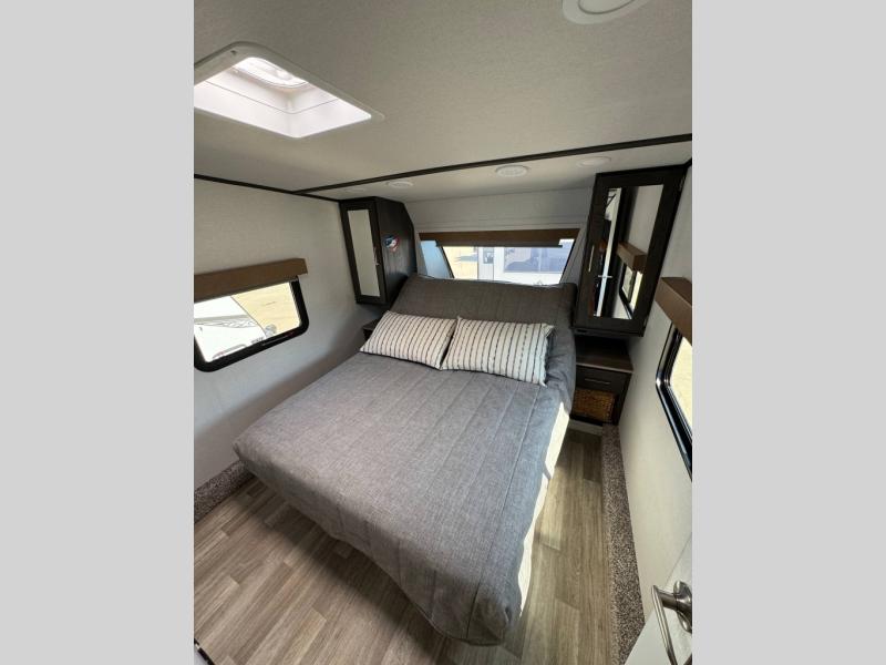 This fifth wheel is going to make an impression on anyone that steps foot inside or walks around the outside! From having a second entry/exit door into the rear bunkhouse and a main entry into the living and kitchen area, plus having an outside kitchen to make meals in the great outdoors, nobody will ever want to go home! The rear bunkhouse also includes a Versa queen bed plus two flip-down upper bunks, plus storage. The front bedroom gives you privacy from everyone and there is a walk-around queen bed with Versa Tilt technology, three wardrobes and washer/dryer prep. The full bathroom will keep everyone refreshed, and the inside kitchen has full amenities including an L-shaped counter. There is even hidden storage behind the LED TV with fireplace below.