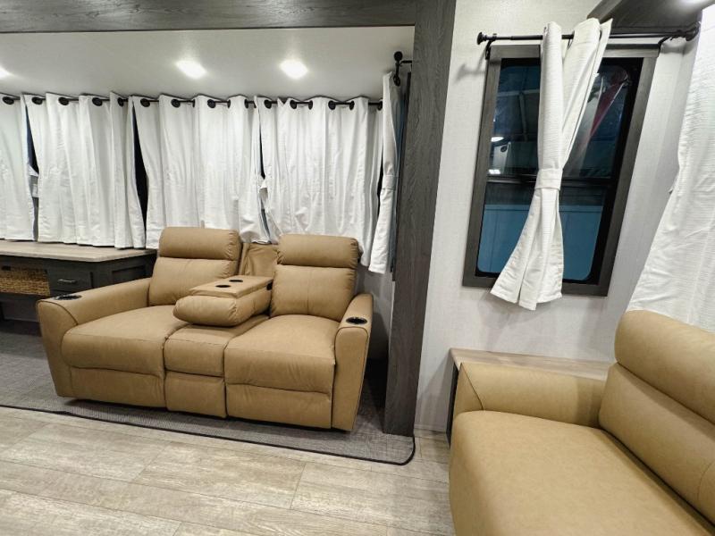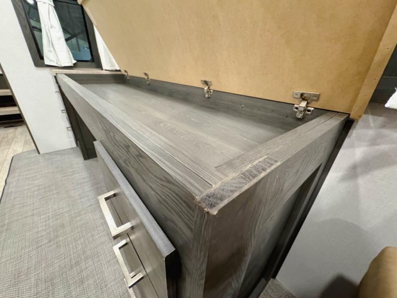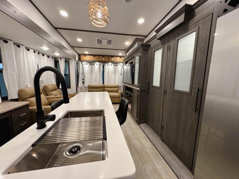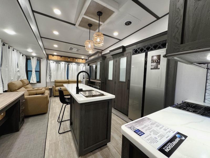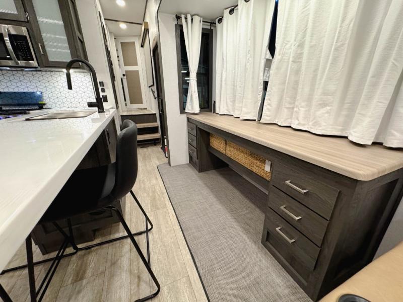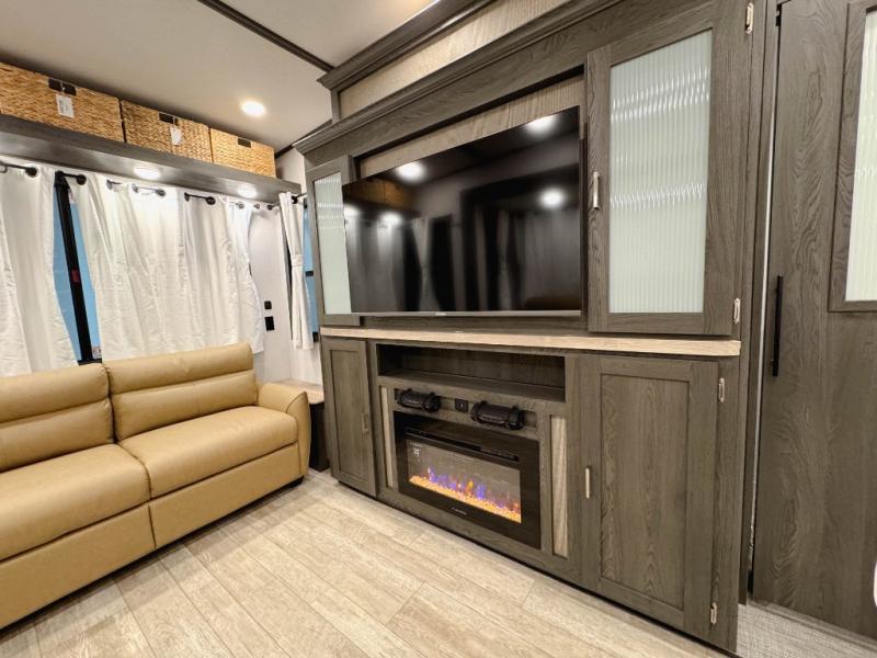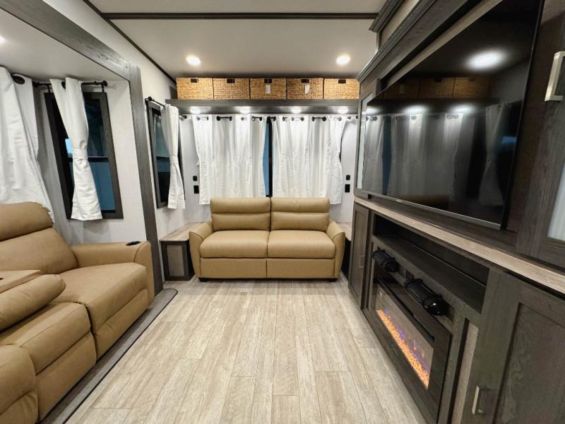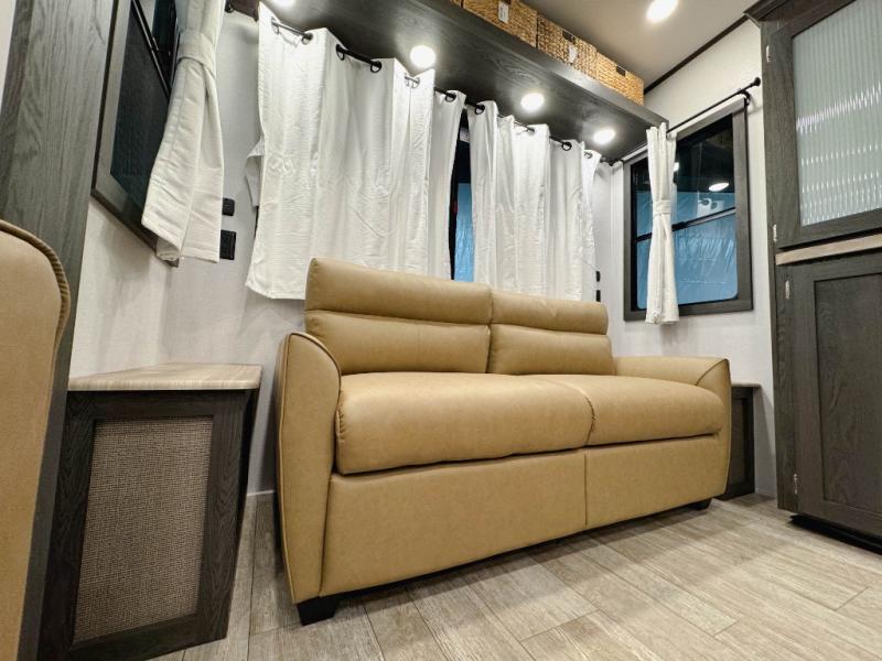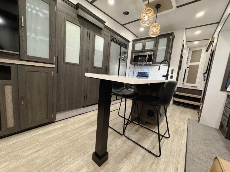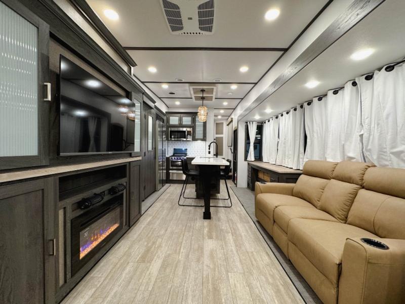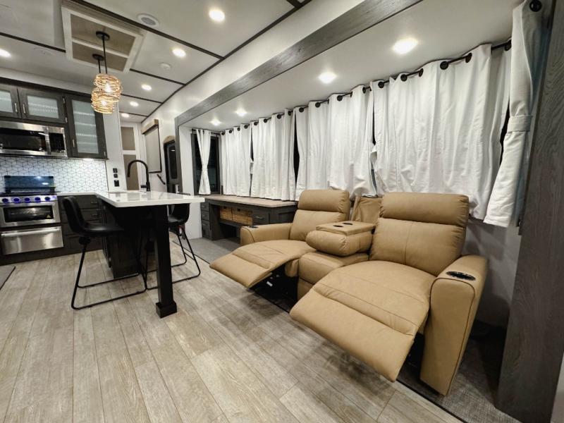 Step inside this luxurious fifth wheel that can sleep five each night! The rear tri-fold hide-a-bed sofa and theater seating provide a relaxing evening by the entertainment center with a 55" TV. Next to the entertainment center is a hidden door with cabinets and 16 cu. ft. 12V refrigerator, and a 36" x 74" flip-down bunk with storage. The kitchen has plenty of countertop space to prepare your best home cooked meals and an island with four bar stools to enjoy your meals. You also have a desk with storage to get some work done if needed. As you walk up the floating steps, you will notice the full bathroom to your left with a walk-in shower with a skylight for added natural lighting and a dual sink vanity for two to get ready at once. The front private bedroom has a king bed with Versa Tilt technology slide, a dresser next to a bench and a front wardrobe that is prepped for a washer and dryer!