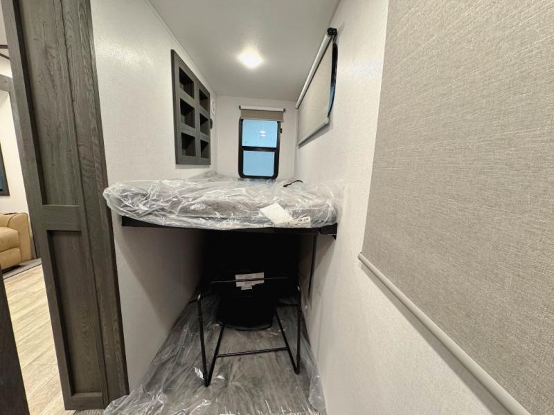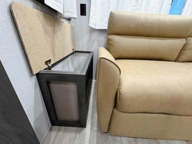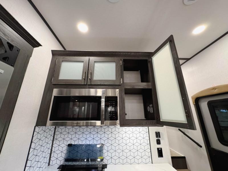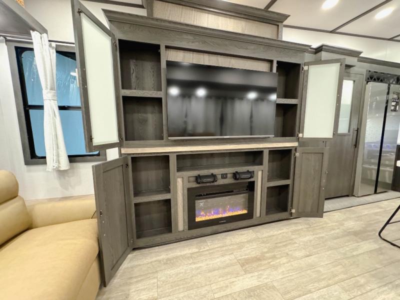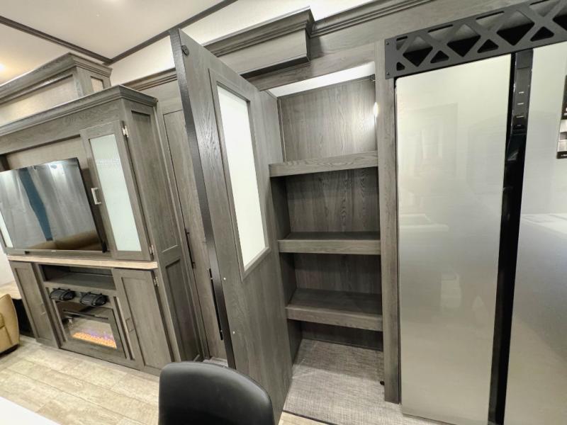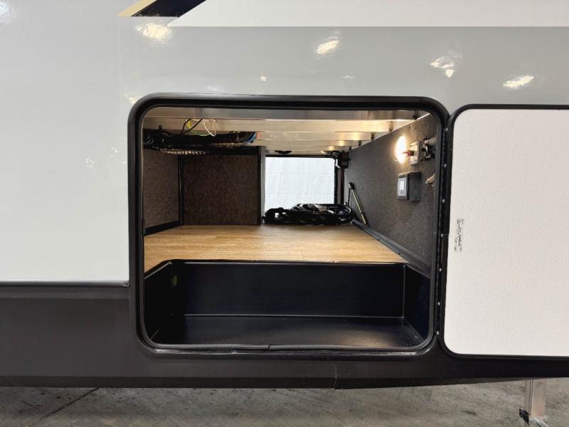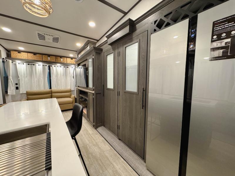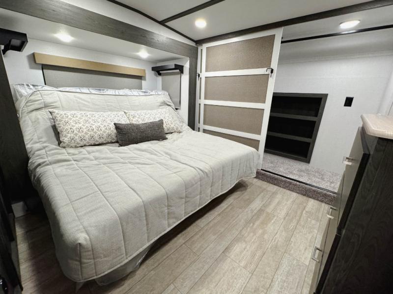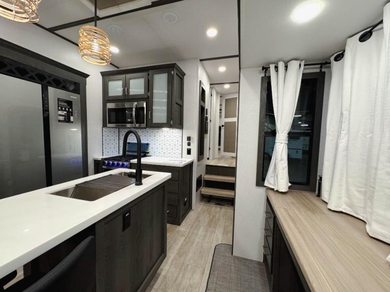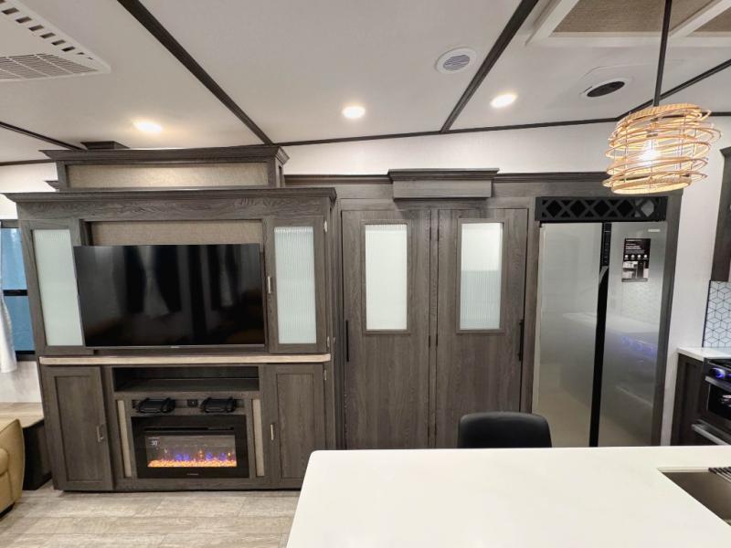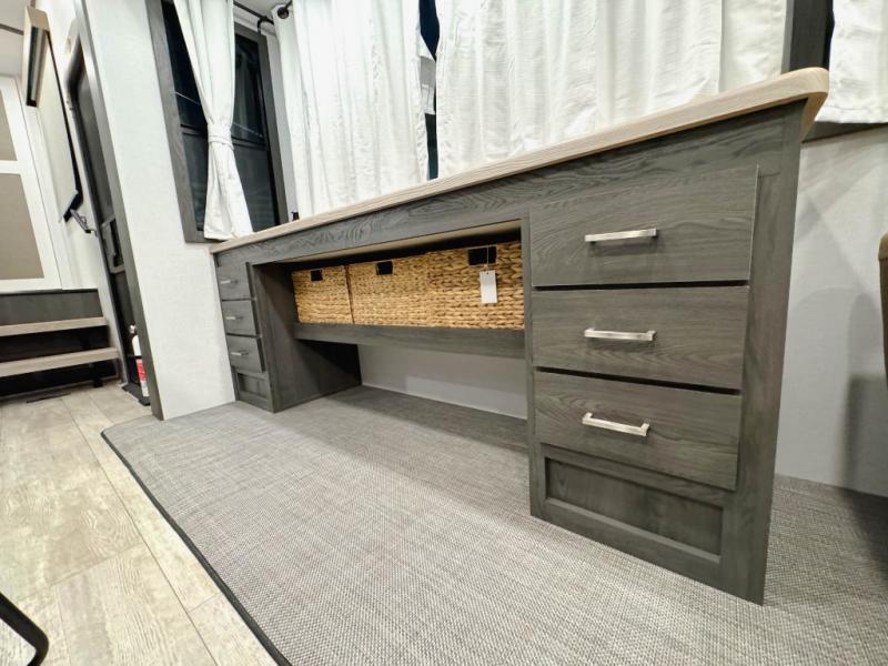 Step inside this luxurious fifth wheel that can sleep five each night! The rear tri-fold hide-a-bed sofa and theater seating provide a relaxing evening by the entertainment center with a 55" TV. Next to the entertainment center is a hidden door with cabinets and 16 cu. ft. 12V refrigerator, and a 36" x 74" flip-down bunk with storage. The kitchen has plenty of countertop space to prepare your best home cooked meals and an island with four bar stools to enjoy your meals. You also have a desk with storage to get some work done if needed. As you walk up the floating steps, you will notice the full bathroom to your left with a walk-in shower with a skylight for added natural lighting and a dual sink vanity for two to get ready at once. The front private bedroom has a king bed with Versa Tilt technology slide, a dresser next to a bench and a front wardrobe that is prepped for a washer and dryer!