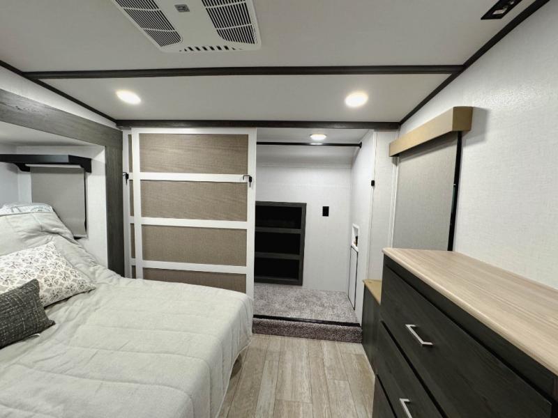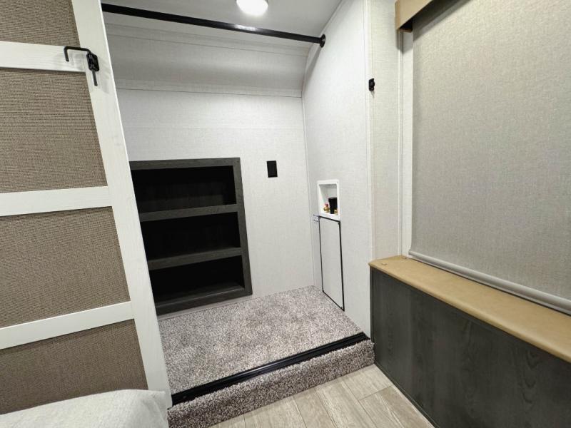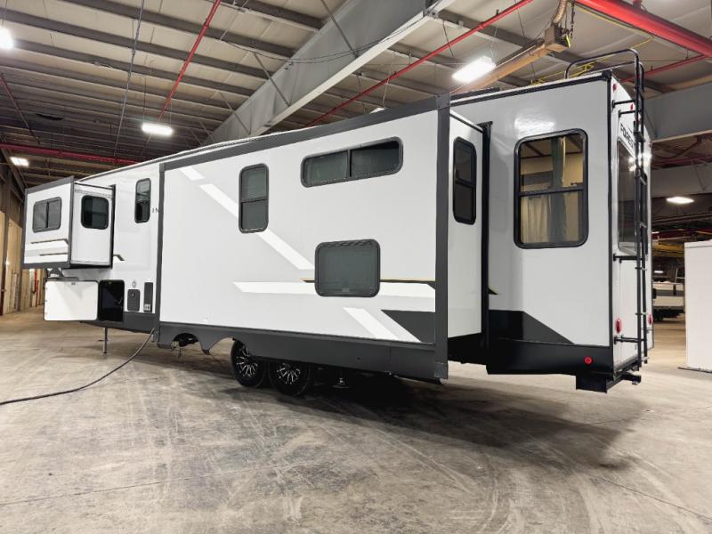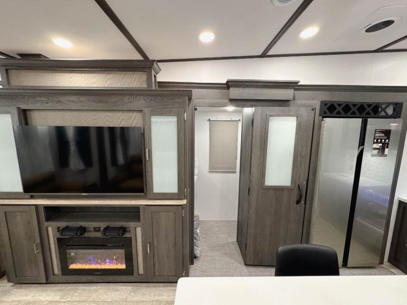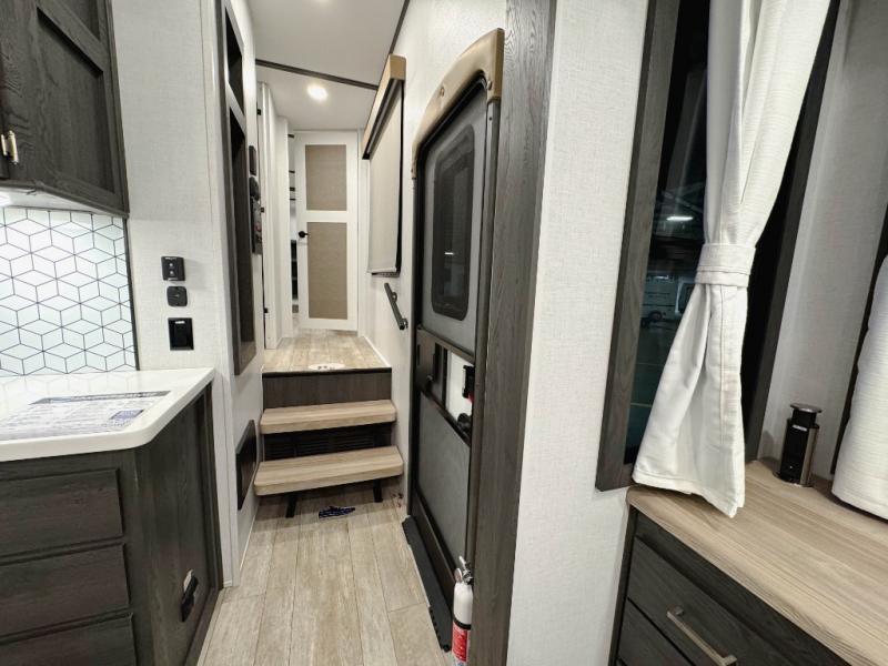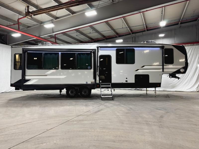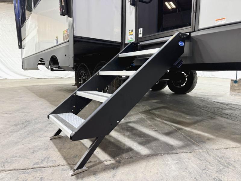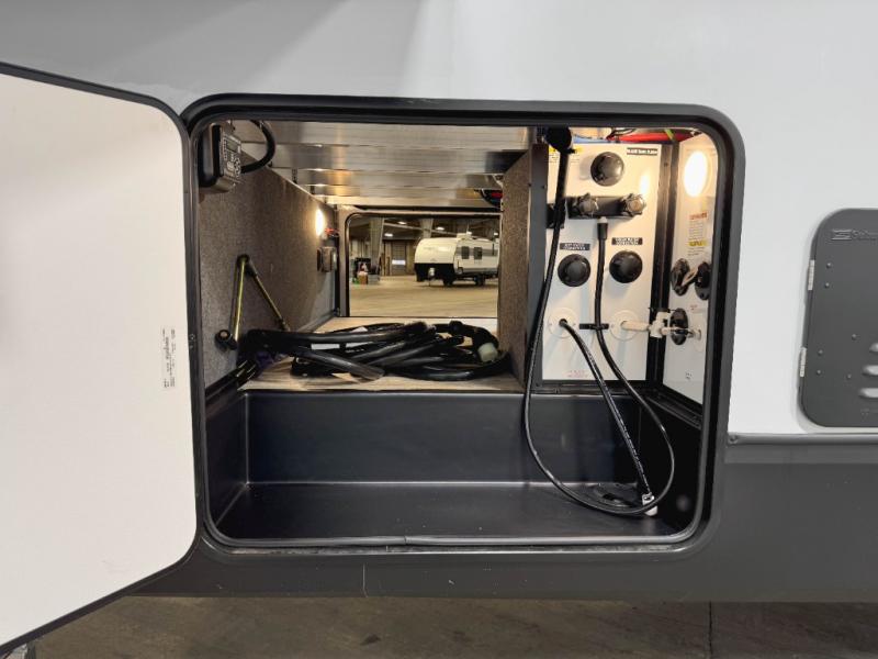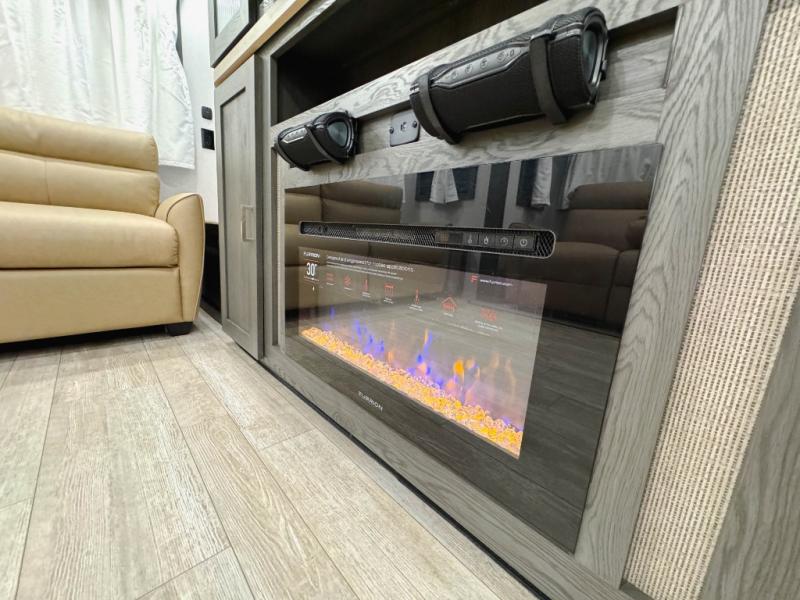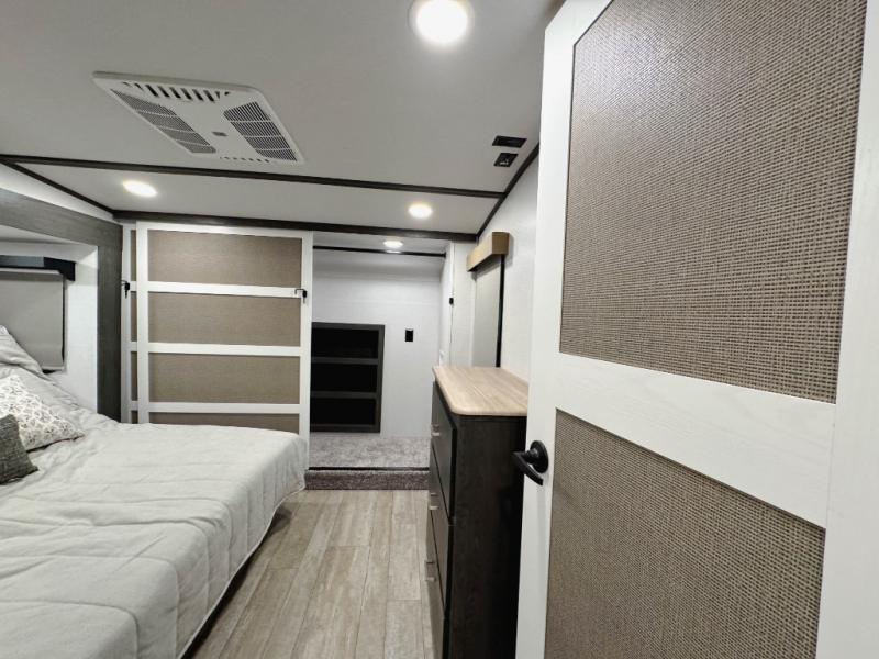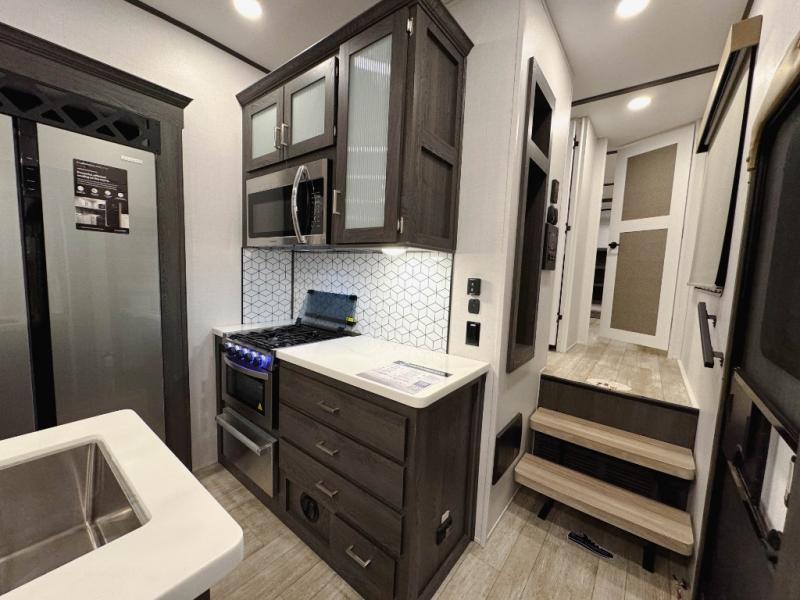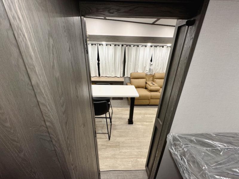Step inside this luxurious fifth wheel that can sleep five each night! The rear tri-fold hide-a-bed sofa and theater seating provide a relaxing evening by the entertainment center with a 55" TV. Next to the entertainment center is a hidden door with cabinets and 16 cu. ft. 12V refrigerator, and a 36" x 74" flip-down bunk with storage. The kitchen has plenty of countertop space to prepare your best home cooked meals and an island with four bar stools to enjoy your meals. You also have a desk with storage to get some work done if needed. As you walk up the floating steps, you will notice the full bathroom to your left with a walk-in shower with a skylight for added natural lighting and a dual sink vanity for two to get ready at once. The front private bedroom has a king bed with Versa Tilt technology slide, a dresser next to a bench and a front wardrobe that is prepped for a washer and dryer!