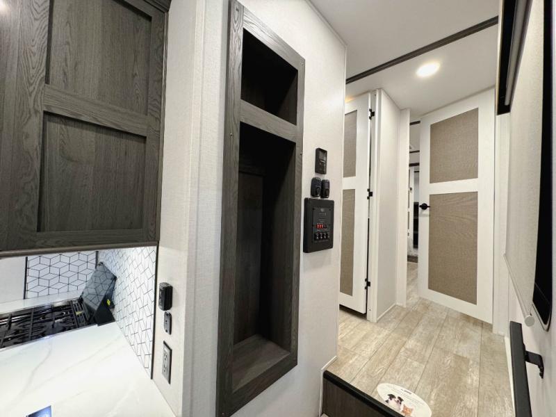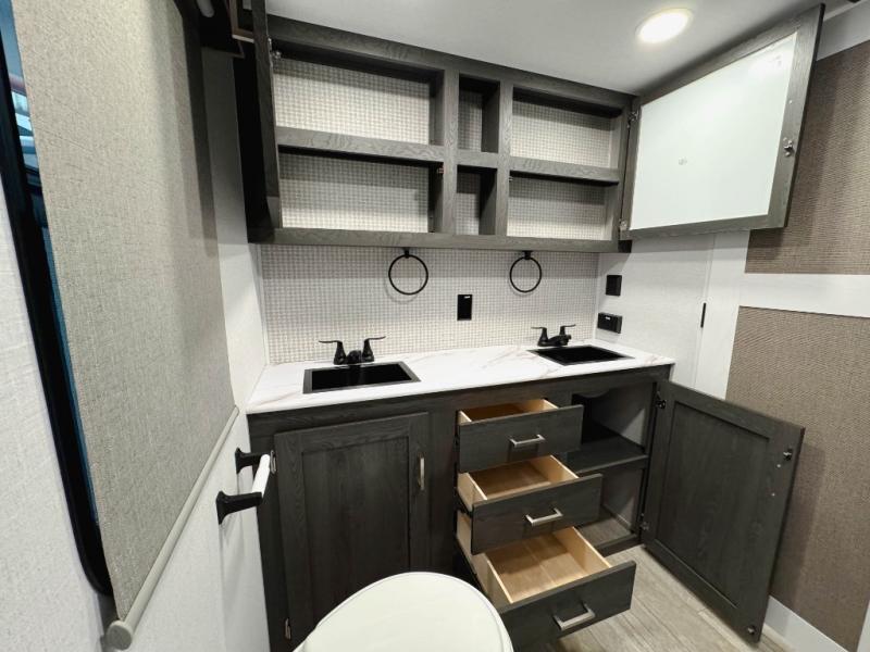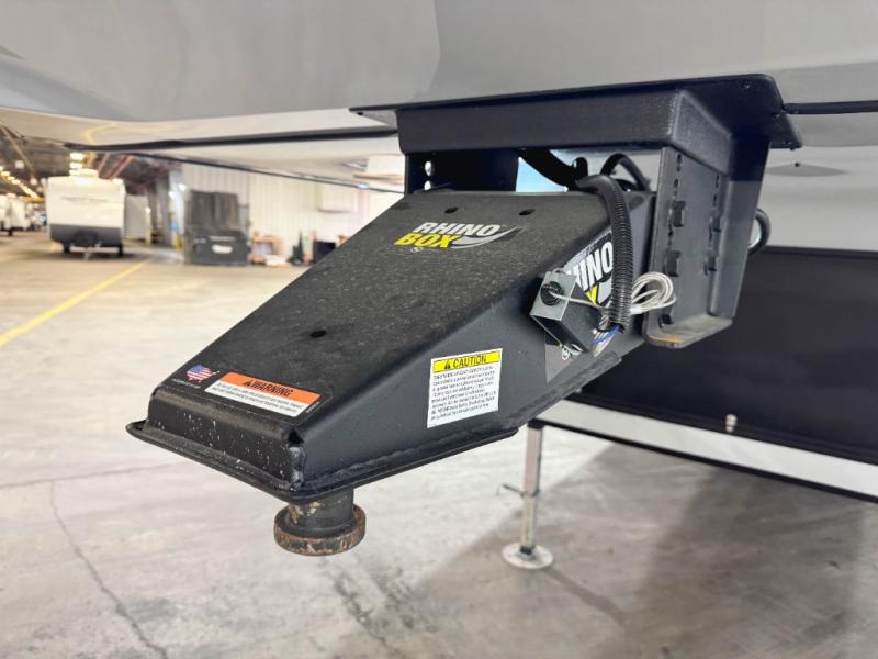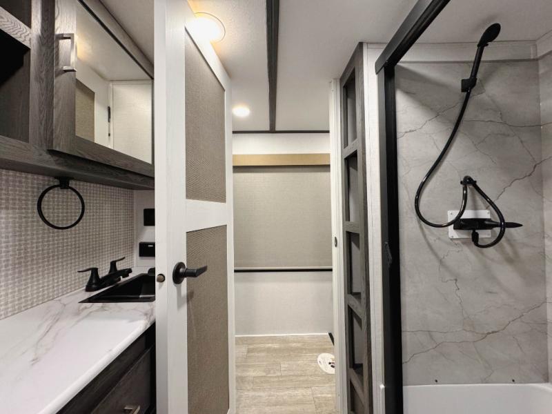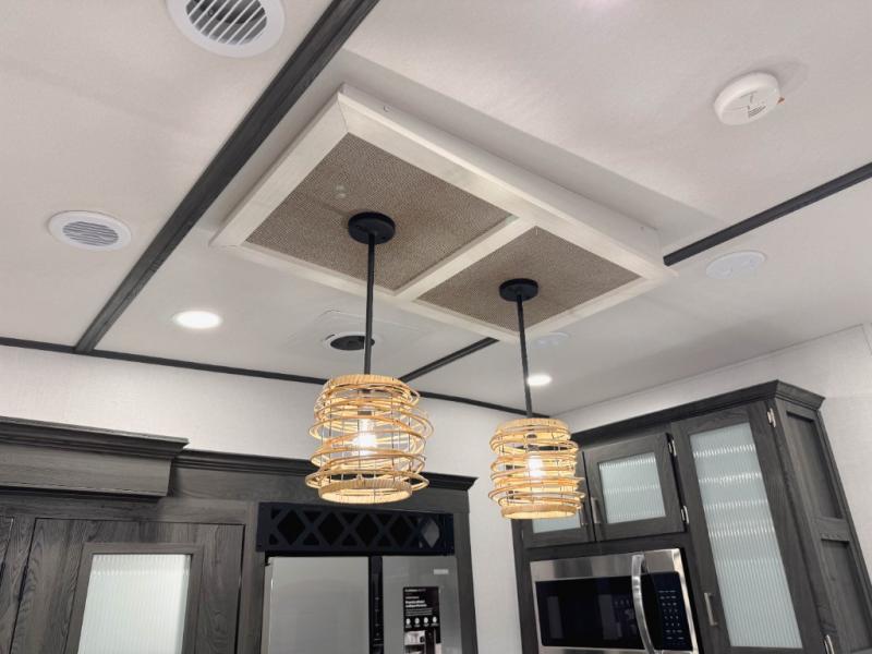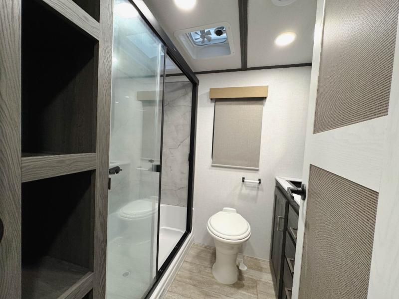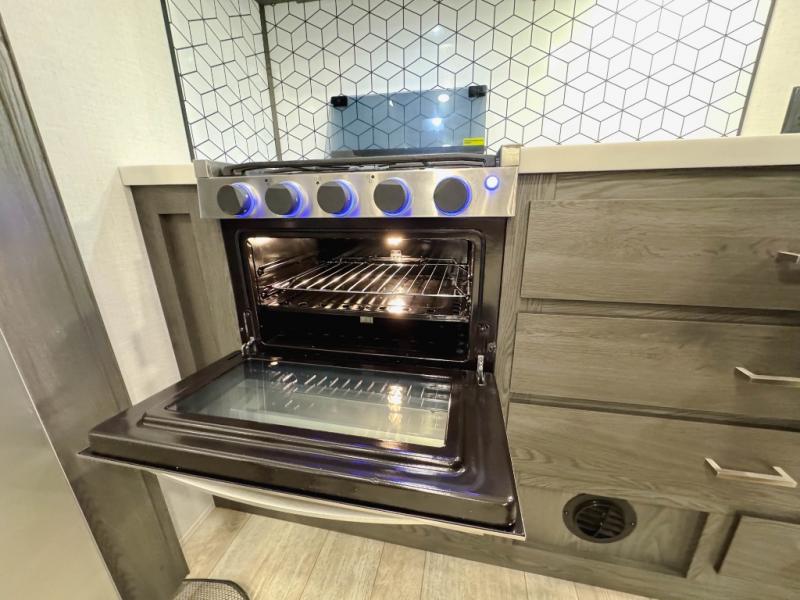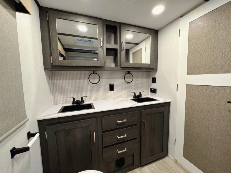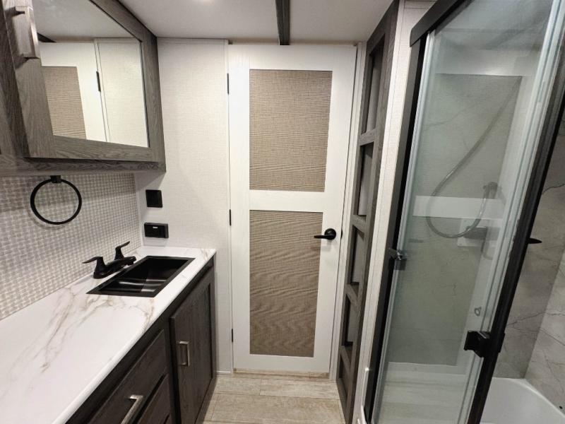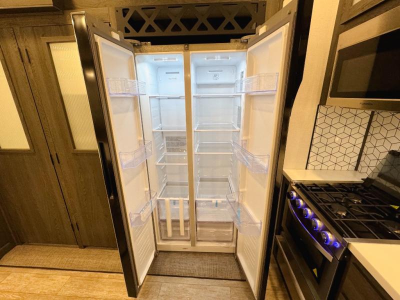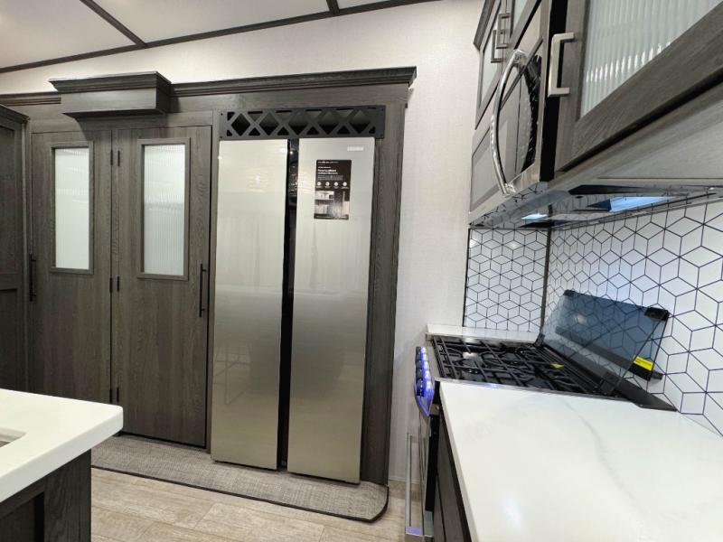 Step inside this luxurious fifth wheel that can sleep five each night! The rear tri-fold hide-a-bed sofa and theater seating provide a relaxing evening by the entertainment center with a 55" TV. Next to the entertainment center is a hidden door with cabinets and 16 cu. ft. 12V refrigerator, and a 36" x 74" flip-down bunk with storage. The kitchen has plenty of countertop space to prepare your best home cooked meals and an island with four bar stools to enjoy your meals. You also have a desk with storage to get some work done if needed. As you walk up the floating steps, you will notice the full bathroom to your left with a walk-in shower with a skylight for added natural lighting and a dual sink vanity for two to get ready at once. The front private bedroom has a king bed with Versa Tilt technology slide, a dresser next to a bench and a front wardrobe that is prepped for a washer and dryer!