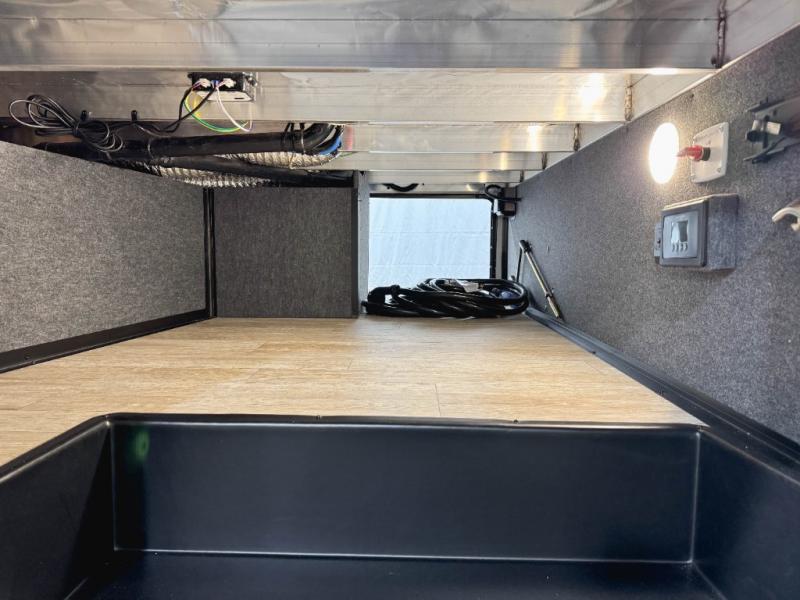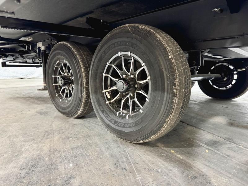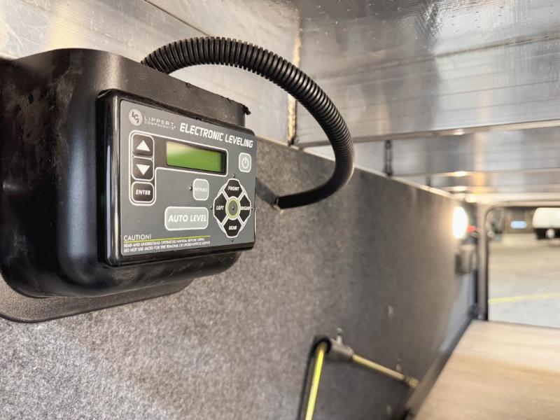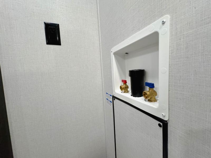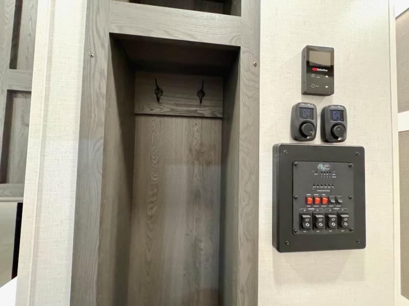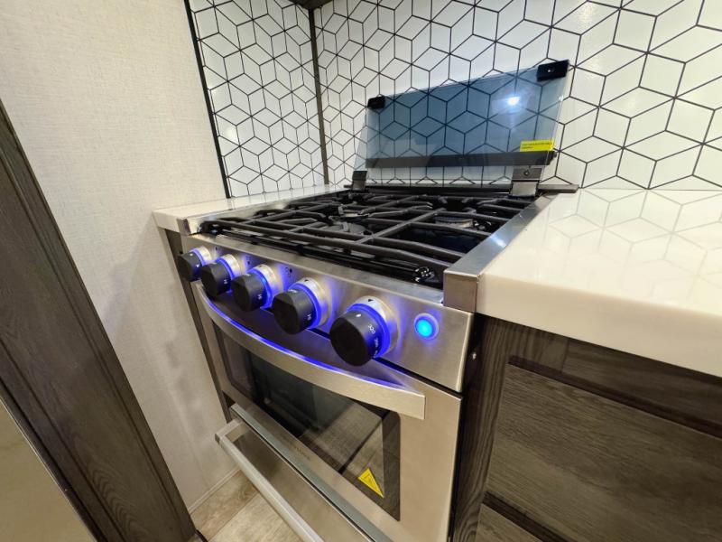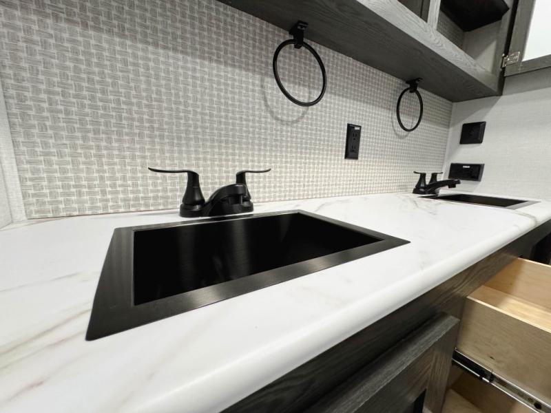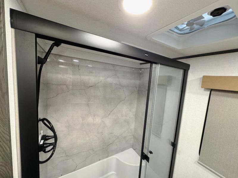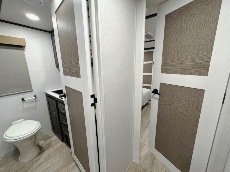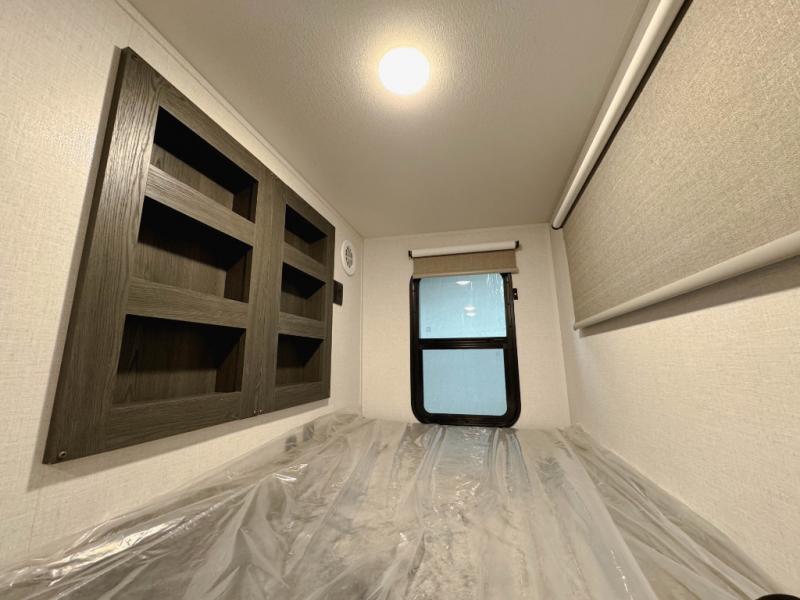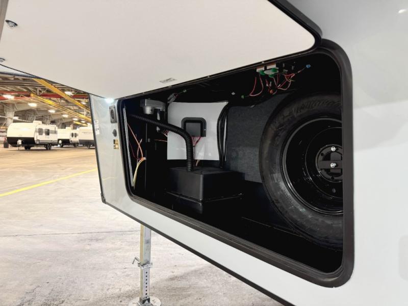 Step inside this luxurious fifth wheel that can sleep five each night! The rear tri-fold hide-a-bed sofa and theater seating provide a relaxing evening by the entertainment center with a 55" TV. Next to the entertainment center is a hidden door with cabinets and 16 cu. ft. 12V refrigerator, and a 36" x 74" flip-down bunk with storage. The kitchen has plenty of countertop space to prepare your best home cooked meals and an island with four bar stools to enjoy your meals. You also have a desk with storage to get some work done if needed. As you walk up the floating steps, you will notice the full bathroom to your left with a walk-in shower with a skylight for added natural lighting and a dual sink vanity for two to get ready at once. The front private bedroom has a king bed with Versa Tilt technology slide, a dresser next to a bench and a front wardrobe that is prepped for a washer and dryer!