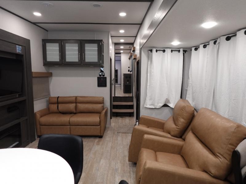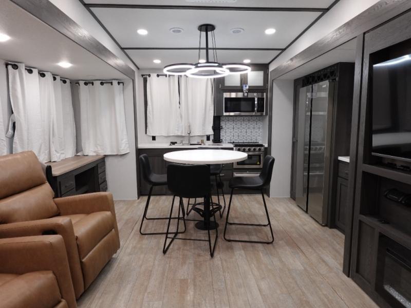 It's easy to see why this fifth wheel was voted Best New Model for 2025 by RV Pro! There are many residential features, such as a middle table with four seats, dual recliners, a desk to get some work done, and a master bedroom you are sure to love. You'll find a king bed with Versa Tilt technology, a dresser, and TV prep. A front master bath includes a walk-in shower with a skylight, dual bath sinks with a back-lit mirror, and a closet with shelves. The middle mud room includes washer/dryer prep, counter space and a pull-out drying rack to hang up swim clothes, towels, and more. Everyone will enjoy spending time in the main living room that includes dual opposing slides, a tri-fold sofa, and an entertainment center with hidden storage behind. And the chef of your group will love the rear kitchen with its 16 cu. ft. 12V refrigerator and pantry, an oven, and plenty of counter space. Head outdoors to enjoy the two power awnings in the evening!