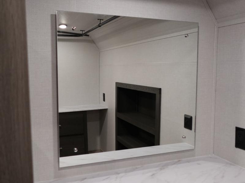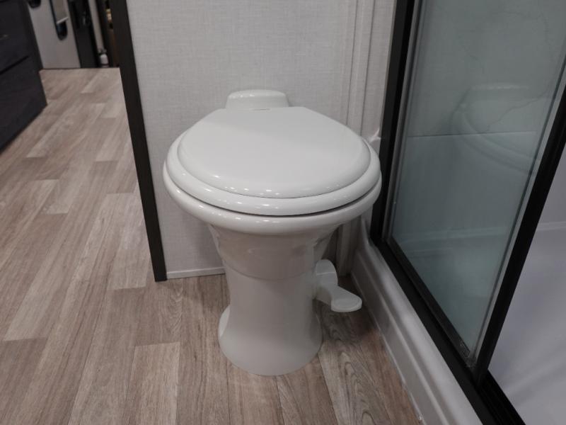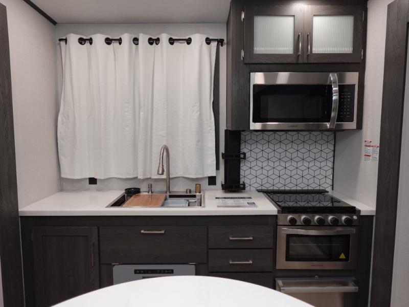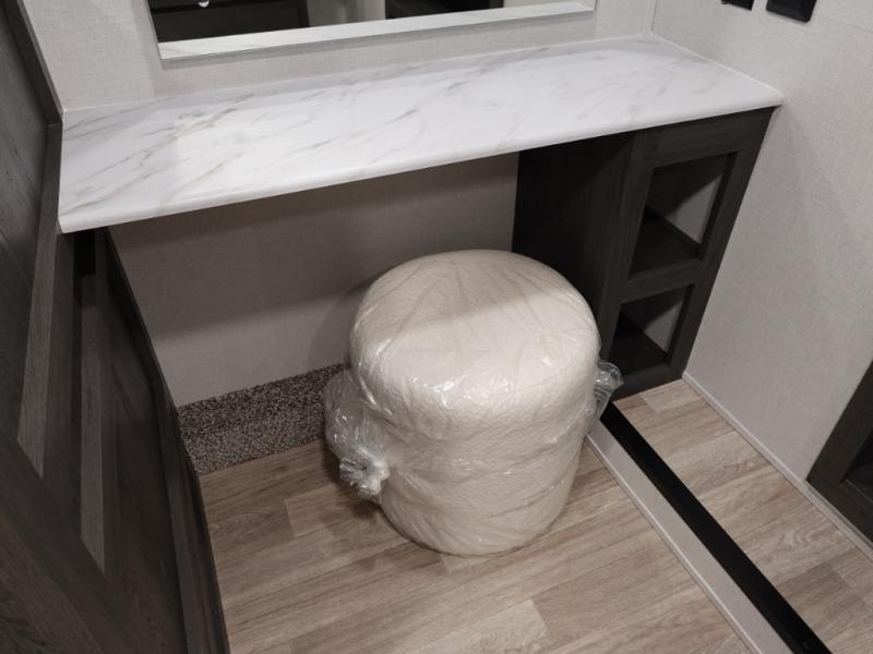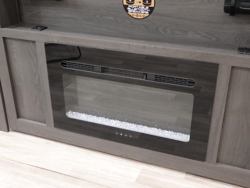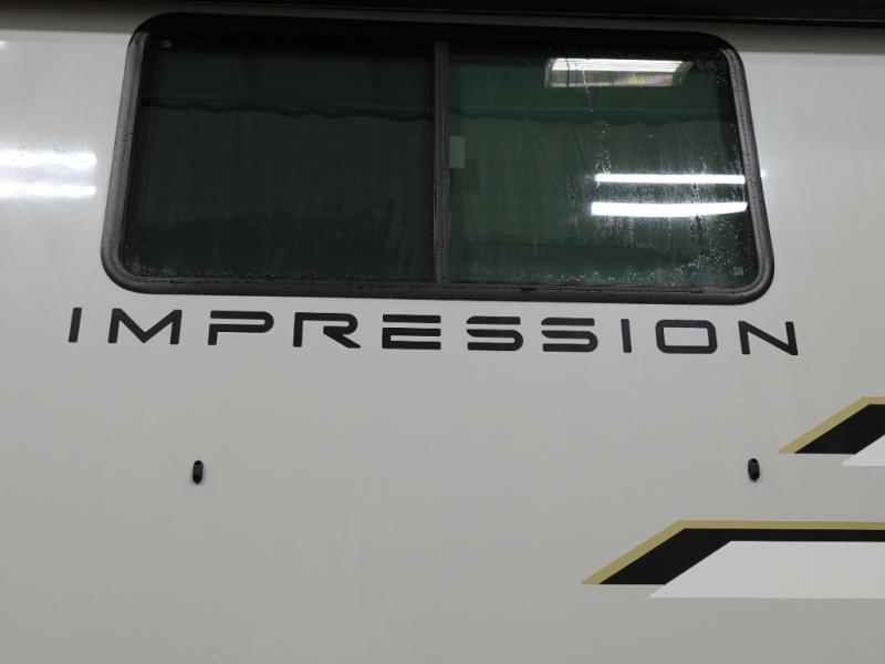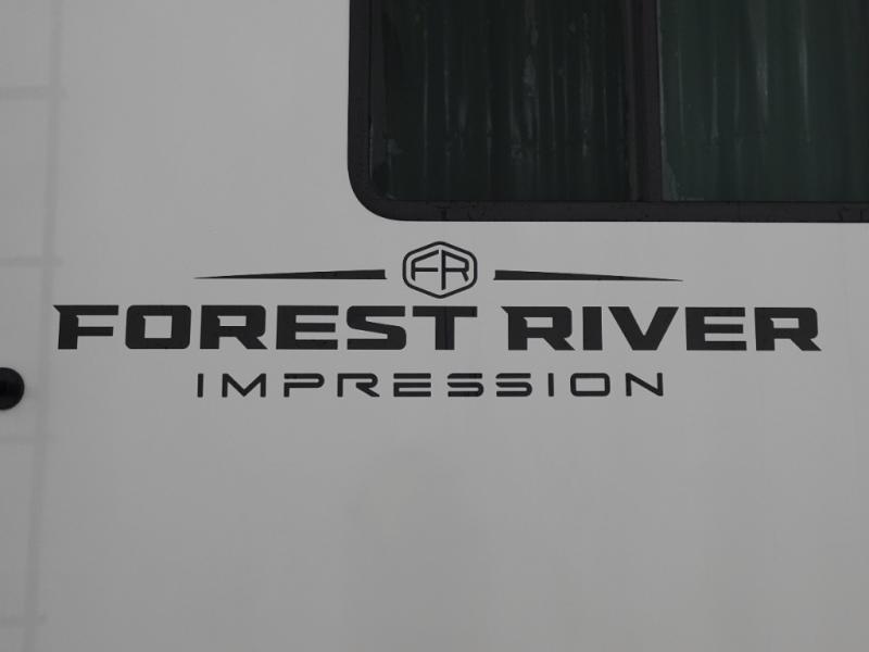 With any Impression mid-profile fifth wheel by Forest River, the focus of the design is comfort and value, built with quality craftsmanship and attention to customer's desires in each Impression! The exterior includes upgraded E-rated MAXXIS tires, custom exterior graphics package, and insulated slam latch baggage doors. There is also an enclosed docking station, an outside shower, and a 100W roof solar panel for off-grid capabilities. The fully heated and enclosed AccessiBelly has removable underbelly panels and offers four seasons of travel, and there is an industry leading 15K A/C plus 35K BTU furnace to keep you comfortable. The interior has lumbercore cabinetry, residential linoleum, residential backsplash in the kitchen, and oversized opening windows in the living area for more natural lighting and good air flow.