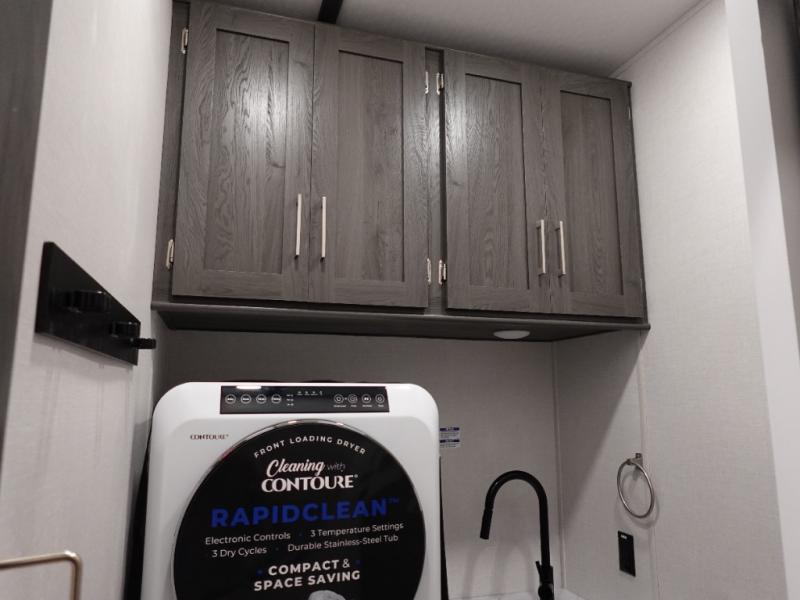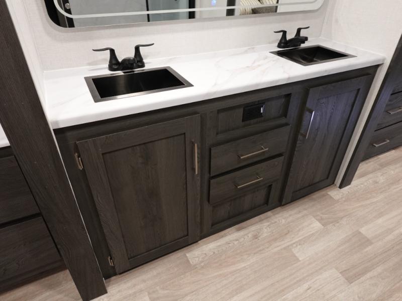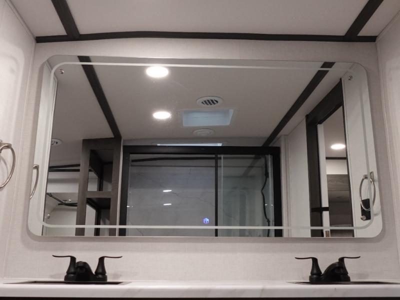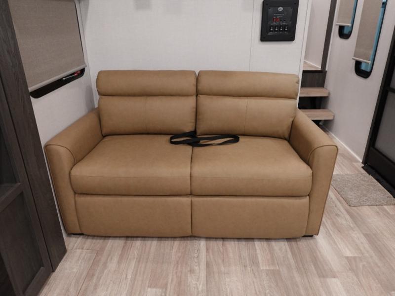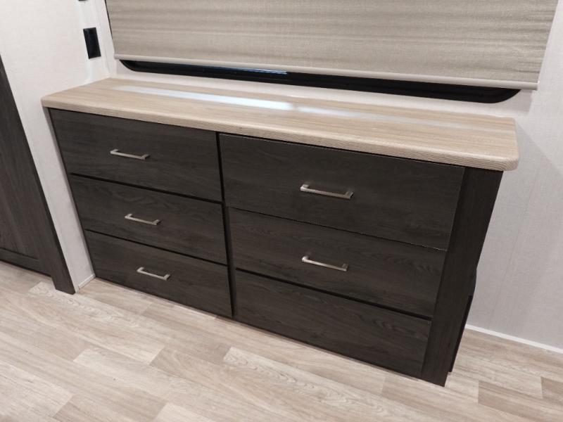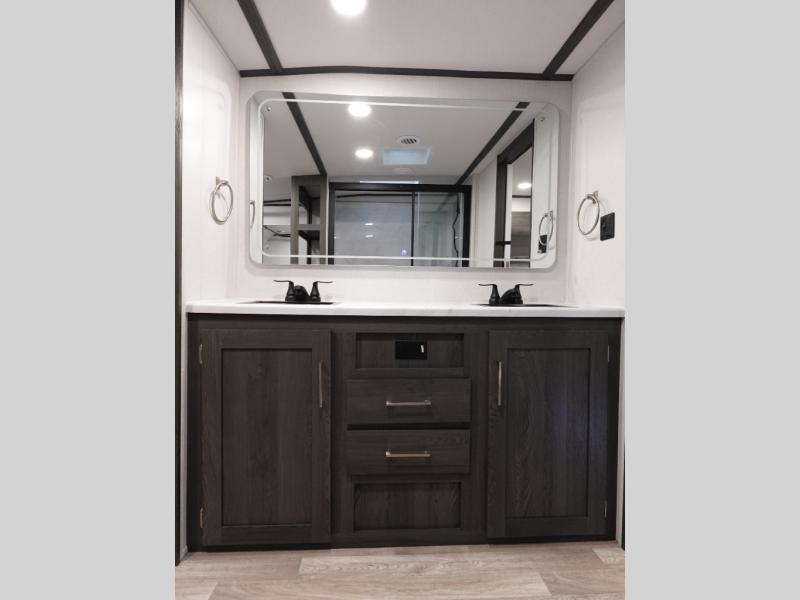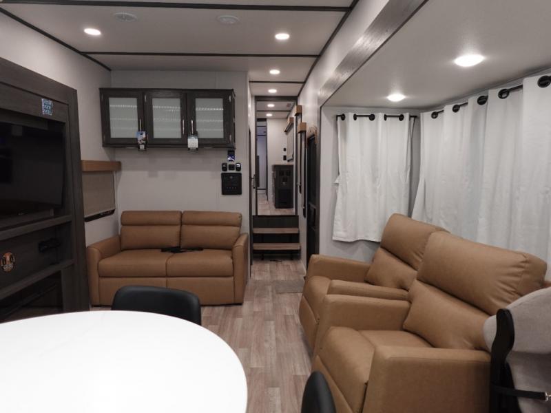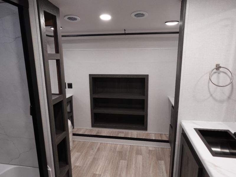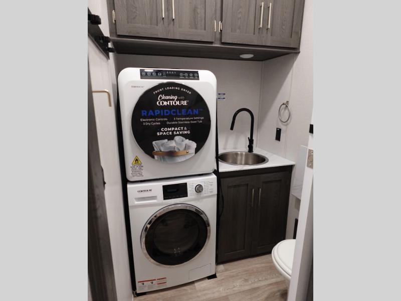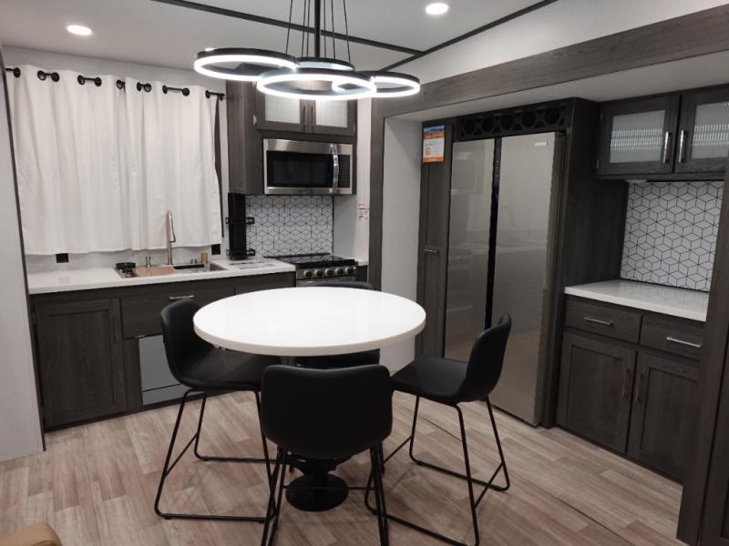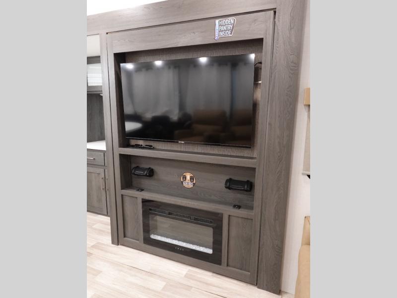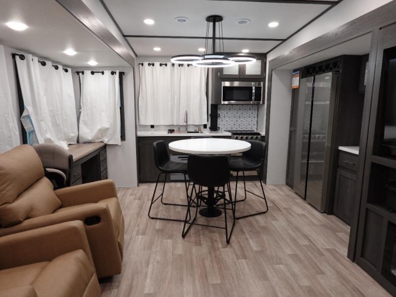 It's easy to see why this fifth wheel was voted Best New Model for 2025 by RV Pro! There are many residential features, such as a middle table with four seats, dual recliners, a desk to get some work done, and a master bedroom you are sure to love. You'll find a king bed with Versa Tilt technology, a dresser, and TV prep. A front master bath includes a walk-in shower with a skylight, dual bath sinks with a back-lit mirror, and a closet with shelves. The middle mud room includes washer/dryer, counter space and a pull-out drying rack to hang up swim clothes, towels, and more. Everyone will enjoy spending time in the main living room that includes dual opposing slides, a tri-fold sofa, and an entertainment center with hidden storage behind. And the chef of your group will love the rear kitchen with its 16 cu. ft. 12V refrigerator and pantry, an oven, and plenty of counter space. Head outdoors to enjoy the two power awnings in the evening!