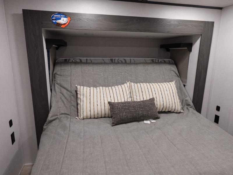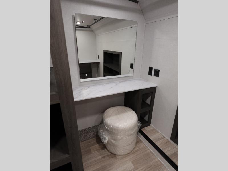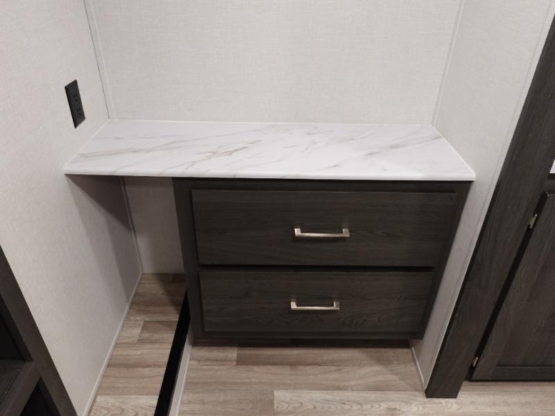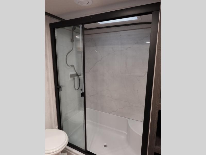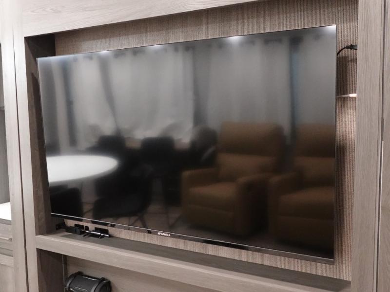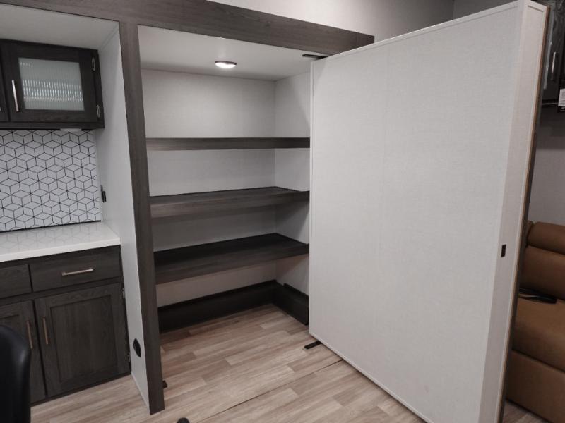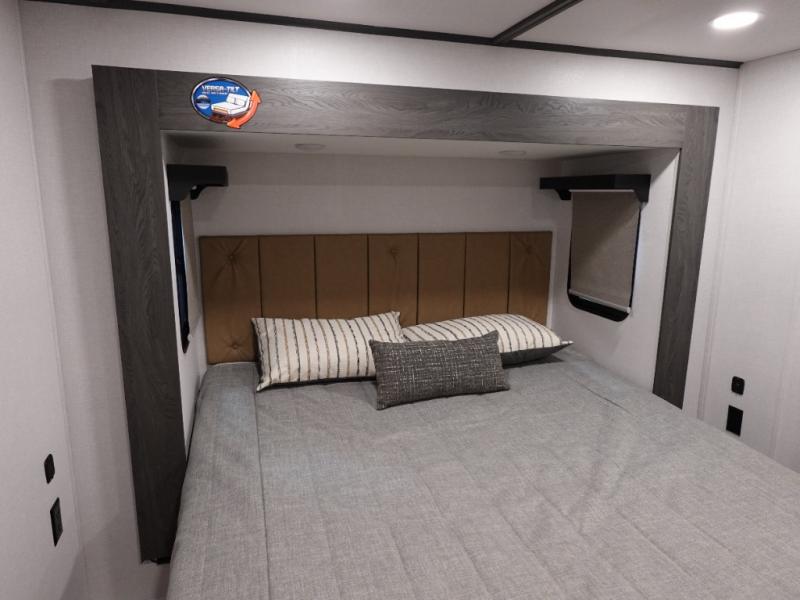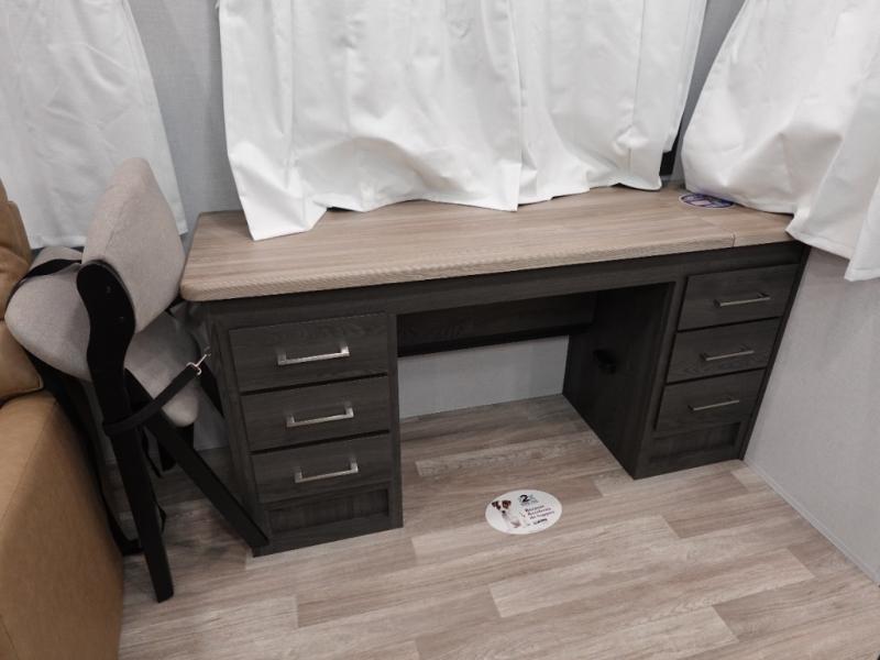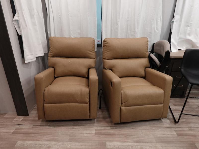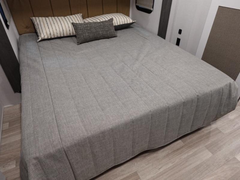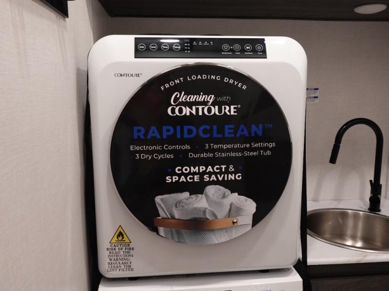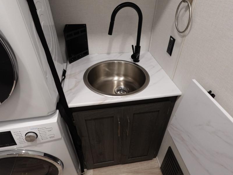 It's easy to see why this fifth wheel was voted Best New Model for 2025 by RV Pro! There are many residential features, such as a middle table with four seats, dual recliners, a desk to get some work done, and a master bedroom you are sure to love. You'll find a king bed with Versa Tilt technology, a dresser, and TV prep. A front master bath includes a walk-in shower with a skylight, dual bath sinks with a back-lit mirror, and a closet with shelves. The middle mud room includes washer/dryer, counter space and a pull-out drying rack to hang up swim clothes, towels, and more. Everyone will enjoy spending time in the main living room that includes dual opposing slides, a tri-fold sofa, and an entertainment center with hidden storage behind. And the chef of your group will love the rear kitchen with its 16 cu. ft. 12V refrigerator and pantry, an oven, and plenty of counter space. Head outdoors to enjoy the two power awnings in the evening!