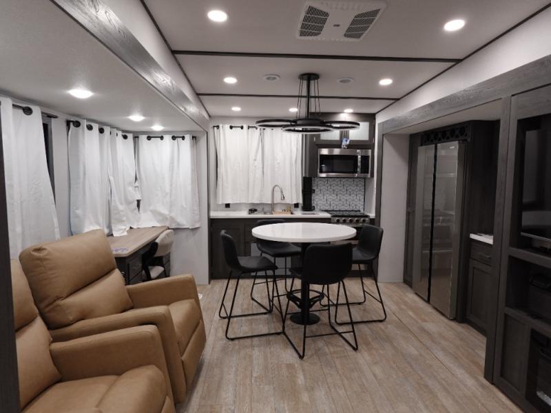 It's easy to see why this fifth wheel was voted Best New Model for 2025 by RV Pro! There are many residential features, such as a middle table with four seats, dual recliners, a desk to get some work done, and a master bedroom you are sure to love. You'll find a king bed with Versa Tilt technology, a dresser, and TV prep. A front master bath includes a walk-in shower with a skylight, dual bath sinks with a back-lit mirror, and a closet with shelves. The middle mud room includes washer/dryer prep, counter space and a pull-out drying rack to hang up swim clothes, towels, and more. Everyone will enjoy spending time in the main living room that includes dual opposing slides, a tri-fold sofa, and an entertainment center with hidden storage behind. And the chef of your group will love the rear kitchen with its 16 cu. ft. 12V refrigerator and pantry, an oven, and plenty of counter space. Head outdoors to enjoy the two power awnings in the evening!