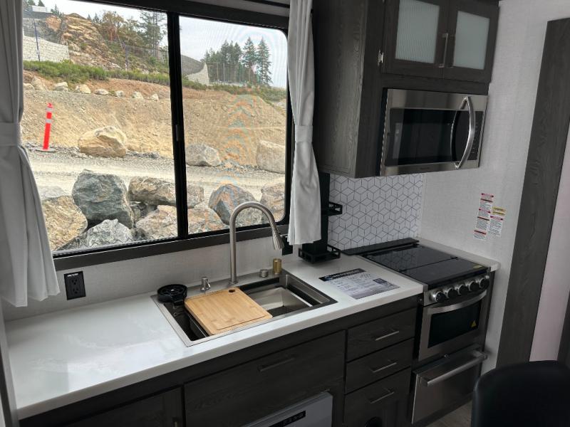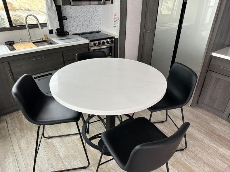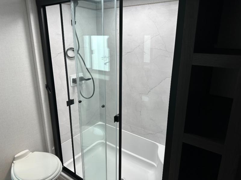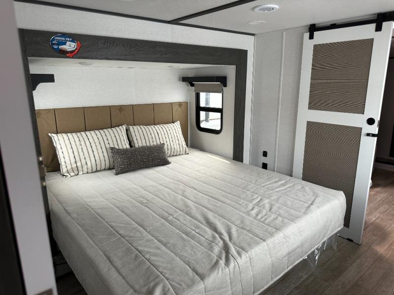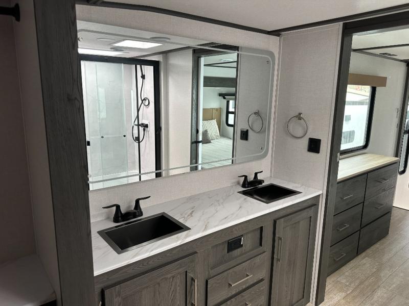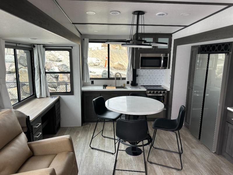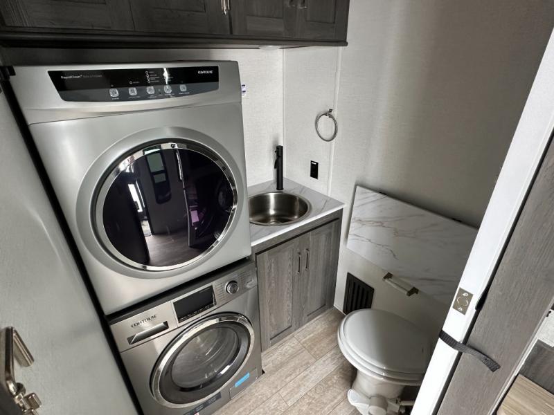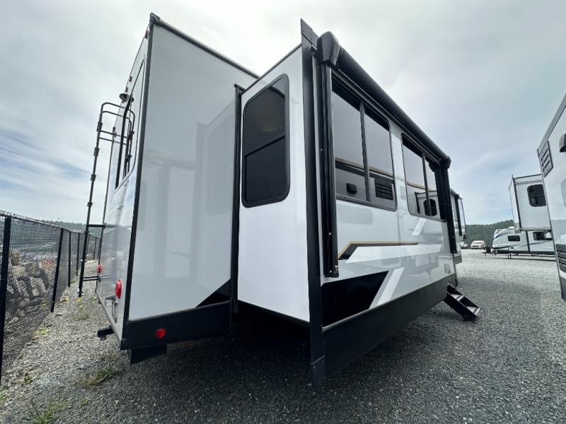 It's easy to see why this fifth wheel was voted Best New Model for 2025 by RV Pro! There are many residential features, such as a middle table with four seats, dual recliners, a desk to get some work done, and a master bedroom you are sure to love. You'll find a king bed with Versa Tilt technology, a dresser, and TV prep. A front master bath includes a walk-in shower with a skylight, dual bath sinks with a back-lit mirror, and a closet with shelves. The middle mud room includes washer/dryer prep, counter space and a pull-out drying rack to hang up swim clothes, towels, and more. Everyone will enjoy spending time in the main living room that includes dual opposing slides, a tri-fold sofa, and an entertainment center with hidden storage behind. And the chef of your group will love the rear kitchen with its 16 cu. ft. 12V refrigerator and pantry, an oven, and plenty of counter space. Head outdoors to enjoy the two power awnings in the evening!