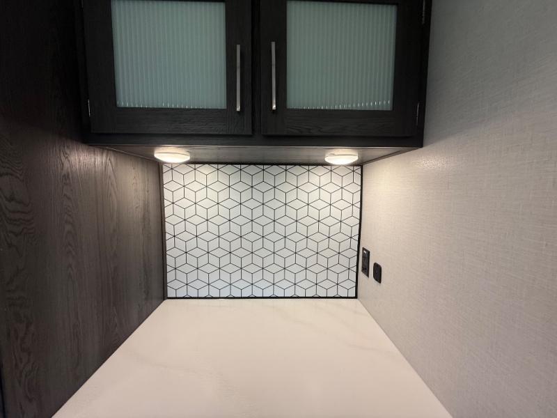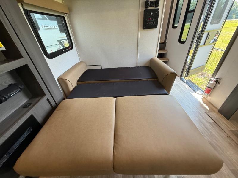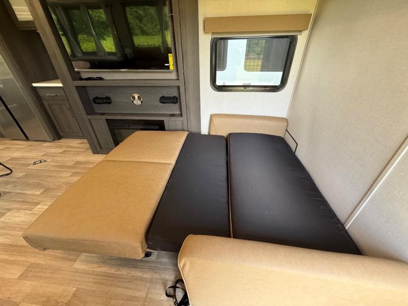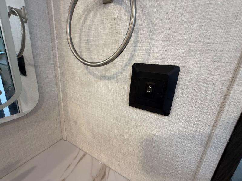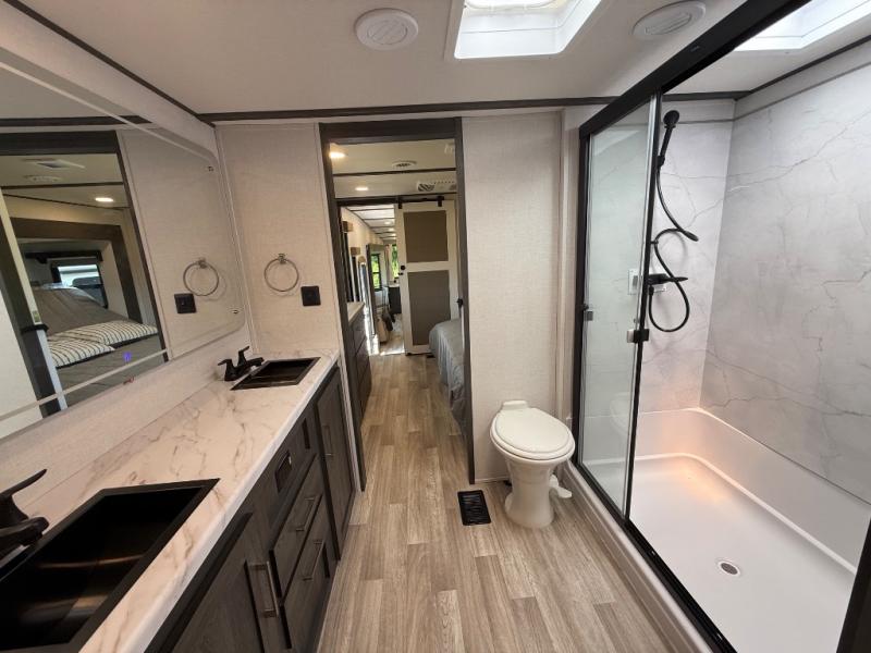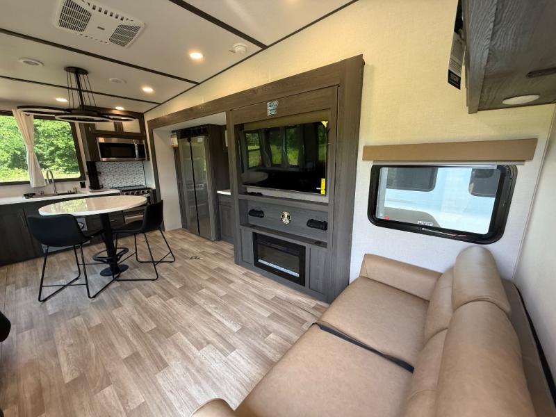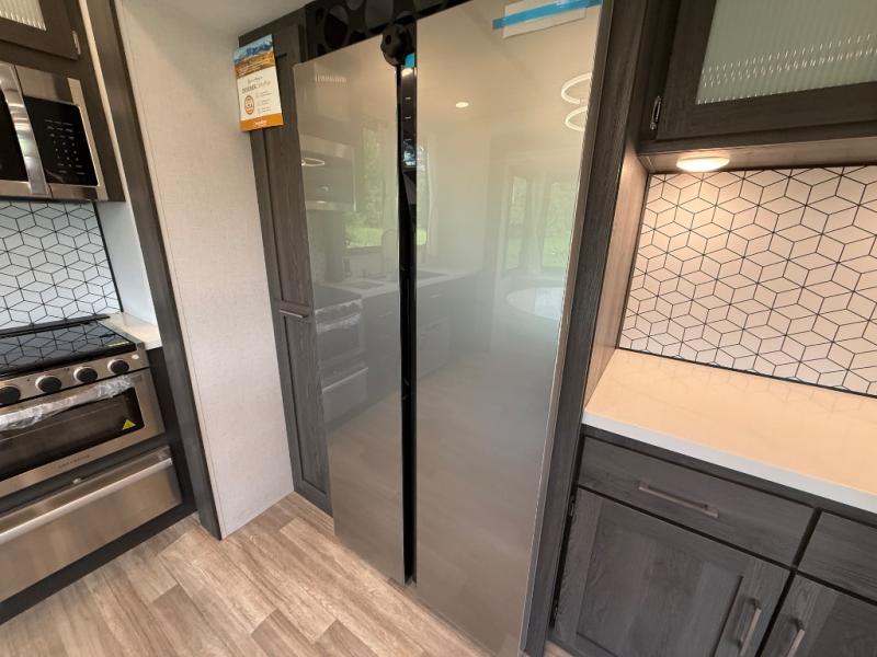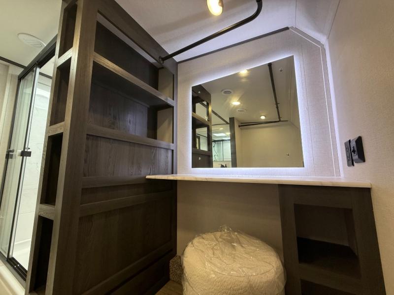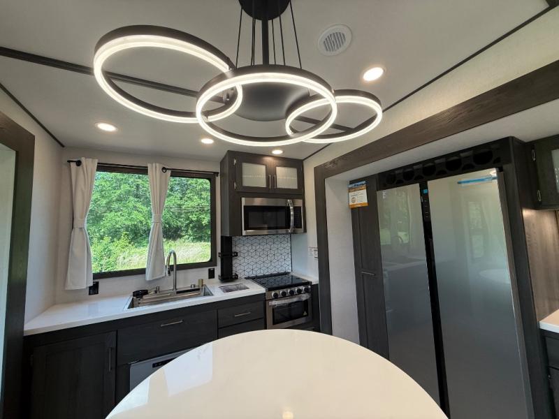 It's easy to see why this fifth wheel was voted Best New Model for 2025 by RV Pro! There are many residential features, such as a middle table with four seats, dual recliners, a desk to get some work done, and a master bedroom you are sure to love. You'll find a king bed with Versa Tilt technology, a dresser, and TV prep. A front master bath includes a walk-in shower with a skylight, dual bath sinks with a back-lit mirror, and a closet with shelves. The middle mud room includes washer/dryer prep, counter space and a pull-out drying rack to hang up swim clothes, towels, and more. Everyone will enjoy spending time in the main living room that includes dual opposing slides, a tri-fold sofa, and an entertainment center with hidden storage behind. And the chef of your group will love the rear kitchen with its 16 cu. ft. 12V refrigerator and pantry, an oven, and plenty of counter space. Head outdoors to enjoy the two power awnings in the evening!