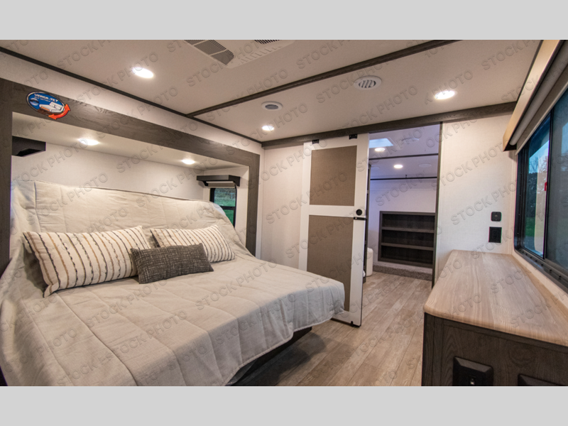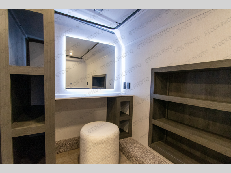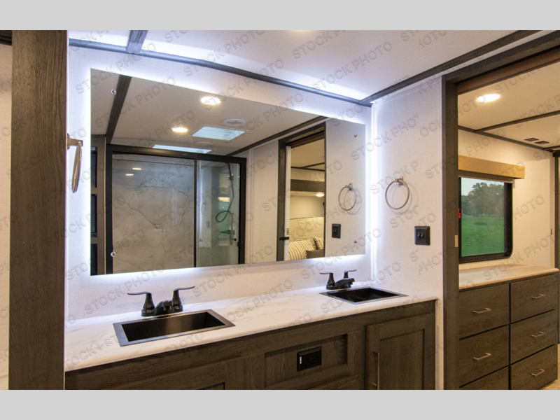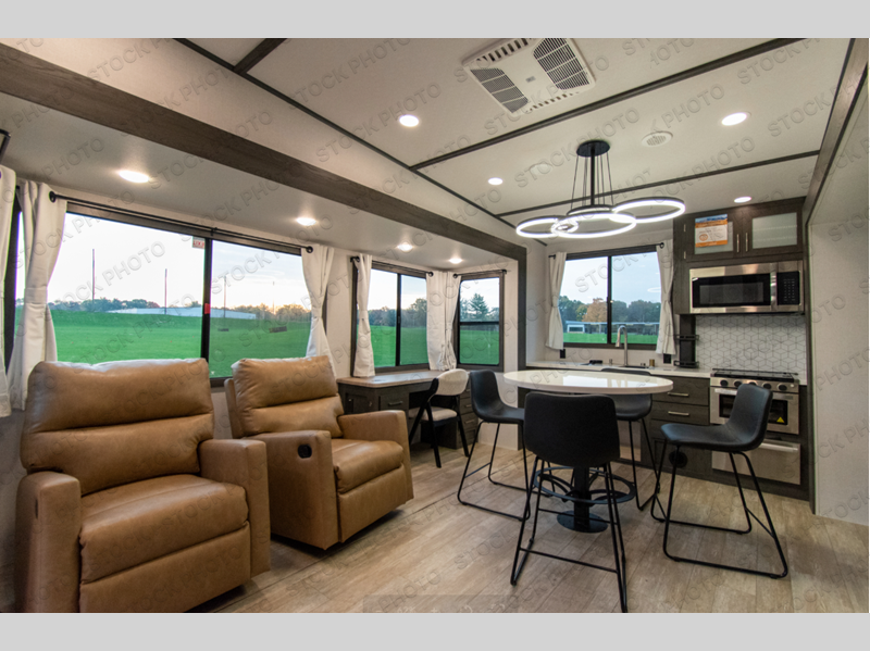 It's easy to see why this fifth wheel was voted Best New Model for 2025 by RV Pro! There are many residential features, such as a middle table with four seats, dual recliners, a desk to get some work done, and a master bedroom you are sure to love. You'll find a king bed with Versa Tilt technology, a dresser, and TV prep. A front master bath includes a walk-in shower with a skylight, dual bath sinks with a back-lit mirror, and a closet with shelves. The middle mud room includes washer/dryer prep, counter space and a pull-out drying rack to hang up swim clothes, towels, and more. Everyone will enjoy spending time in the main living room that includes dual opposing slides, a tri-fold sofa, and an entertainment center with hidden storage behind. And the chef of your group will love the rear kitchen with its 16 cu. ft. 12V refrigerator and pantry, an oven, and plenty of counter space. Head outdoors to enjoy the two power awnings in the evening!