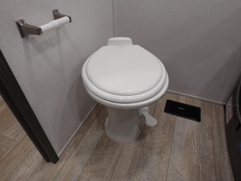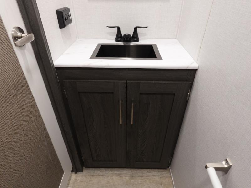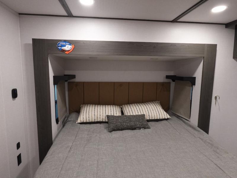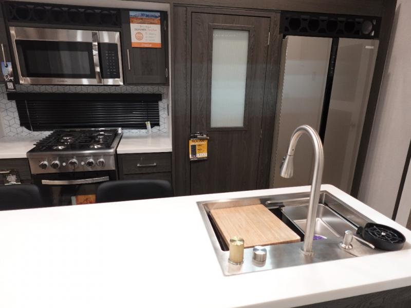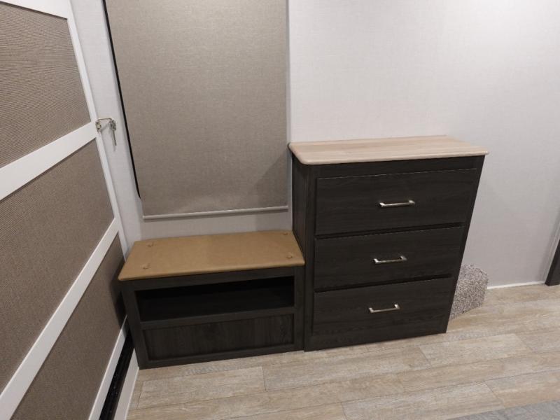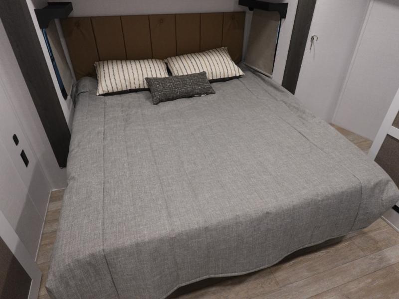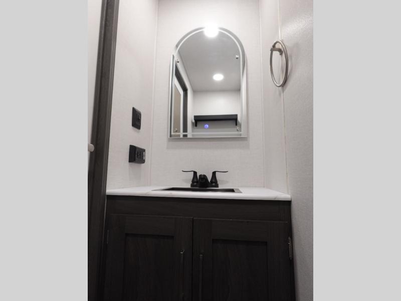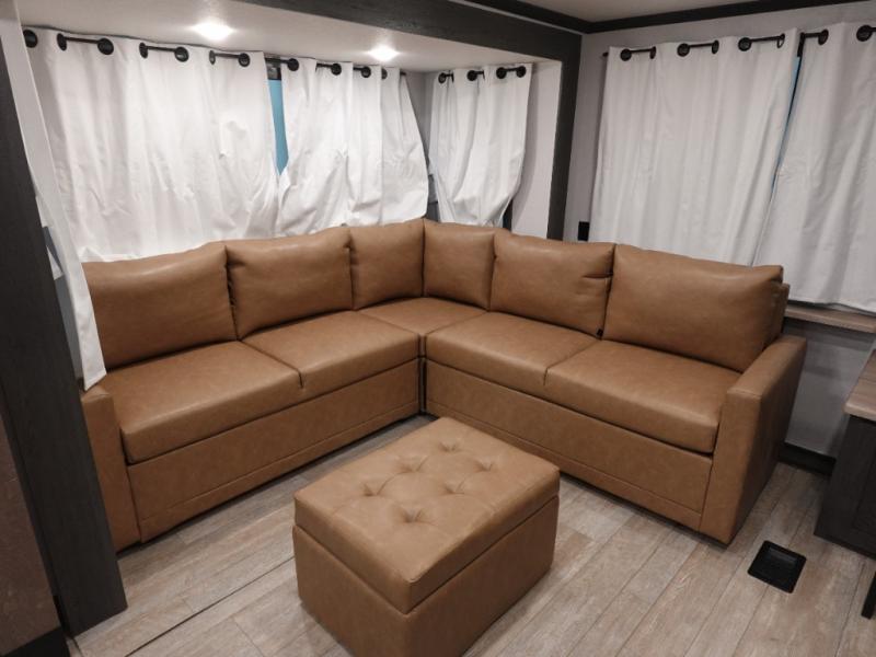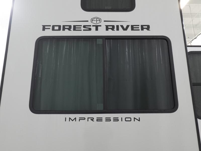 With any Impression mid-profile fifth wheel by Forest River, the focus of the design is comfort and value, built with quality craftsmanship and attention to customer's desires in each Impression! The exterior includes upgraded E-rated MAXXIS tires, custom exterior graphics package, and insulated slam latch baggage doors. There is also an enclosed docking station, an outside shower, and a 100W roof solar panel for off-grid capabilities. The fully heated and enclosed AccessiBelly has removable underbelly panels and offers four seasons of travel, and there is an industry leading 15K A/C plus 35K BTU furnace to keep you comfortable. The interior has lumbercore cabinetry, residential linoleum, residential backsplash in the kitchen, and oversized opening windows in the living area for more natural lighting and good air flow.