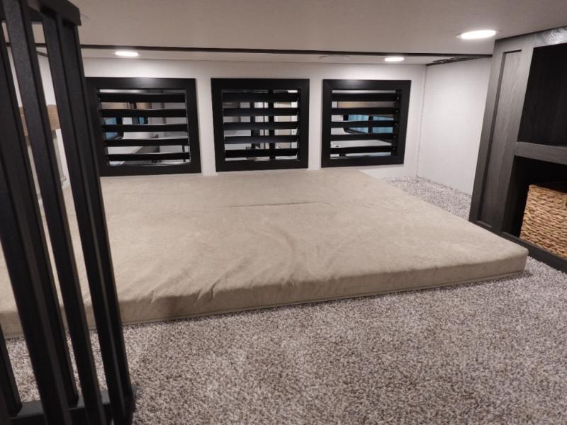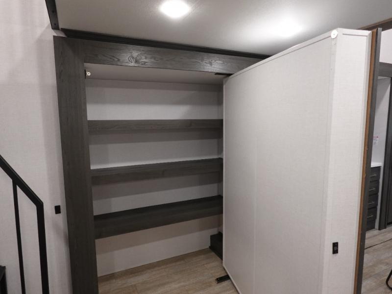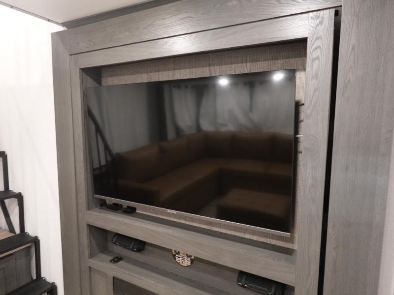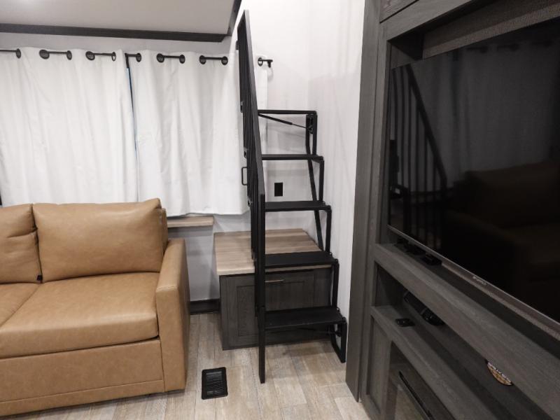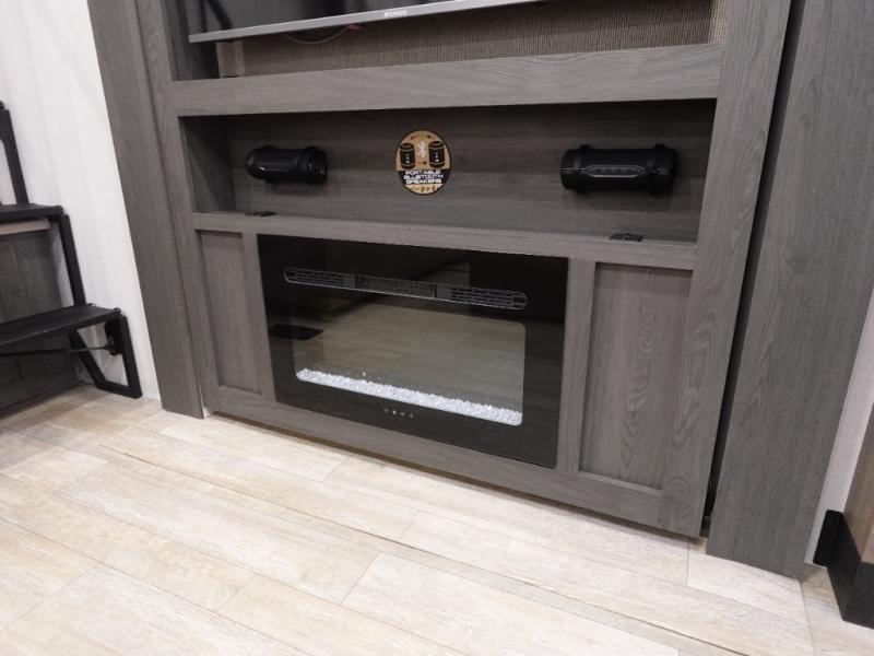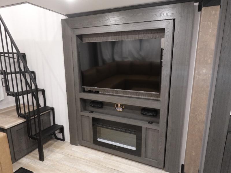 Plan to stay awhile in this four slide out fifth wheel! There is a triple-slide patio door that opens into the kitchen, complete with a kitchen island, walk-in pantry and 16 cu. ft. 12V refrigerator, and a convenient half bath with storage. There are reclining theater seats with a chaise lounge across from an entertainment center and fireplace with hidden storage behind. The fold-up steps lead up to the loft that includes two bunk mats, a wardrobe, cubby storage, plus two windows, which will make this space bright and open. The full bath towards the front includes washer/dryer prep, a walk-in shower with a skylight, and a linen closet to keep towels close by. And you'll love having your own bedroom up front with a king bed with Versa Tilt, a dresser with a bench, and a front wardrobe to keep your clothes wrinkle-free!