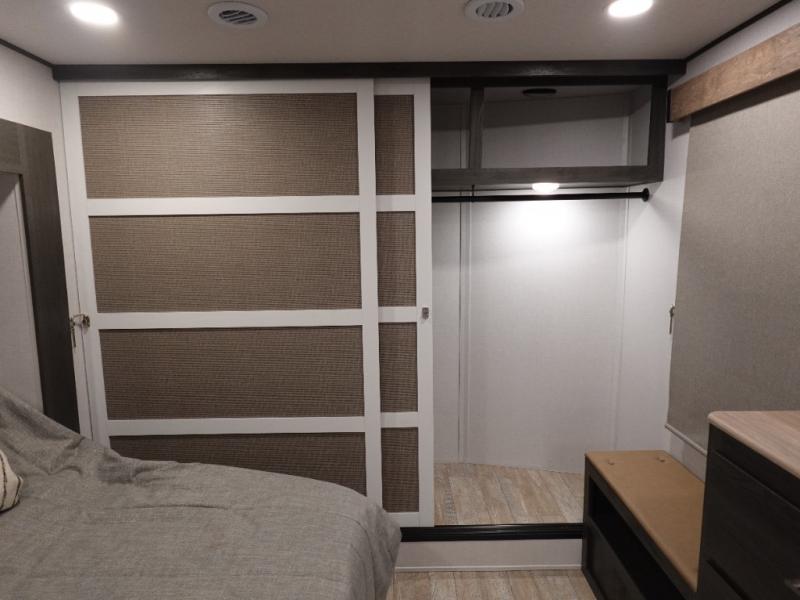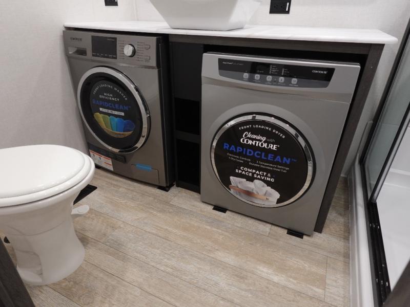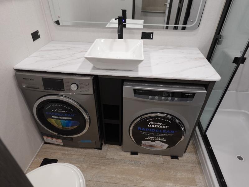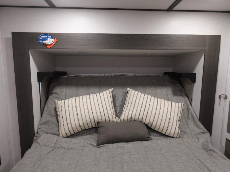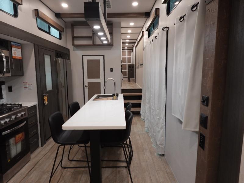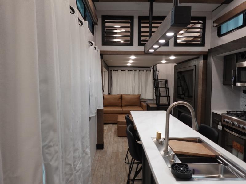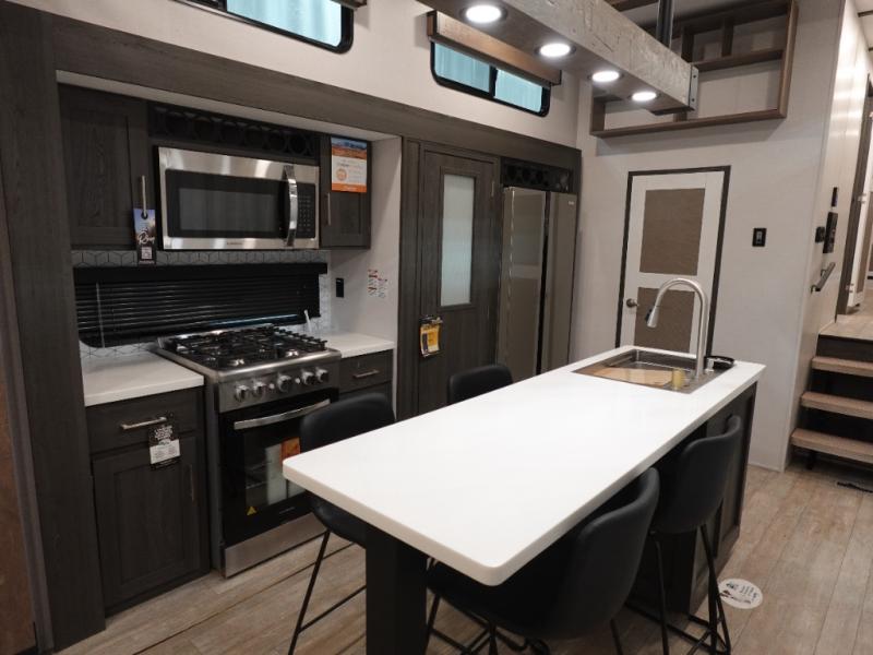 Plan to stay awhile in this four slide out fifth wheel! There is a triple-slide patio door that opens into the kitchen, complete with a kitchen island, walk-in pantry and 16 cu. ft. 12V refrigerator, and a convenient half bath with storage. There are reclining theater seats with a chaise lounge across from an entertainment center and fireplace with hidden storage behind. The fold-up steps lead up to the loft that includes two bunk mats, a wardrobe, cubby storage, plus two windows, which will make this space bright and open. The full bath towards the front includes washer/dryer prep, a walk-in shower with a skylight, and a linen closet to keep towels close by. And you'll love having your own bedroom up front with a king bed with Versa Tilt, a dresser with a bench, and a front wardrobe to keep your clothes wrinkle-free!