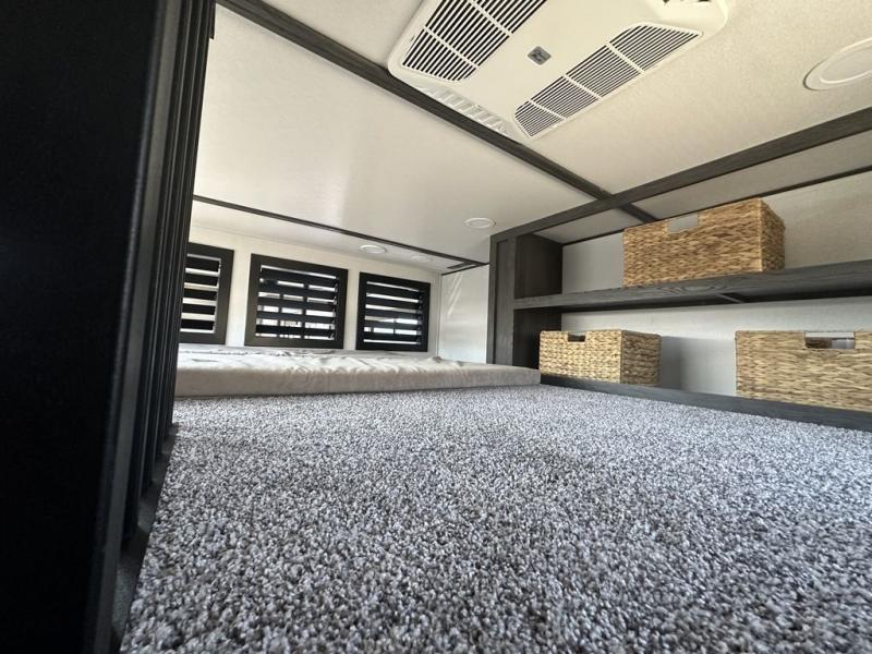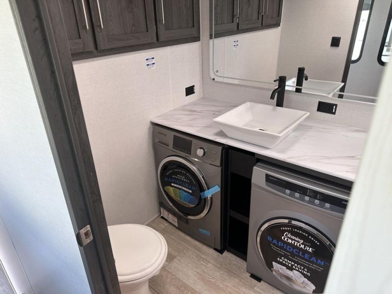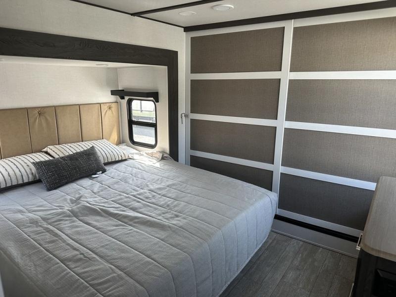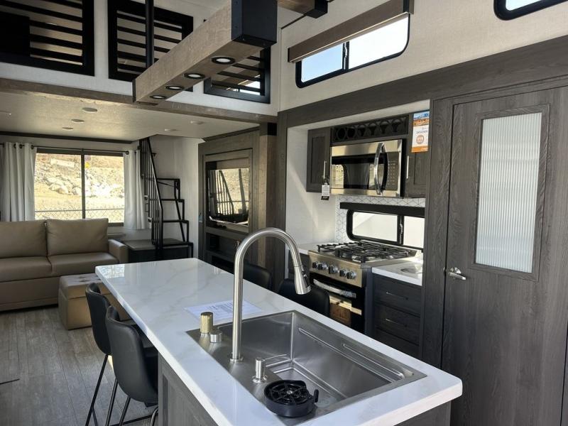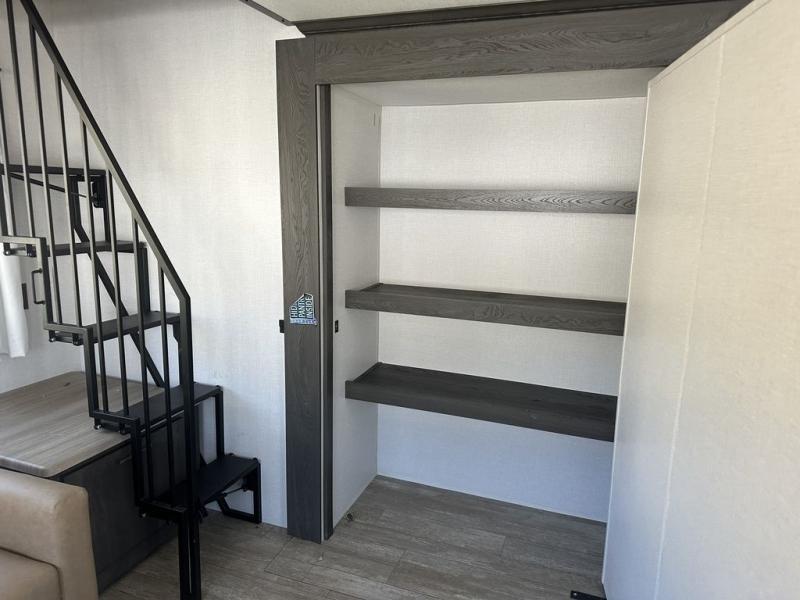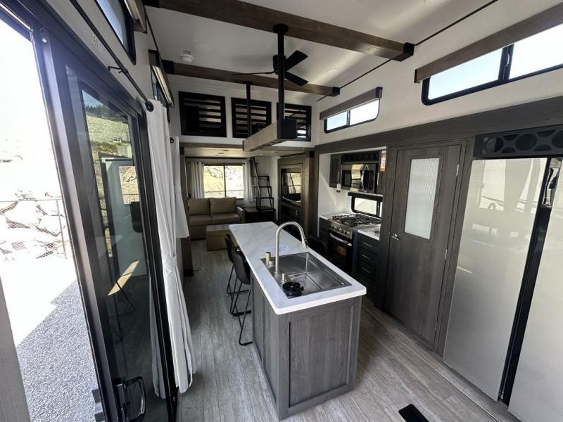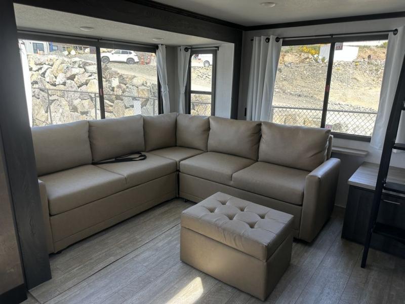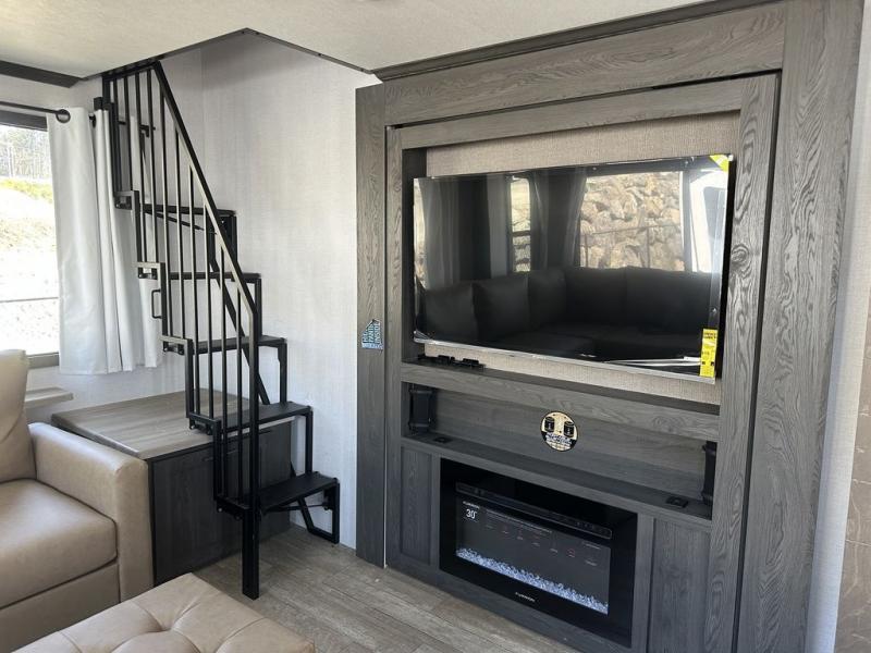 Plan to stay awhile in this four slide out fifth wheel! There is a triple-slide patio door that opens into the kitchen, complete with a kitchen island, walk-in pantry and 16 cu. ft. 12V refrigerator, and a convenient half bath with storage. There are reclining theater seats with a chaise lounge across from an entertainment center and fireplace with hidden storage behind. The fold-up steps lead up to the loft that includes two bunk mats, a wardrobe, cubby storage, plus two windows, which will make this space bright and open. The full bath towards the front includes washer/dryer prep, a walk-in shower with a skylight, and a linen closet to keep towels close by. And you'll love having your own bedroom up front with a king bed with Versa Tilt, a dresser with a bench, and a front wardrobe to keep your clothes wrinkle-free!