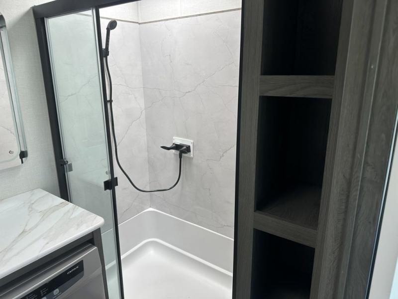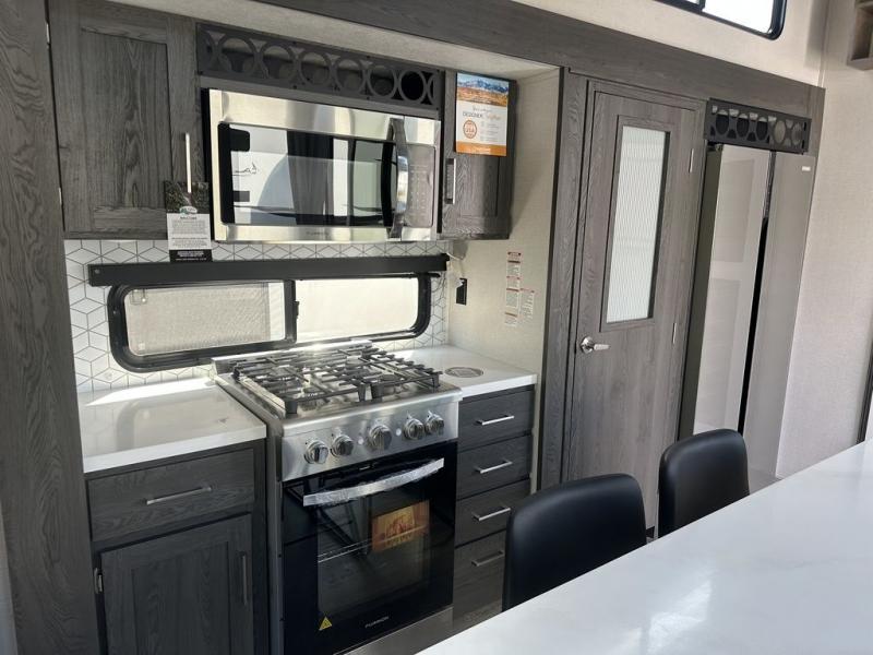 With any Impression mid-profile fifth wheel by Forest River, the focus of the design is comfort and value, built with quality craftsmanship and attention to customer's desires in each Impression! The exterior includes upgraded E-rated MAXXIS tires, custom exterior graphics package, and insulated slam latch baggage doors. There is also an enclosed docking station, an outside shower, and a 100W roof solar panel for off-grid capabilities. The fully heated and enclosed AccessiBelly has removable underbelly panels and offers four seasons of travel, and there is an industry leading 15K A/C plus 35K BTU furnace to keep you comfortable. The interior has lumbercore cabinetry, residential linoleum, residential backsplash in the kitchen, and oversized opening windows in the living area for more natural lighting and good air flow.