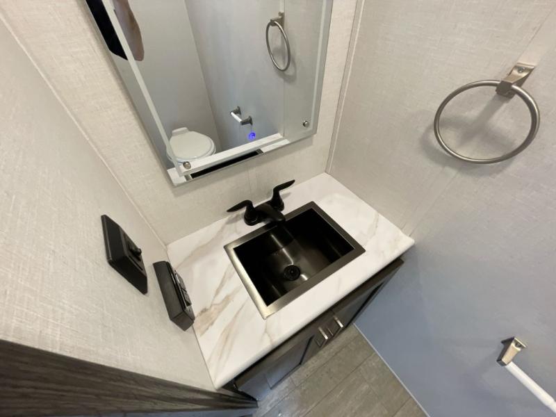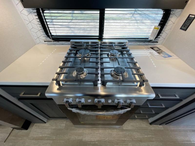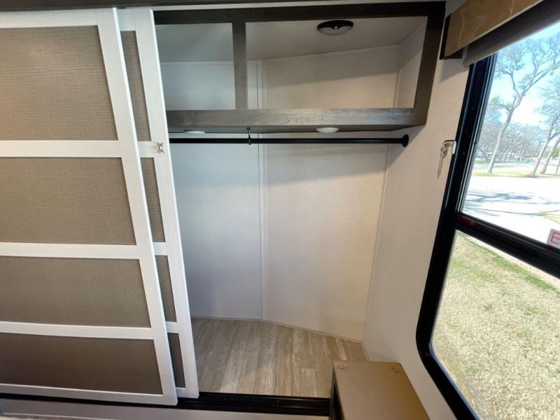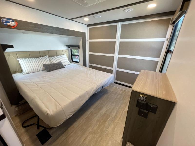 With any Impression mid-profile fifth wheel by Forest River, the focus of the design is comfort and value, built with quality craftsmanship and attention to customer's desires in each Impression! The exterior includes upgraded E-rated MAXXIS tires, custom exterior graphics package, and insulated slam latch baggage doors. There is also an enclosed docking station, an outside shower, and a 100W roof solar panel for off-grid capabilities. The fully heated and enclosed AccessiBelly has removable underbelly panels and offers four seasons of travel, and there is an industry leading 15K A/C plus 35K BTU furnace to keep you comfortable. The interior has lumbercore cabinetry, residential linoleum, residential backsplash in the kitchen, and oversized opening windows in the living area for more natural lighting and good air flow.