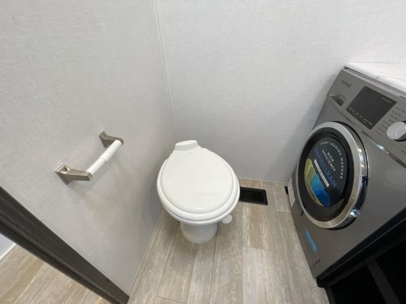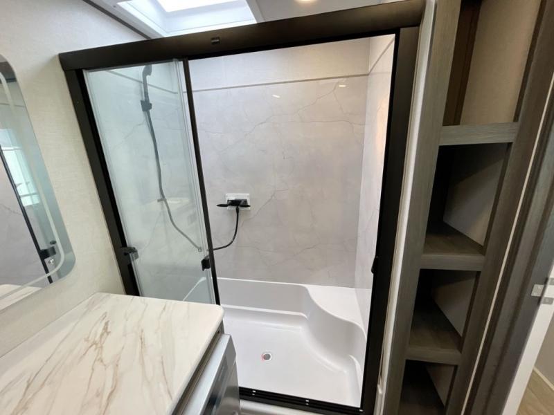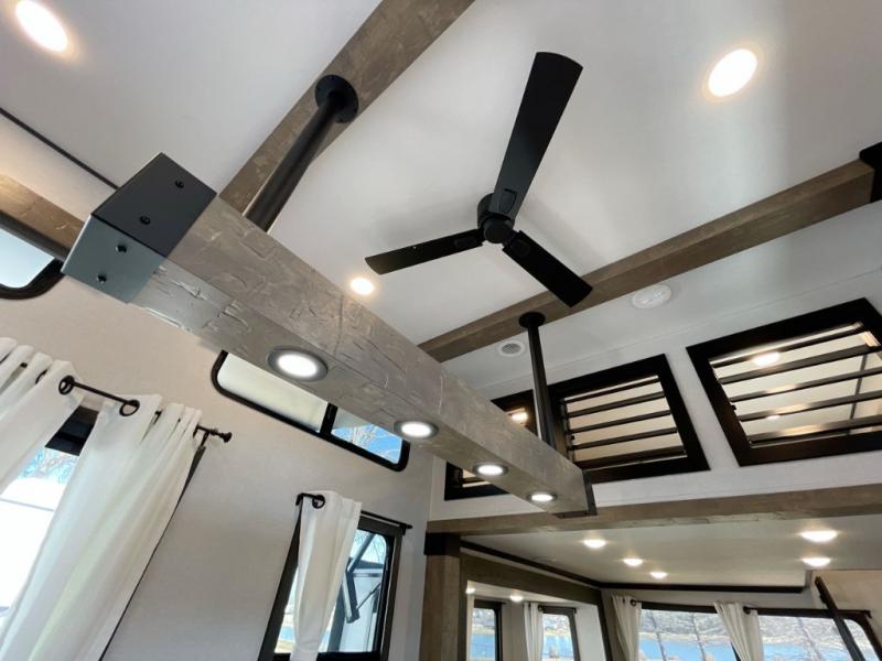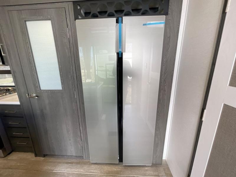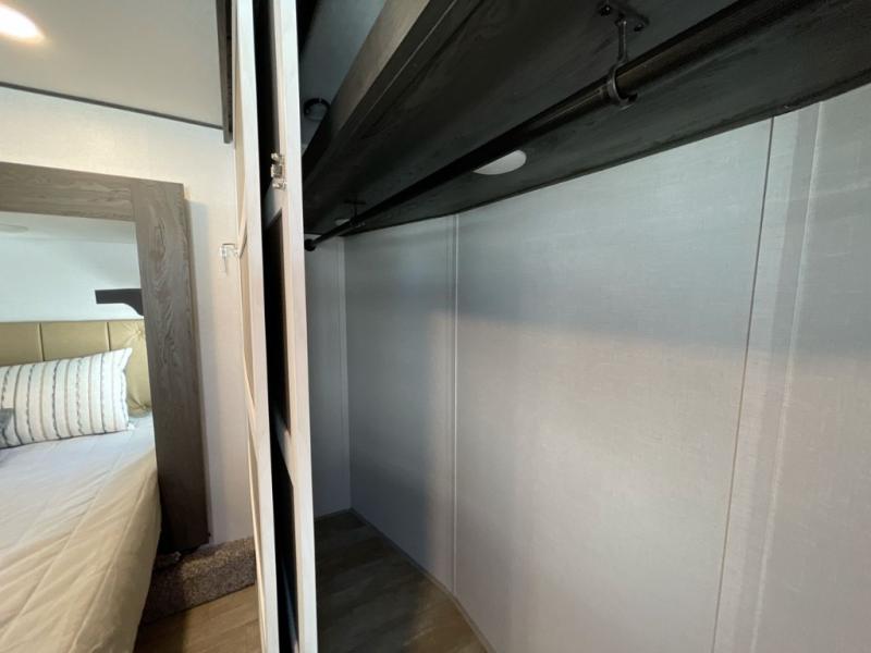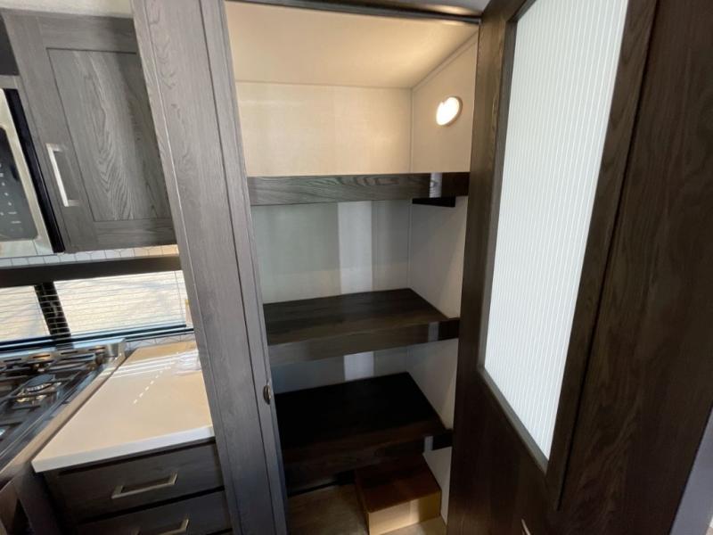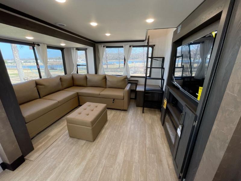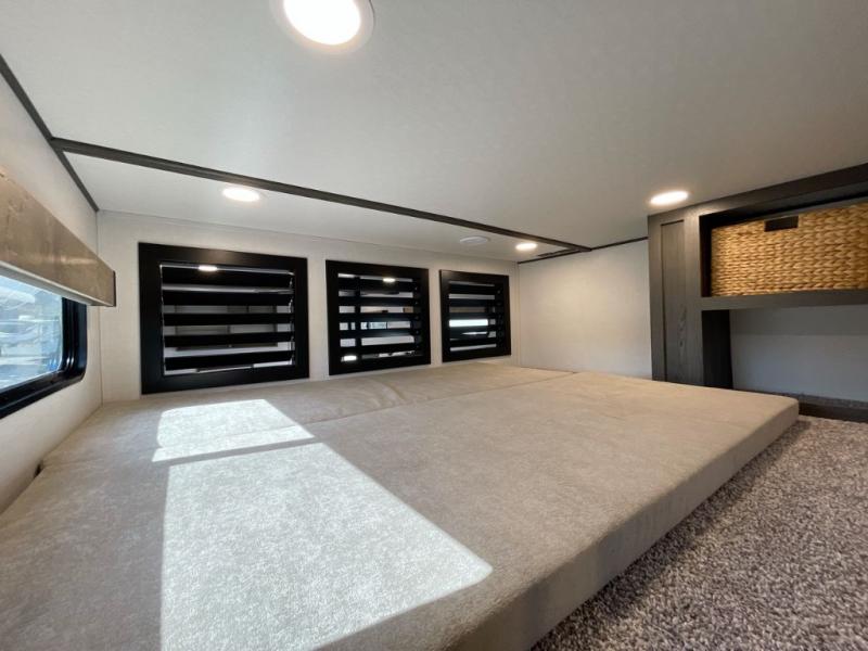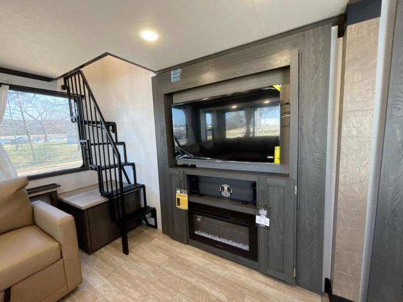 Plan to stay awhile in this four slide out fifth wheel! There is a triple-slide patio door that opens into the kitchen, complete with a kitchen island, walk-in pantry and 16 cu. ft. 12V refrigerator, and a convenient half bath with storage. There are reclining theater seats with a chaise lounge across from an entertainment center and fireplace with hidden storage behind. The fold-up steps lead up to the loft that includes two bunk mats, a wardrobe, cubby storage, plus two windows, which will make this space bright and open. The full bath towards the front includes washer/dryer prep, a walk-in shower with a skylight, and a linen closet to keep towels close by. And you'll love having your own bedroom up front with a king bed with Versa Tilt, a dresser with a bench, and a front wardrobe to keep your clothes wrinkle-free!