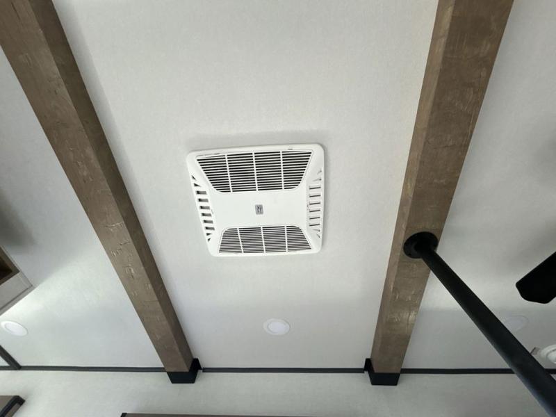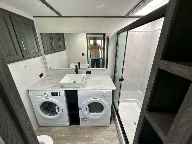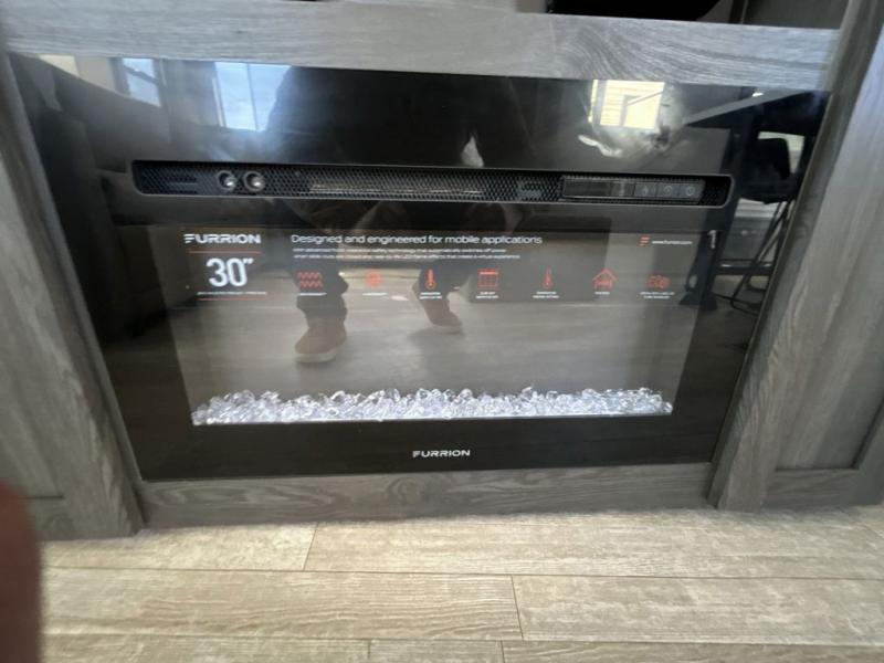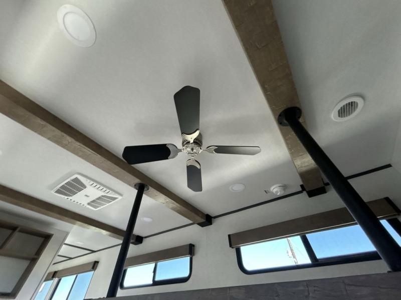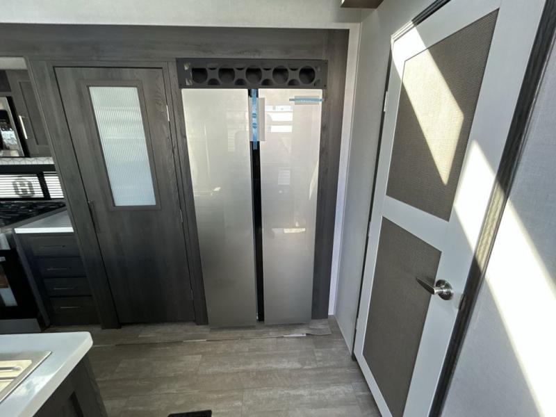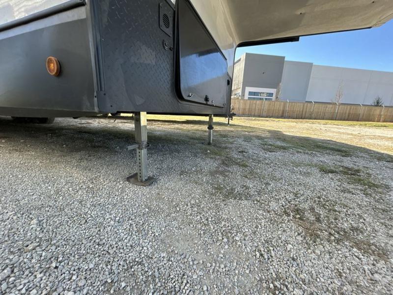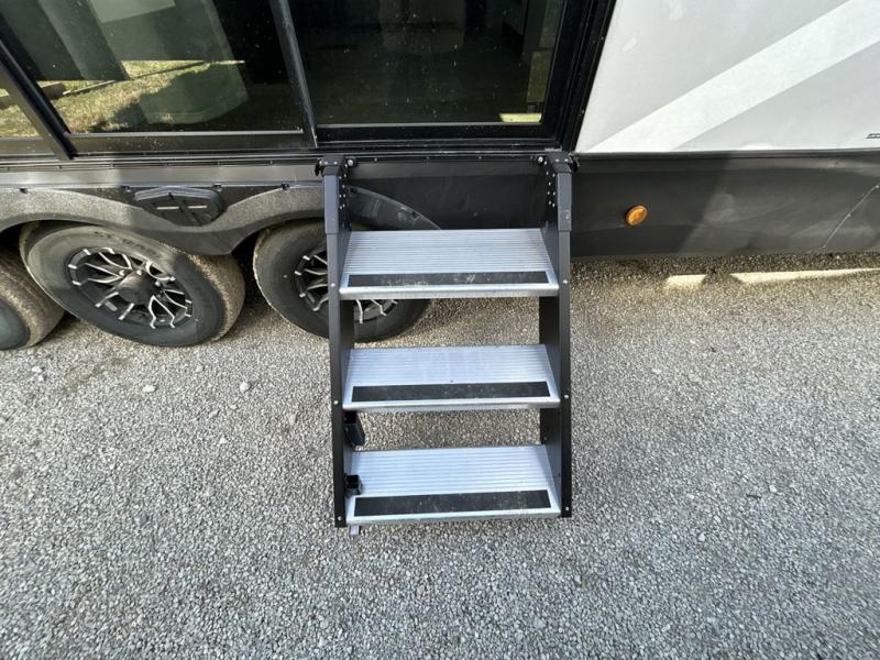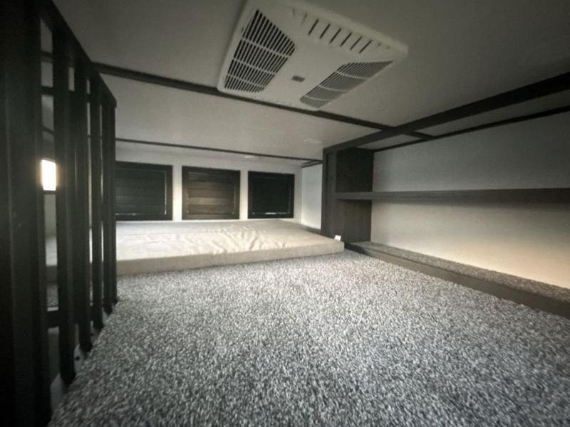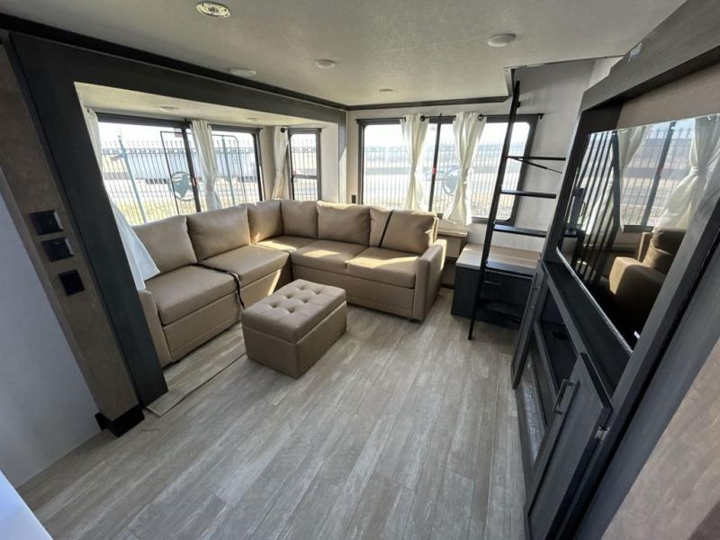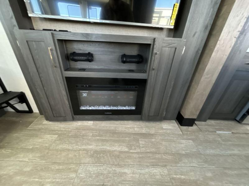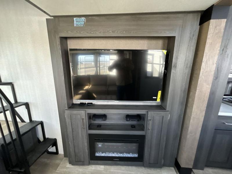 Plan to stay awhile in this four slide out fifth wheel! There is a triple-slide patio door that opens into the kitchen, complete with a kitchen island, walk-in pantry and 16 cu. ft. 12V refrigerator, and a convenient half bath with storage. There are reclining theater seats with a chaise lounge across from an entertainment center and fireplace with hidden storage behind. The fold-up steps lead up to the loft that includes two bunk mats, a wardrobe, cubby storage, plus two windows, which will make this space bright and open. The full bath towards the front includes washer/dryer prep, a walk-in shower with a skylight, and a linen closet to keep towels close by. And you'll love having your own bedroom up front with a king bed with Versa Tilt, a dresser with a bench, and a front wardrobe to keep your clothes wrinkle-free!