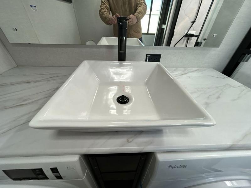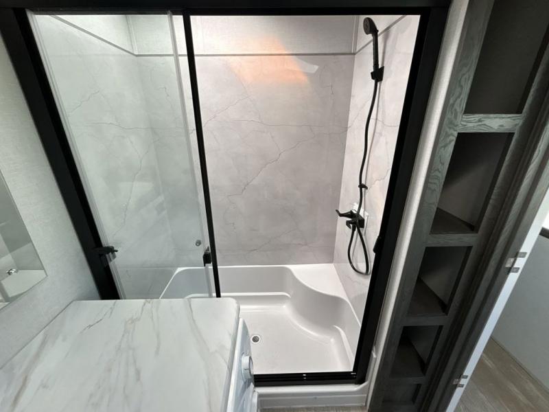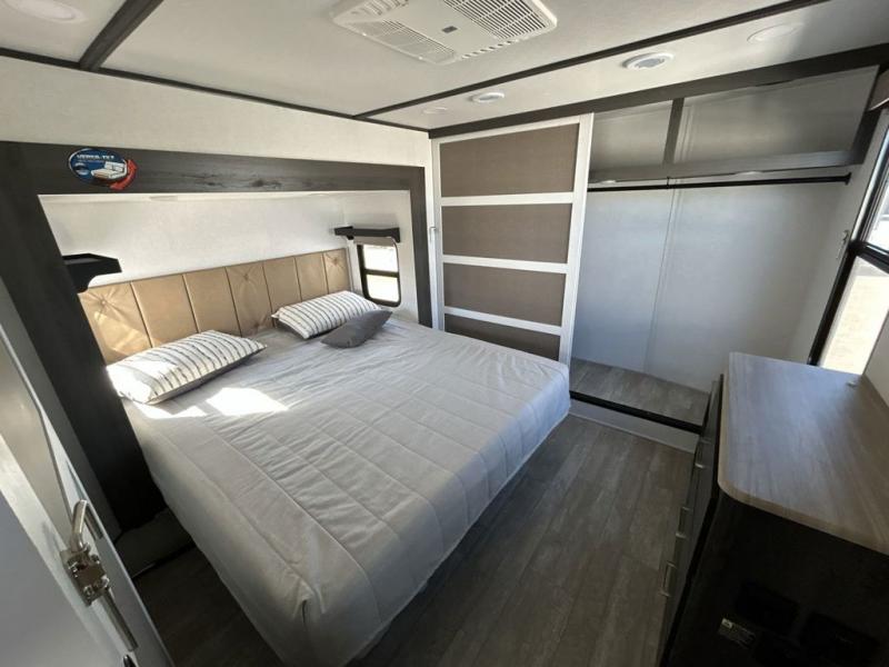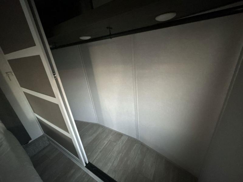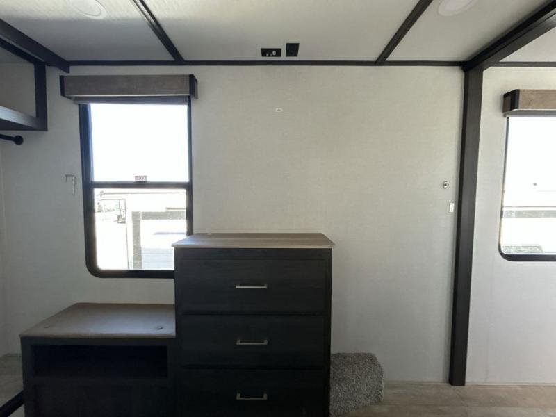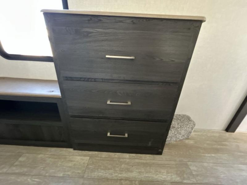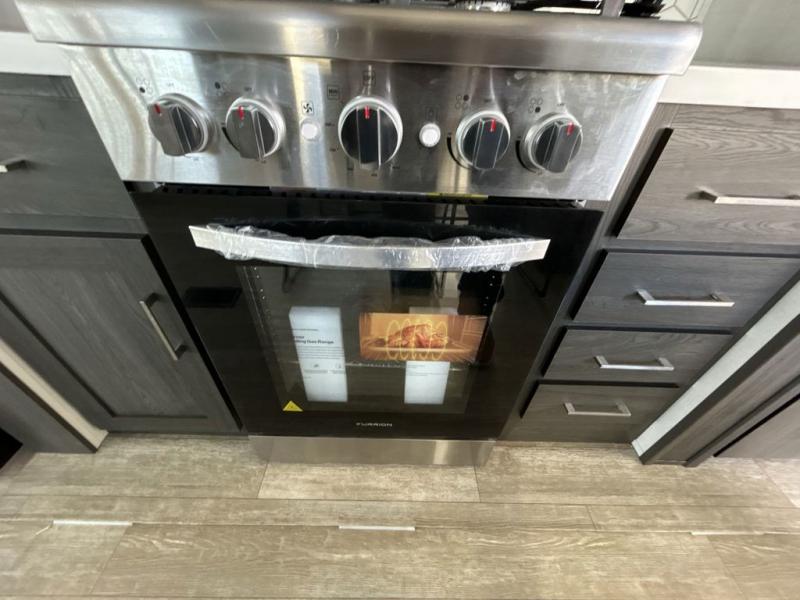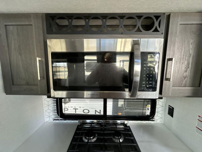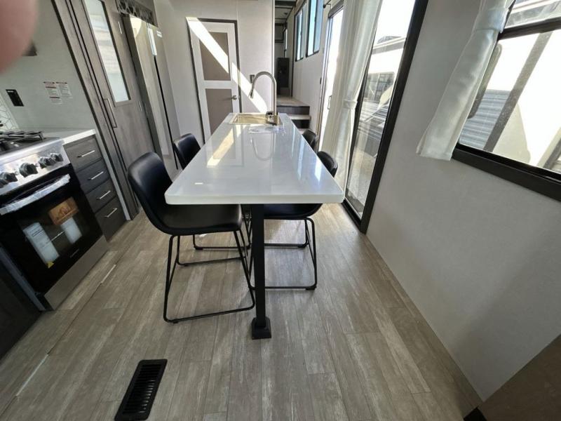 With any Impression mid-profile fifth wheel by Forest River, the focus of the design is comfort and value, built with quality craftsmanship and attention to customer's desires in each Impression! The exterior includes upgraded E-rated MAXXIS tires, custom exterior graphics package, and insulated slam latch baggage doors. There is also an enclosed docking station, an outside shower, and a 100W roof solar panel for off-grid capabilities. The fully heated and enclosed AccessiBelly has removable underbelly panels and offers four seasons of travel, and there is an industry leading 15K A/C plus 35K BTU furnace to keep you comfortable. The interior has lumbercore cabinetry, residential linoleum, residential backsplash in the kitchen, and oversized opening windows in the living area for more natural lighting and good air flow.