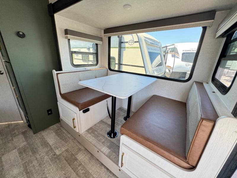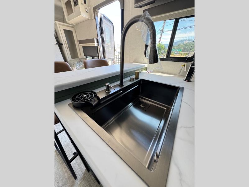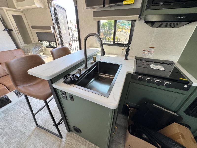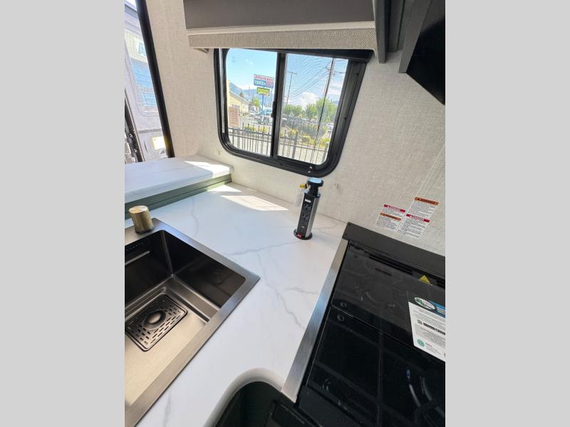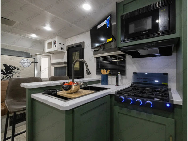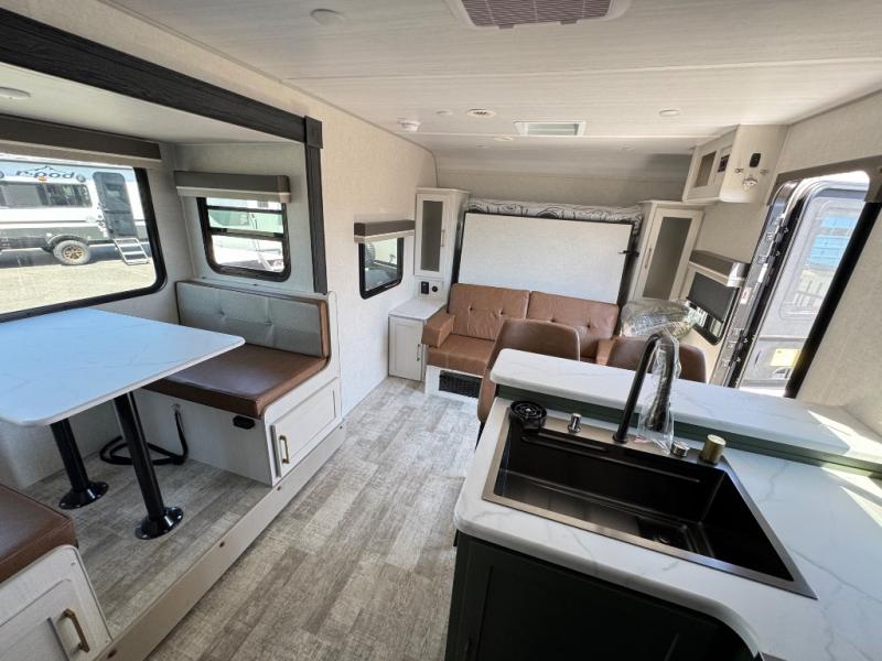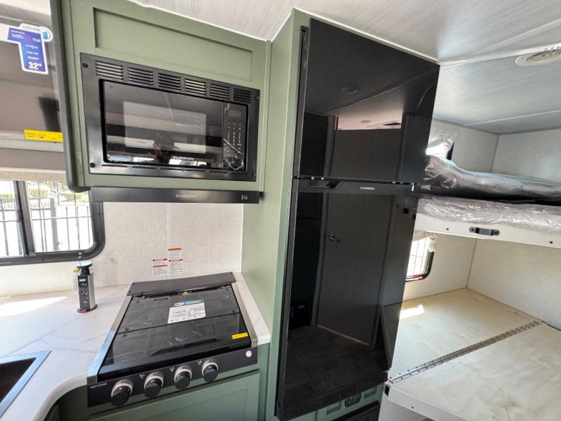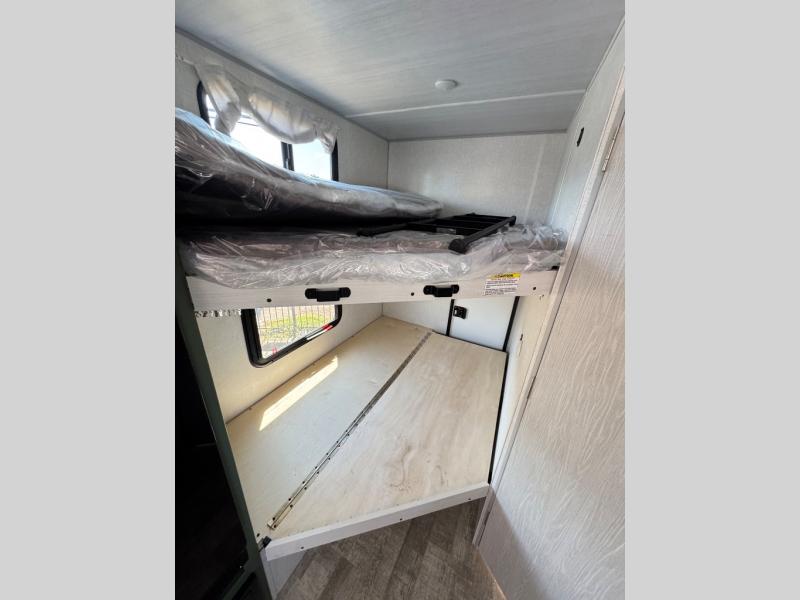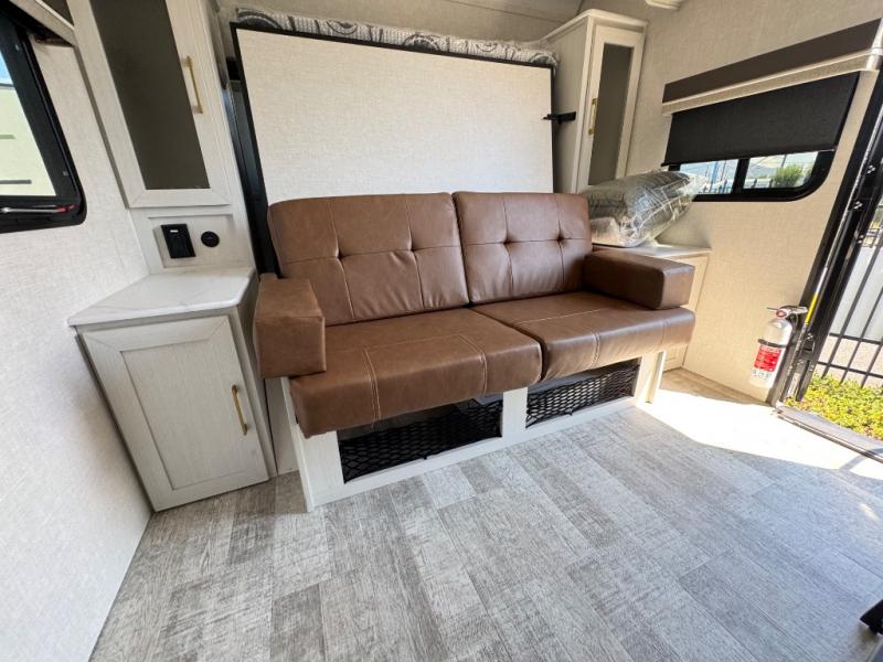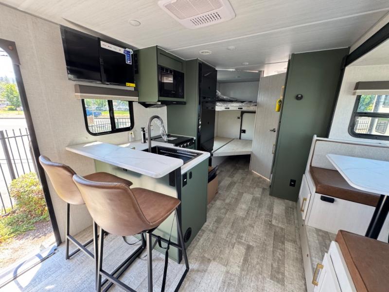 Pack up this very versatile Murphy bed travel trailer and head out to explore! You will love the space saving aspect that a Murphy bed gives you by not increasing the tow length in order to give you a separate bedroom and living space, and you don't even have to make the bed, just fold it up into the wall in the morning! Double-size bunks in the rear corner are perfect for accommodating both children and adults. The kitchen offers everything a cook would need to feed the whole gang and there is even a counter bar area with two stools which will be perfect for breakfast time. There is a booth dinette slide for more dining space, or a place to enjoy a board game or card game when you are inside. The Beast Mode Package on this model comes with an additional 200W solar panel, a 2,000W inverter, and an independent suspension for better clearance and handling!