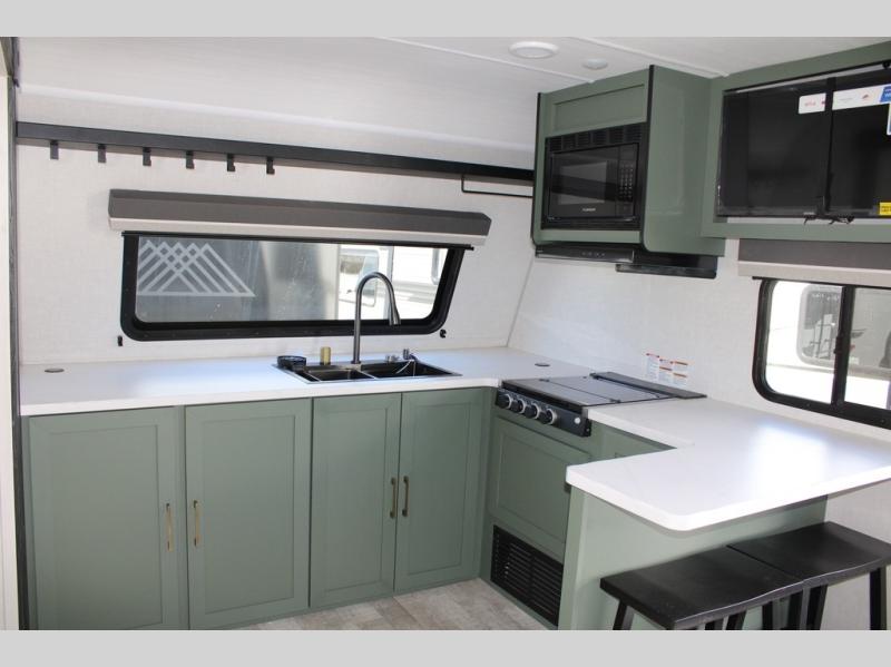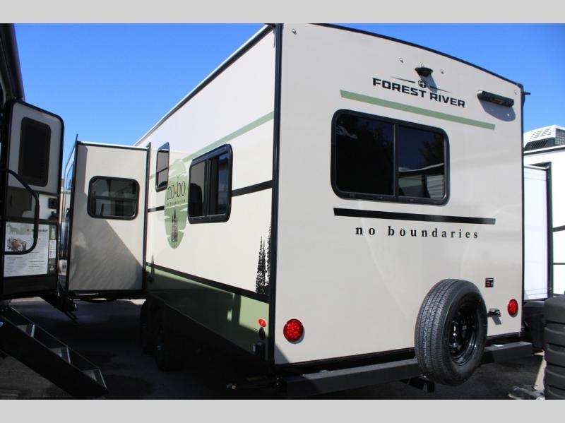 If you want to break free from the travel constraints of standard trailers, then you must choose the Forest River No Boundaries travel trailer because they are rugged and ready for adventure! These 18, 19, and 20 Series trailers are built with a laminated wall with aluminum construction and Azdel composite substrate for added durability. There is also a rugged tire and wheel package with a spare tire included, a fully enclosed underbelly, and a Cold Weather Package with 12V heated tank pads and forced air to help extend your camping season. A 15K A/C will provide comfort during the summer, and a Bluetooth speaker will let you listen to your favorite tunes while you're at the campground. Choose the optional Beast Mode Package for an additional 200W solar panel, 2,000W inverter, and Beast Mode independent suspension!