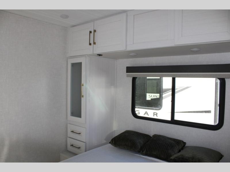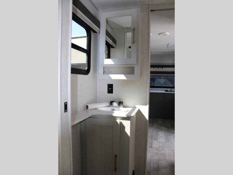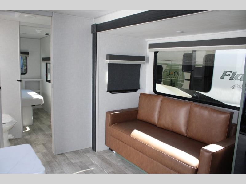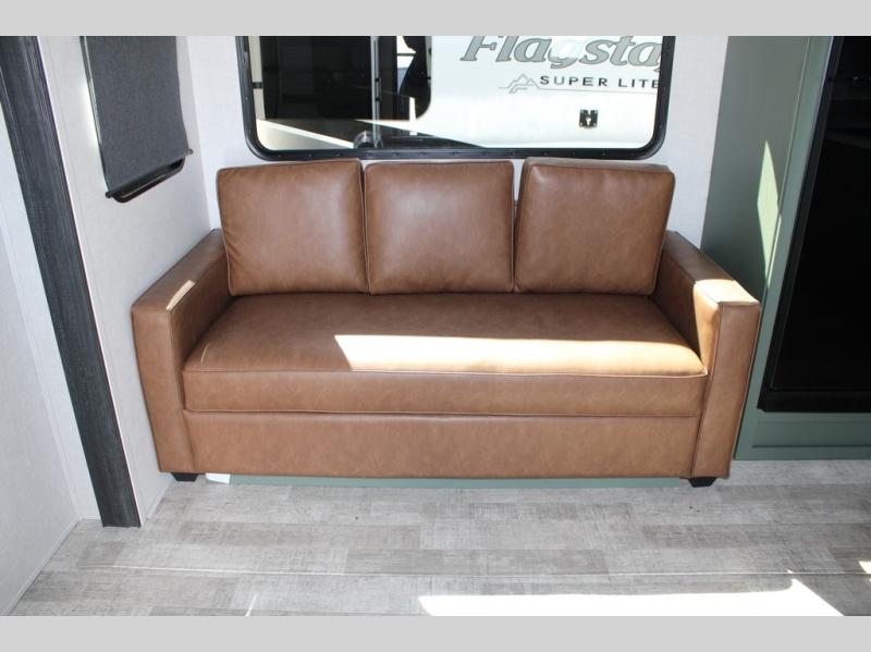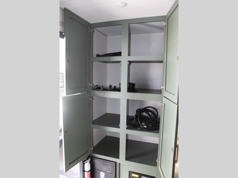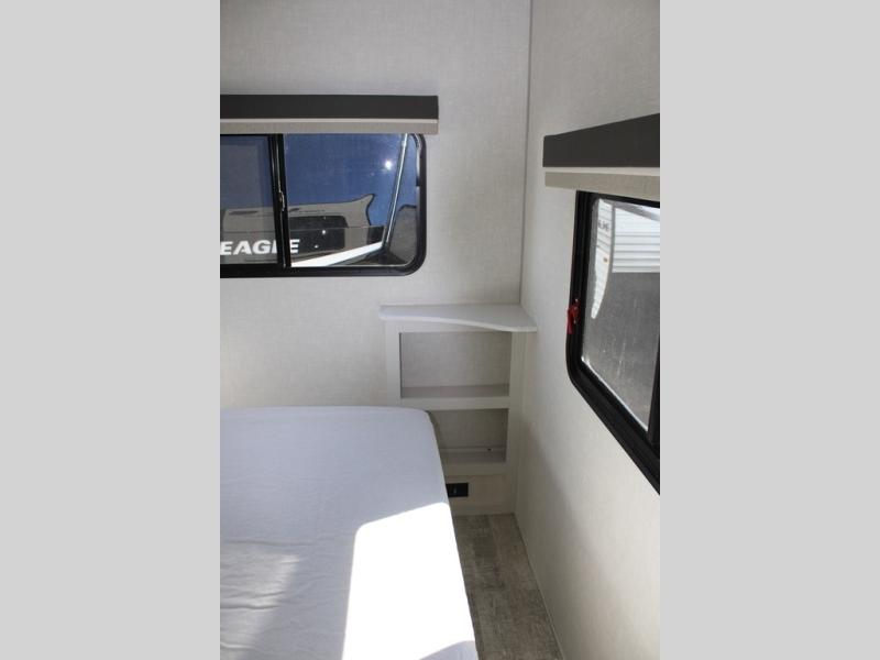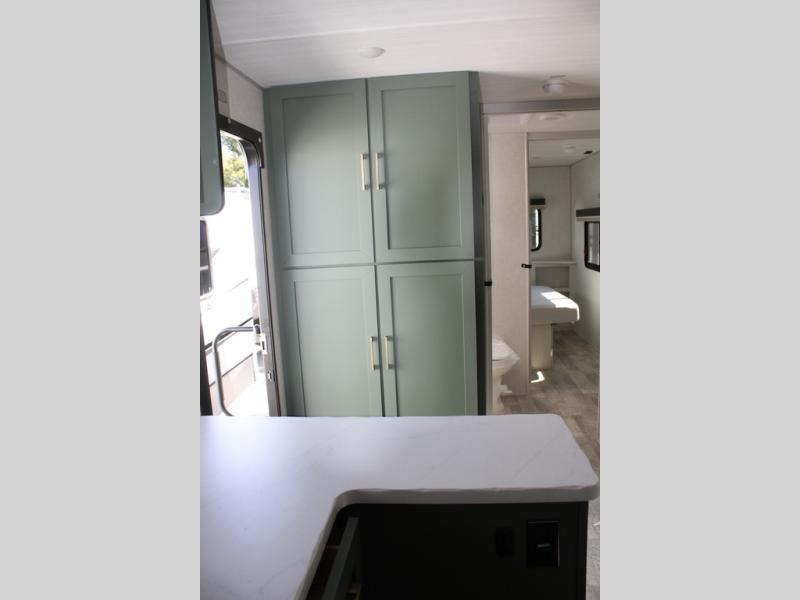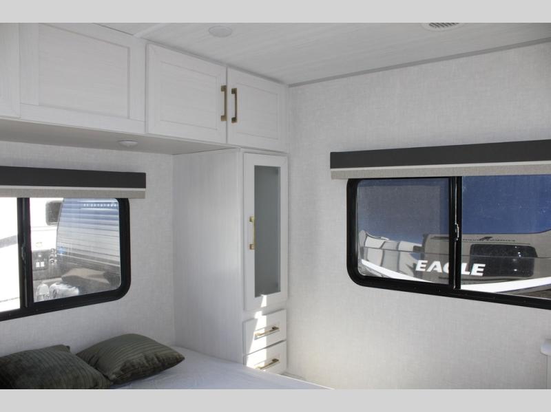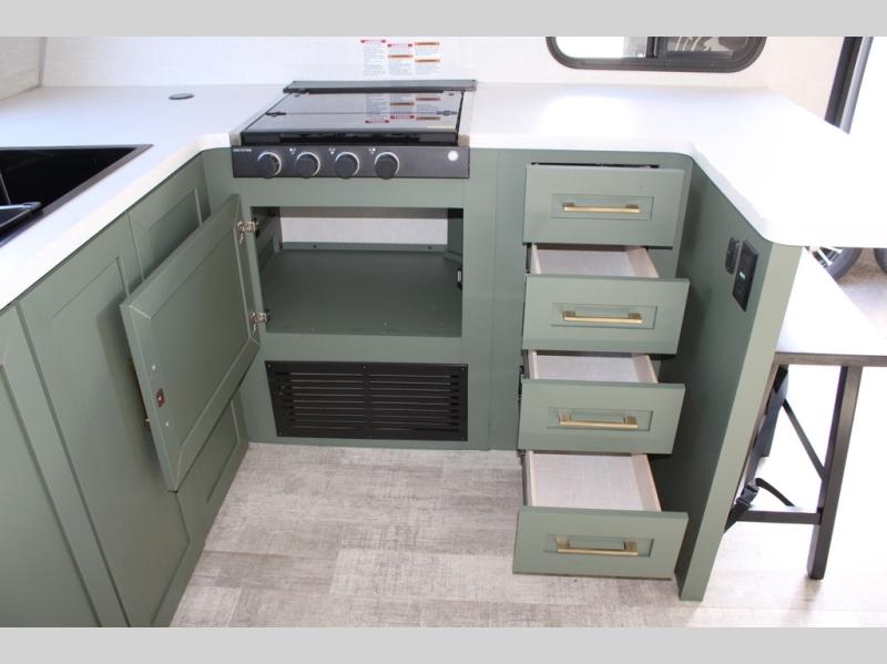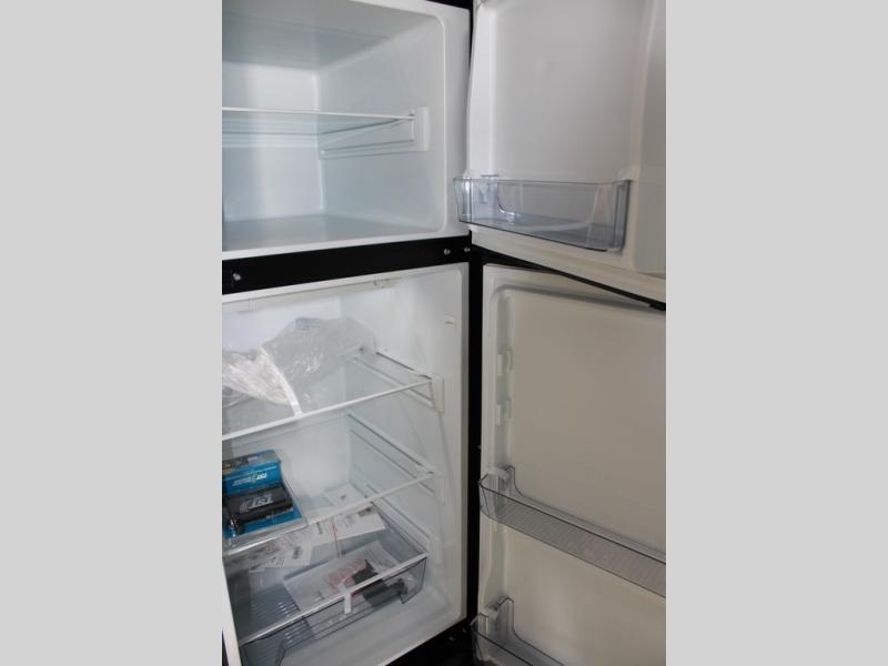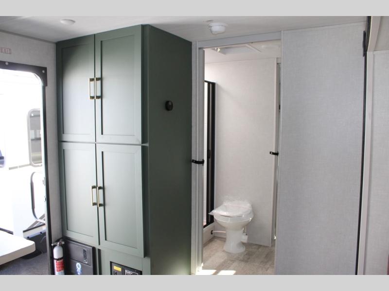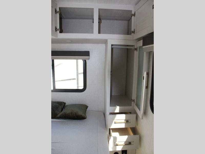 This couple's trailer is perfect for weekend trips or extended stays at the campground. A front kitchen includes generous counter space, along with a bar top and two seats. You can relax on the jackknife sofa slide after breakfast, or head outdoors to sit under the patio awning. The walk-thru bath will lead to the rear master bedroom where you'll find a queen bed and dual wardrobes for your clothes.