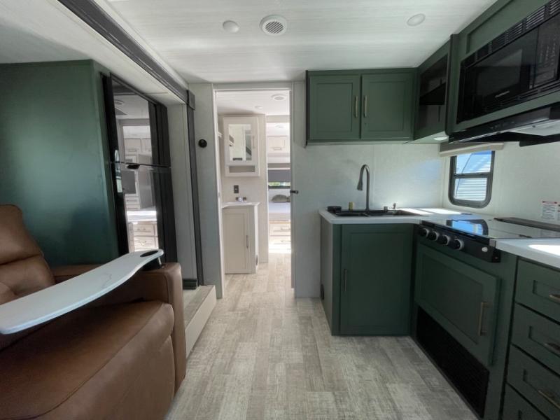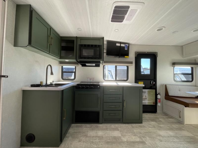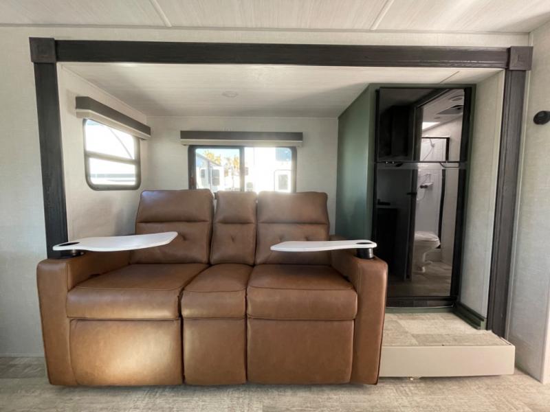 It will be so easy to enjoy camping trips in this No Boundaries travel trailer! The front master bedroom includes one of the dual entry doors so you can slip out early for a morning run without waking anyone else up. When you return, you can freshen up in the walk-thru bath, then head to the kitchen to make breakfast. There is also an outside kitchen so you can cook in the fresh mountain air. There is a booth dinette inside where you can dine at, play games, and even let a guest sleep over, and the theater seating slide provides more space and comfort!