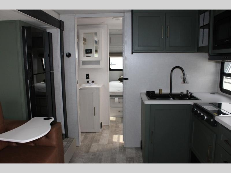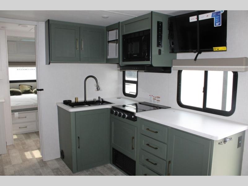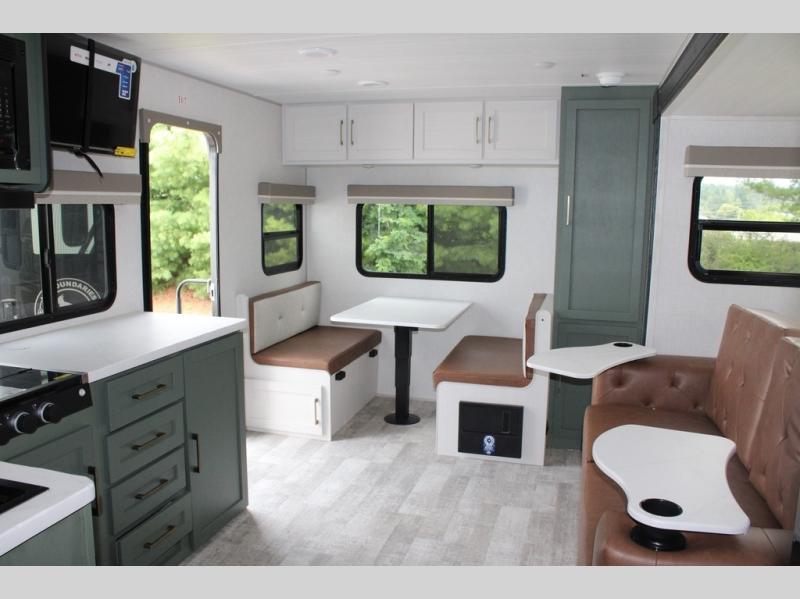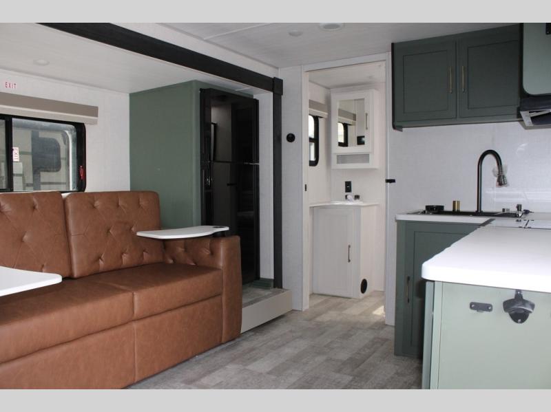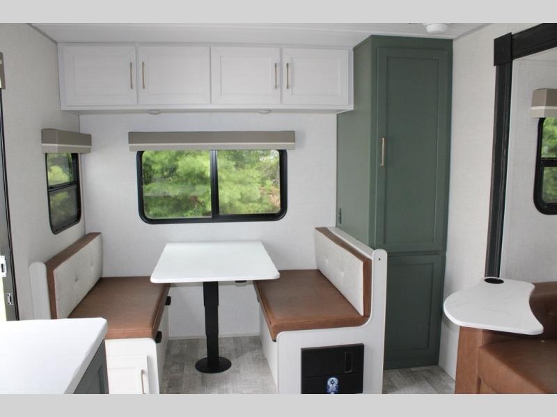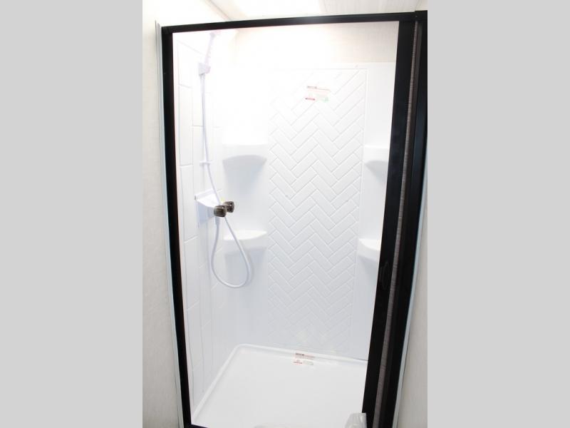 It will be so easy to enjoy camping trips in this No Boundaries travel trailer! The front master bedroom includes one of the dual entry doors so you can slip out early for a morning run without waking anyone else up. When you return, you can freshen up in the walk-thru bath, then head to the kitchen to make breakfast. There is also an outside kitchen so you can cook in the fresh mountain air. There is a booth dinette inside where you can dine at, play games, and even let a guest sleep over, and the theater seating slide provides more space and comfort!