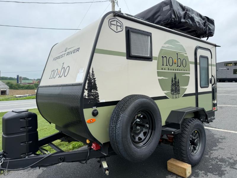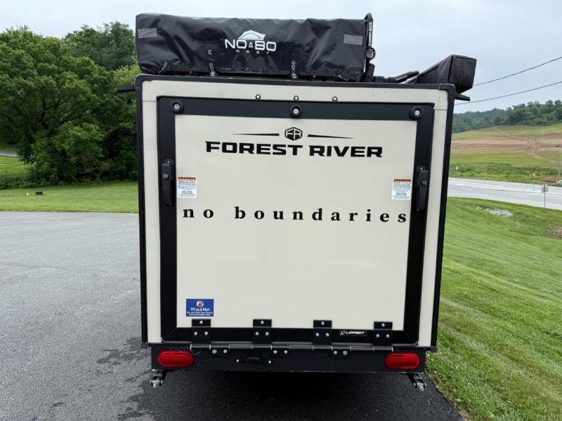 The 10 Series No Boundaries travel trailer or toy hauler by Forest River come in under 2,500 lbs. for an easy tow! There is a TST tire pressure monitoring system and aluminum wheels wrapped in all-terrain tires so you can adventure down more back roads. Outside, you'll find an awning, Vortex bars and RVT tracks, and solar on the side for off-grid capabilities. An optional rooftop tent can be added for more sleeping space, along with the optional Beast Mode Package for even better handling and clearance.