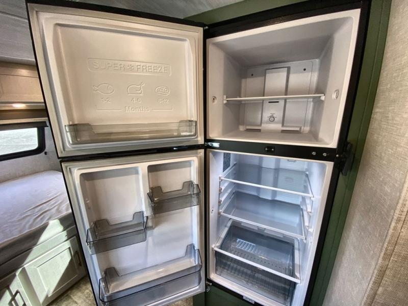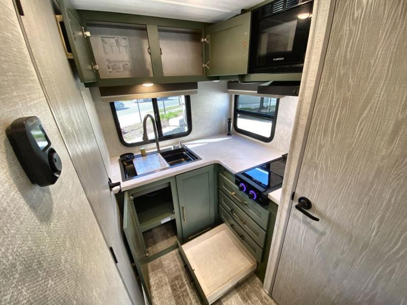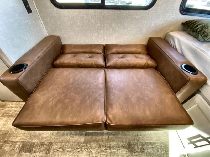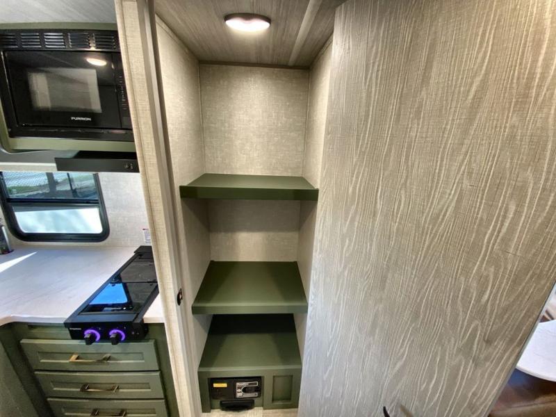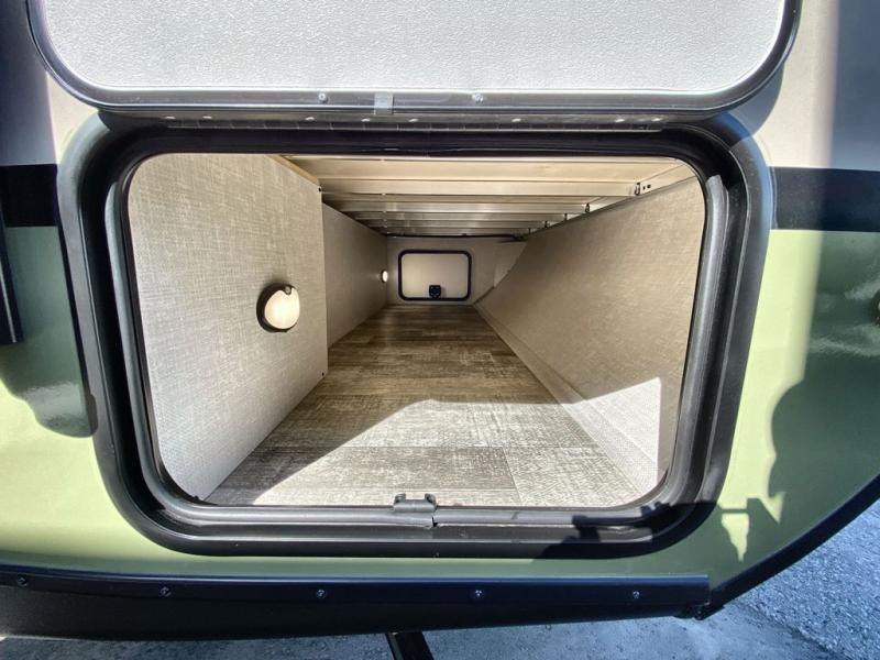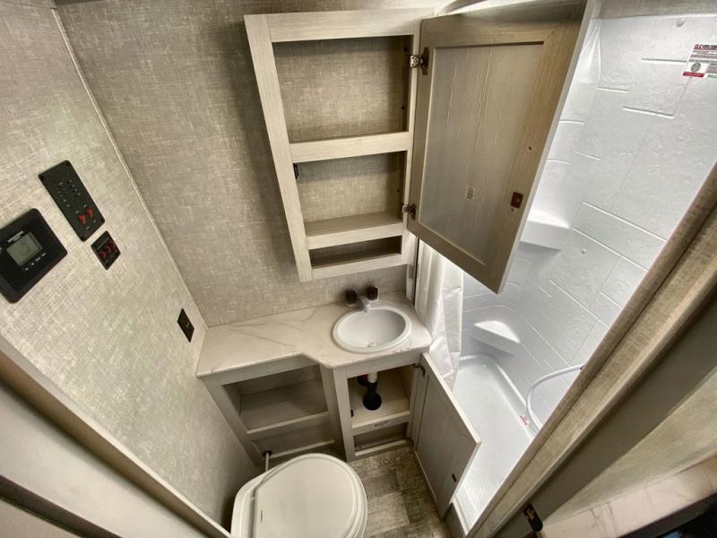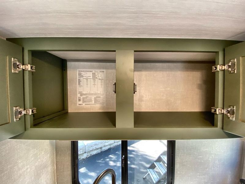 This easy to tow trailer is perfect for weekend trips to the lake! Once you're set up at camp, put out the patio awning, make lunch on the outside kitchen, and grab your camp chairs from the slam latch cargo doors with pass-thru lighting. A jackknife sofa inside will provide a place to relax in the evenings, and a full bath means you won't have to use the camp's facilities. The rear corner kitchen includes an all-in-one microwave and air fryer, plus a pantry and refrigerator for food storage. When it's time to call it a night, the front queen bed is sure to bring comfort!