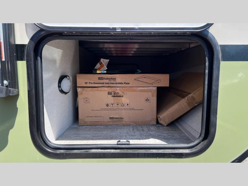 This easy to tow trailer is perfect for weekend trips to the lake! Once you're set up at camp, put out the patio awning, make lunch on the outside kitchen, and grab your camp chairs from the slam latch cargo doors with pass-thru lighting. A jackknife sofa inside will provide a place to relax in the evenings, and a full bath means you won't have to use the camp's facilities. The rear corner kitchen includes an all-in-one microwave and air fryer, plus a pantry and refrigerator for food storage. When it's time to call it a night, the front queen bed is sure to bring comfort!