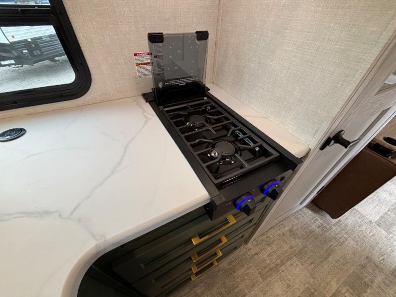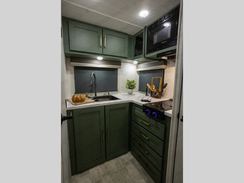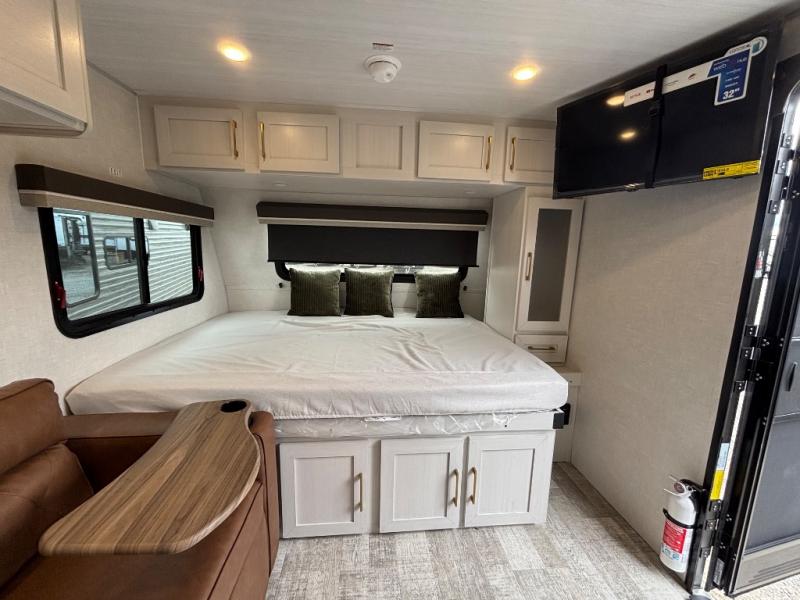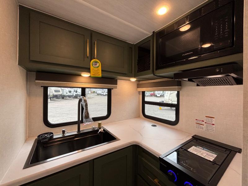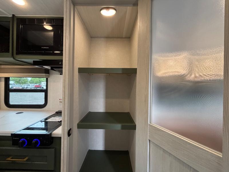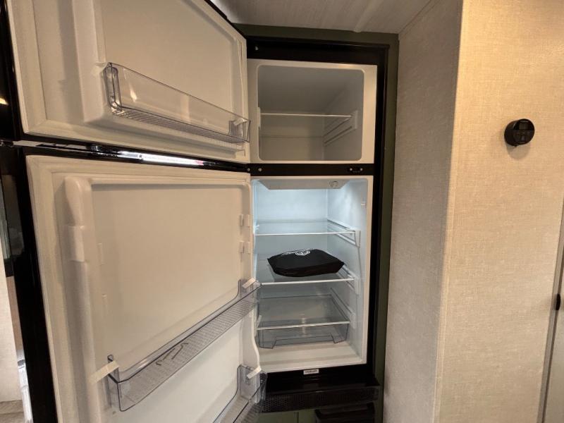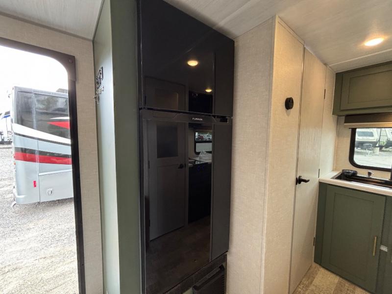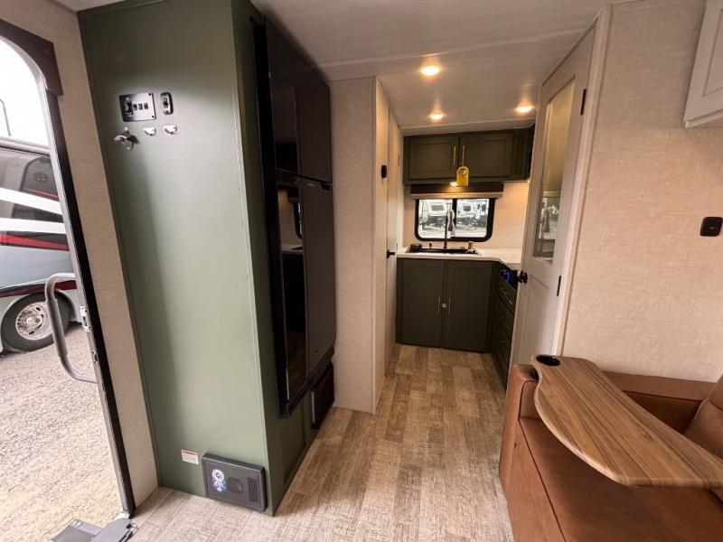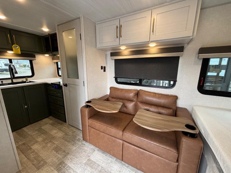 This easy to tow trailer is perfect for weekend trips to the lake! Once you're set up at camp, put out the patio awning, make lunch on the outside kitchen, and grab your camp chairs from the slam latch cargo doors with pass-thru lighting. A jackknife sofa inside will provide a place to relax in the evenings, and a full bath means you won't have to use the camp's facilities. The rear corner kitchen includes an all-in-one microwave and air fryer, plus a pantry and refrigerator for food storage. When it's time to call it a night, the front queen bed is sure to bring comfort!