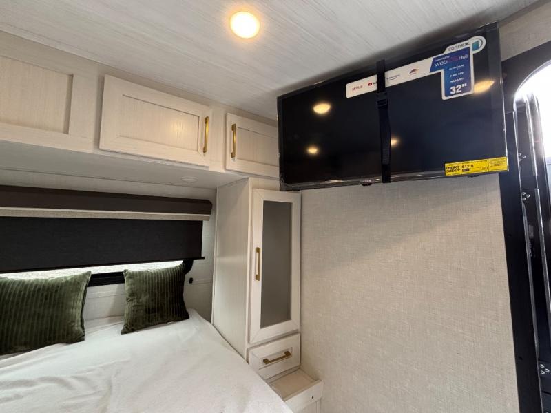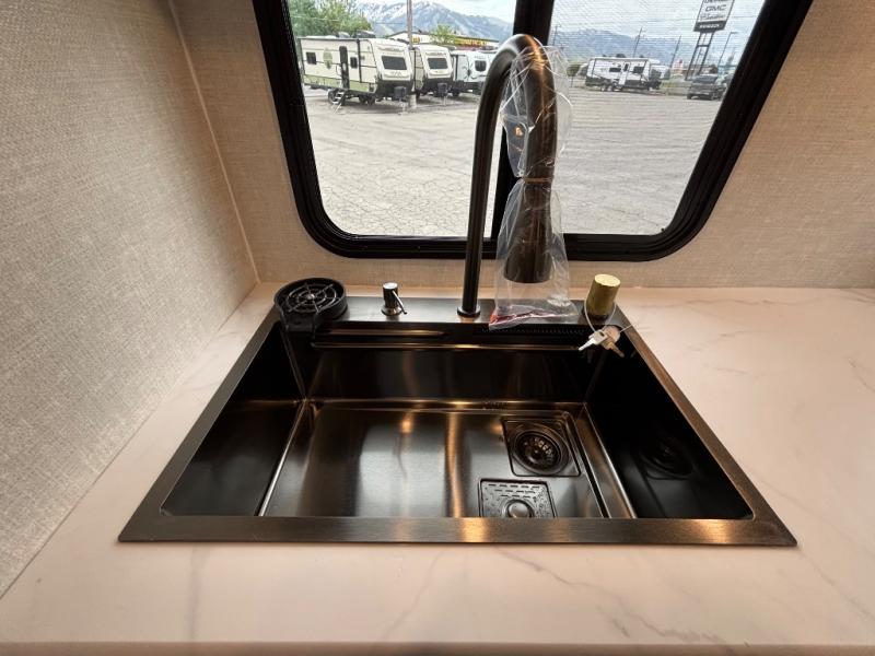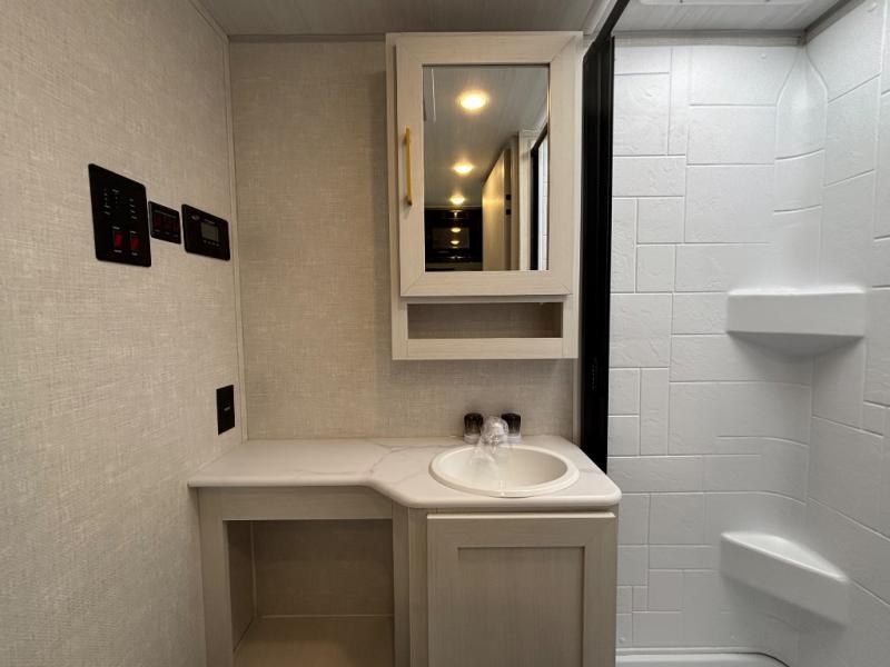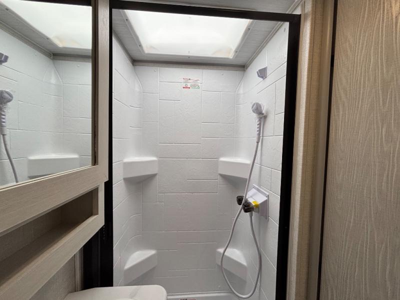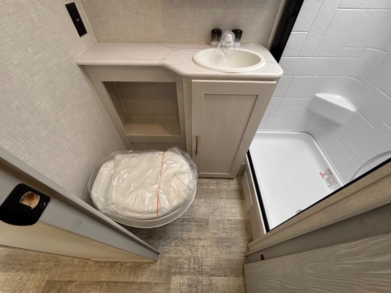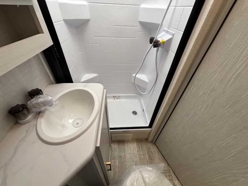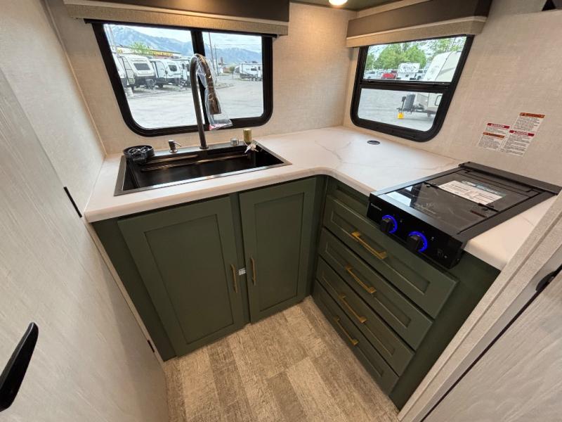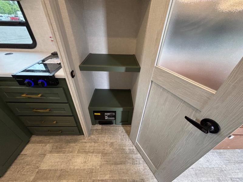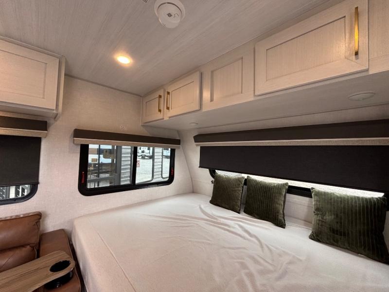 This easy to tow trailer is perfect for weekend trips to the lake! Once you're set up at camp, put out the patio awning, make lunch on the outside kitchen, and grab your camp chairs from the slam latch cargo doors with pass-thru lighting. A jackknife sofa inside will provide a place to relax in the evenings, and a full bath means you won't have to use the camp's facilities. The rear corner kitchen includes an all-in-one microwave and air fryer, plus a pantry and refrigerator for food storage. When it's time to call it a night, the front queen bed is sure to bring comfort!