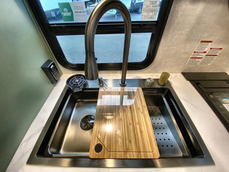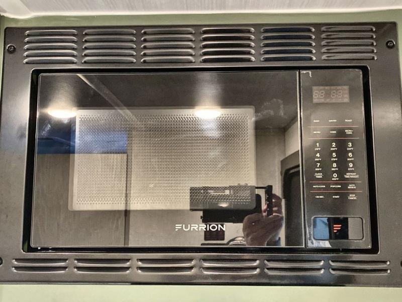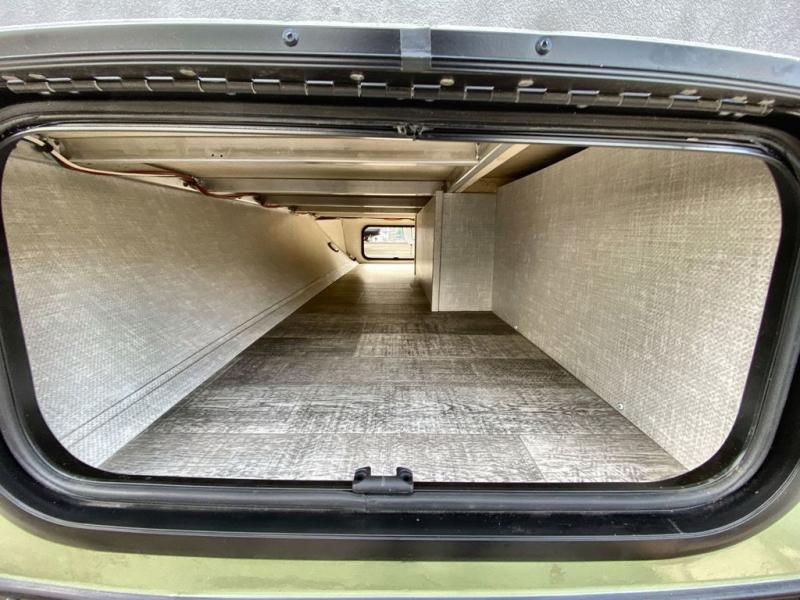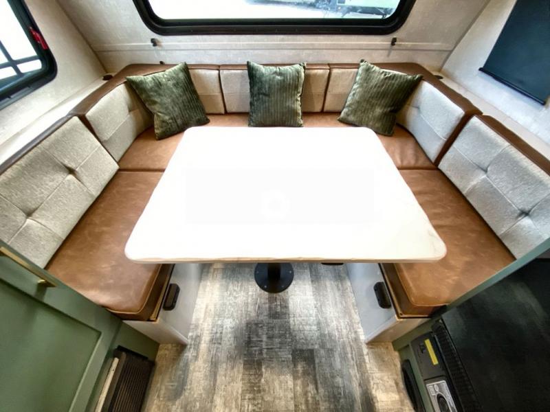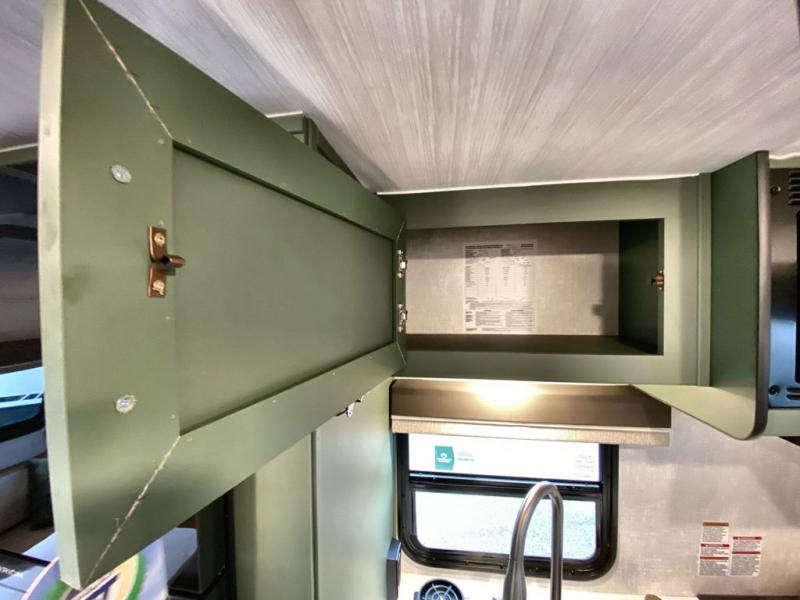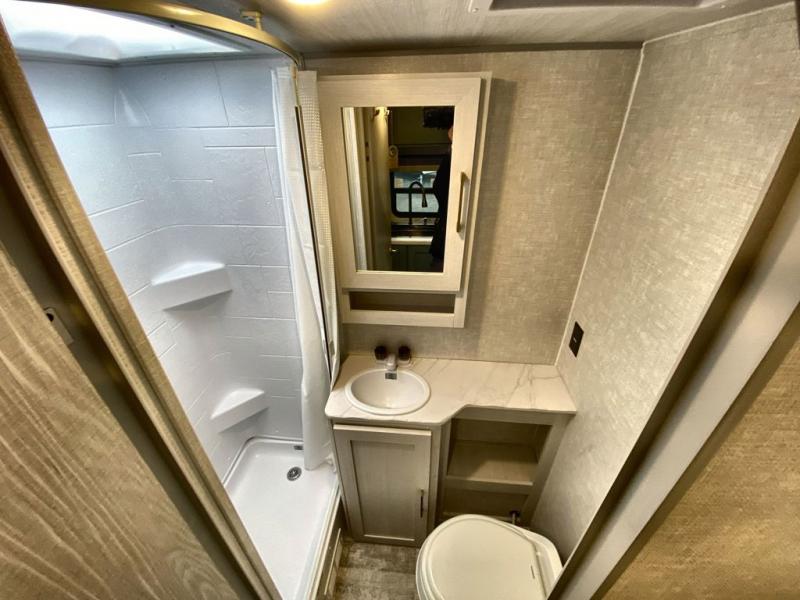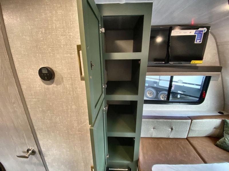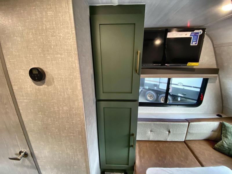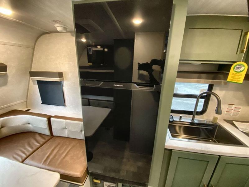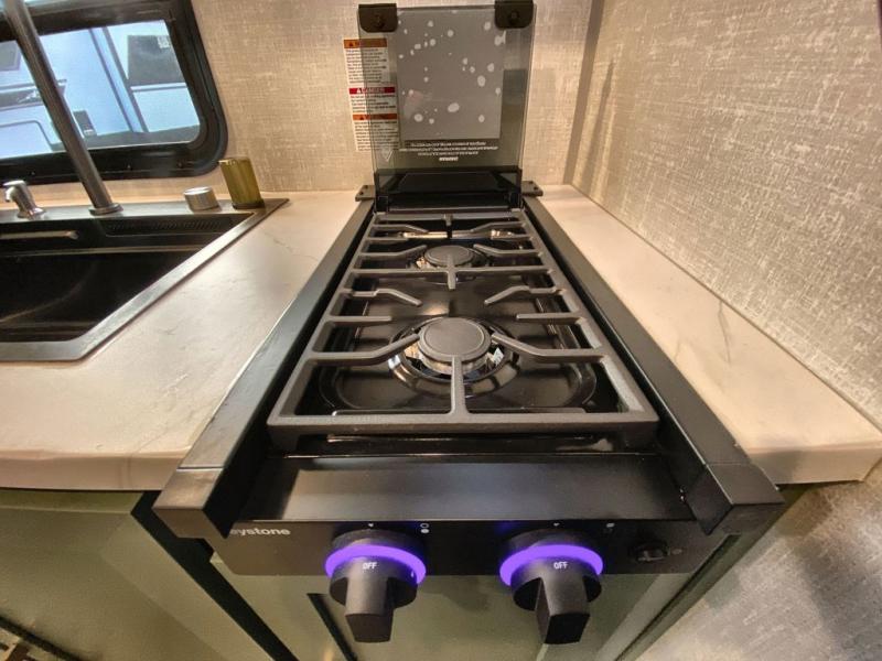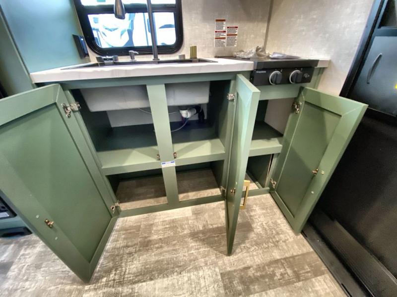 This easy to tow trailer is perfect for weekend trips to the lake! Once you're set up at camp, put out the patio awning, make lunch on the outside kitchen, and grab your camp chairs from the slam latch cargo doors with pass-thru lighting. The kitchen includes an all-in-one microwave and air fryer, plus a pantry and refrigerator for food storage. When it's time to call it a night, the front queen bed with a U-shaped dinette is sure to bring comfort!