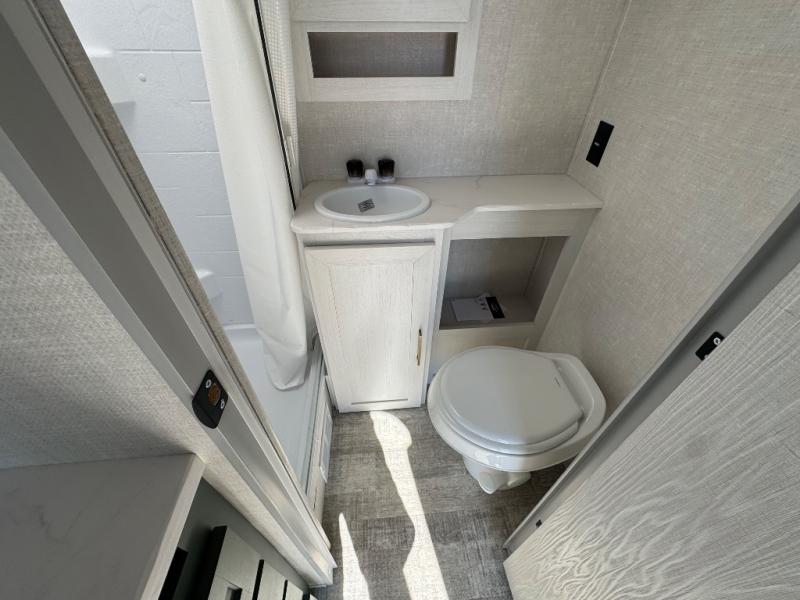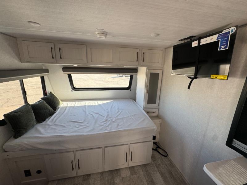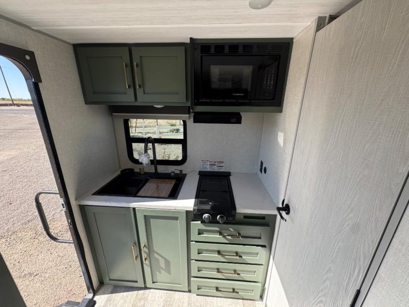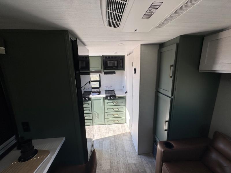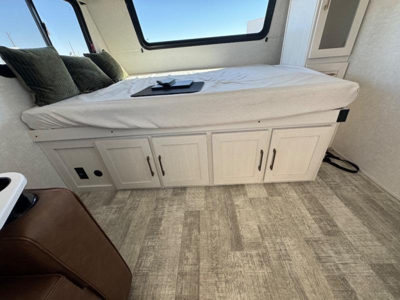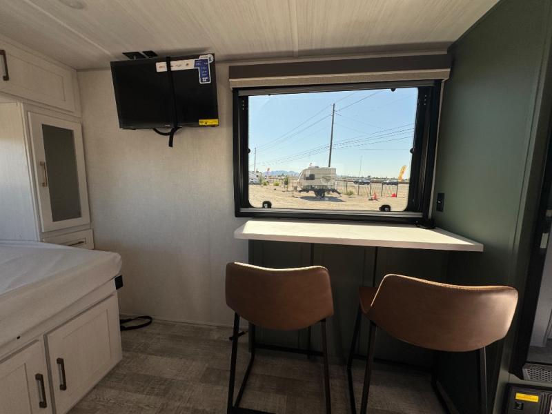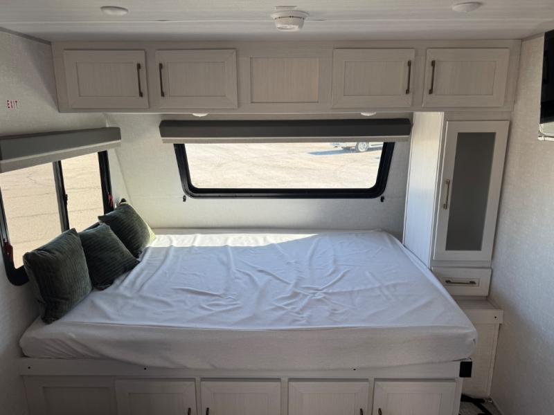 This easy to tow trailer is perfect for weekend trips to the lake! Once you're set up at camp, put out the patio awning, make lunch on the outside kitchen, and grab your camp chairs from the slam latch cargo doors with pass-thru lighting. A jackknife sofa inside will provide a place to relax in the evenings, and a full bath means you won't have to use the camp's facilities. There is also a bar top with two seats and a flip-up window where you can enjoy your morning coffee at! The rear corner kitchen includes an all-in-one microwave and air fryer, plus a pantry and refrigerator for food storage. When it's time to call it a night, the front queen bed is sure to bring comfort!