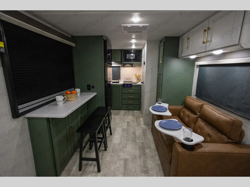 This easy to tow trailer is perfect for weekend trips to the lake! Once you're set up at camp, put out the patio awning, make lunch on the outside kitchen, and grab your camp chairs from the slam latch cargo doors with pass-thru lighting. A jackknife sofa inside will provide a place to relax in the evenings, and a full bath means you won't have to use the camp's facilities. There is also a bar top with two seats and a flip-up window where you can enjoy your morning coffee at! The rear corner kitchen includes an all-in-one microwave and air fryer, plus a pantry and refrigerator for food storage. When it's time to call it a night, the front queen bed is sure to bring comfort!