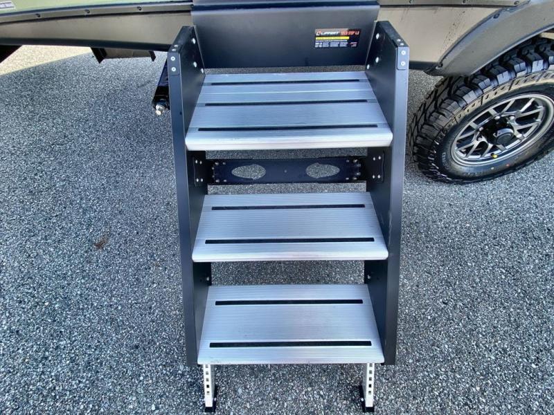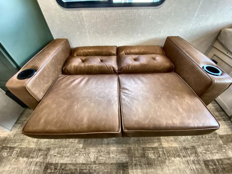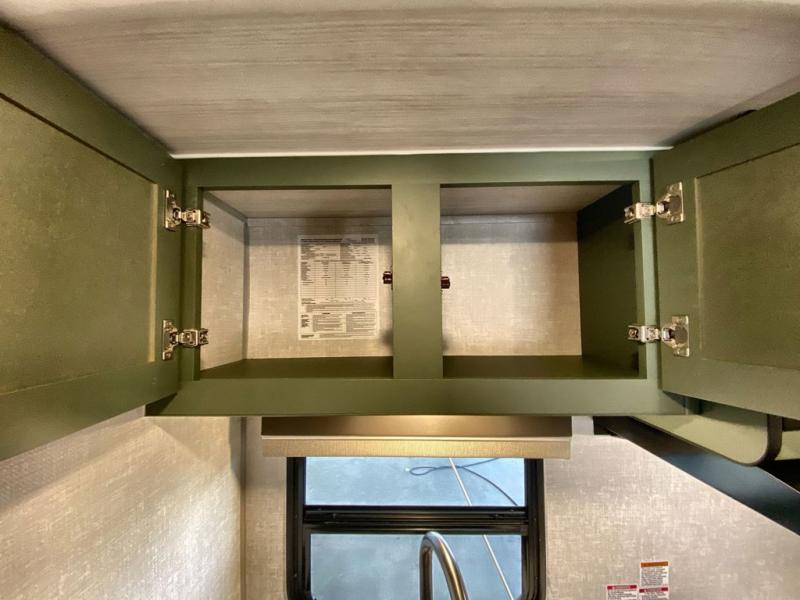 This easy to tow trailer is perfect for weekend trips to the lake! Once you're set up at camp, put out the patio awning, make lunch on the outside kitchen, and grab your camp chairs from the slam latch cargo doors with pass-thru lighting. A jackknife sofa inside will provide a place to relax in the evenings, and a full bath means you won't have to use the camp's facilities. There is also a bar top with two seats and a flip-up window where you can enjoy your morning coffee at! The rear corner kitchen includes an all-in-one microwave and air fryer, plus a pantry and refrigerator for food storage. When it's time to call it a night, the front queen bed is sure to bring comfort!