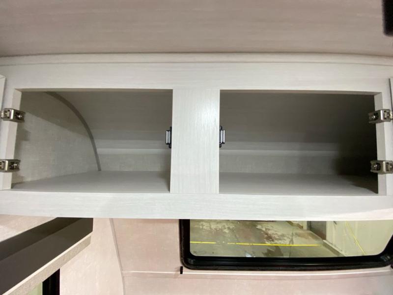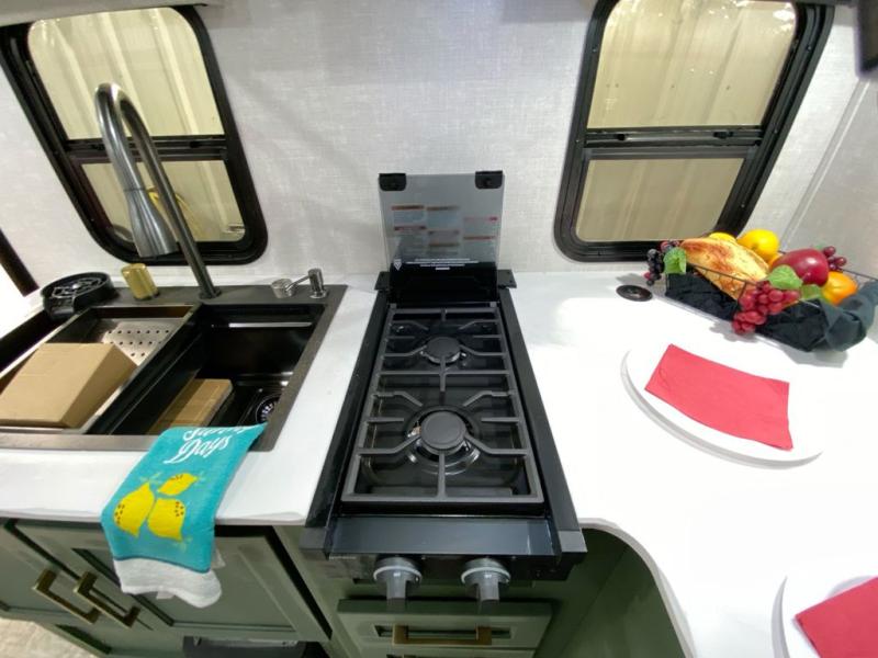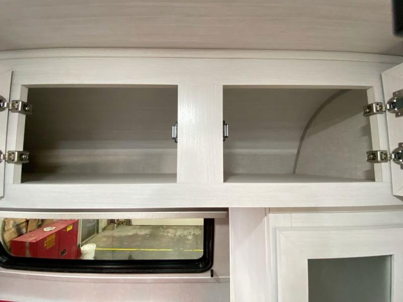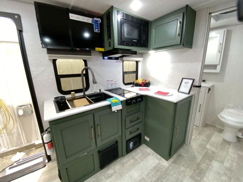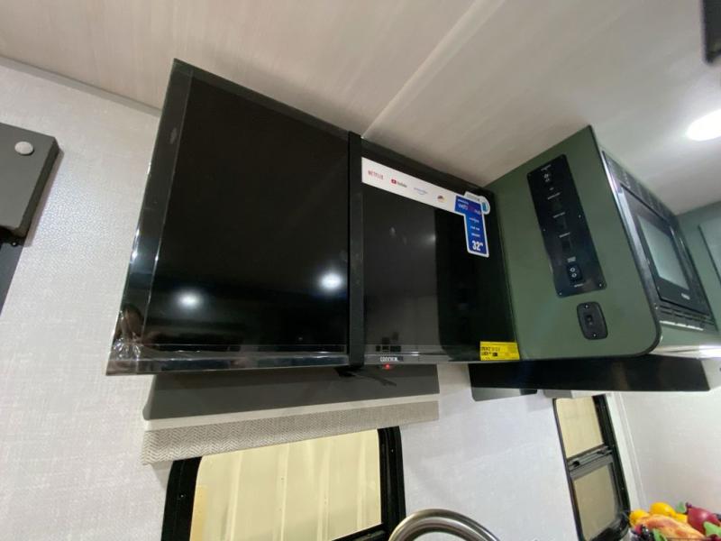This spacious trailer is perfect for weekend trips to the lake! Once you're set up at camp, put out the patio awning, make lunch on the outside kitchen, and grab your camp chairs from the slam latch cargo doors with pass-thru lighting. A jackknife sofa slide inside will provide more space and a place to relax in the evenings, and a full bath means you won't have to use the camp's facilities. The kitchen includes an all-in-one microwave and air fryer, plus a refrigerator and overhead cabinets for food storage. When it's time to call it a night, the front queen bed is sure to bring comfort!