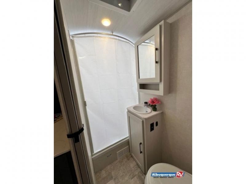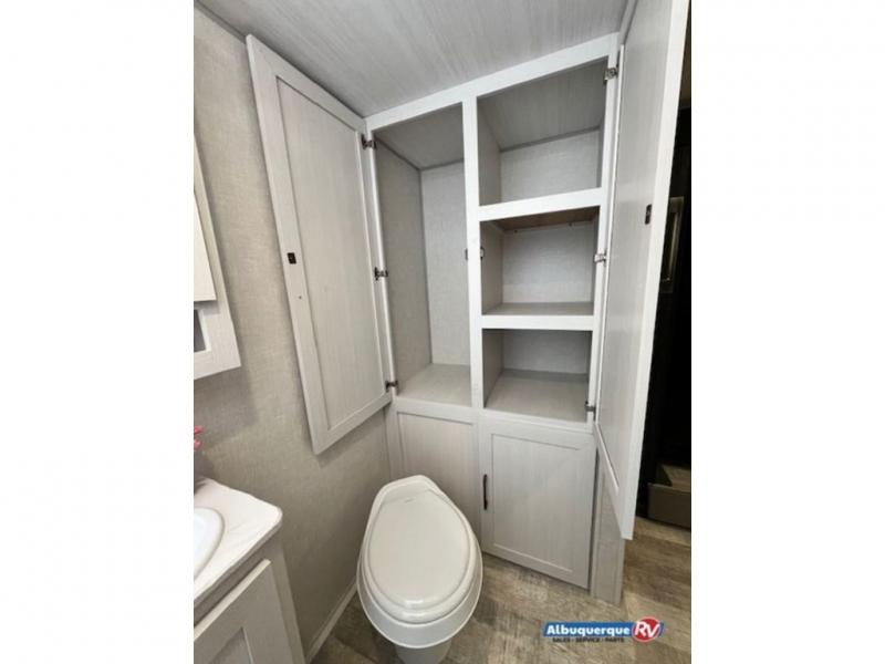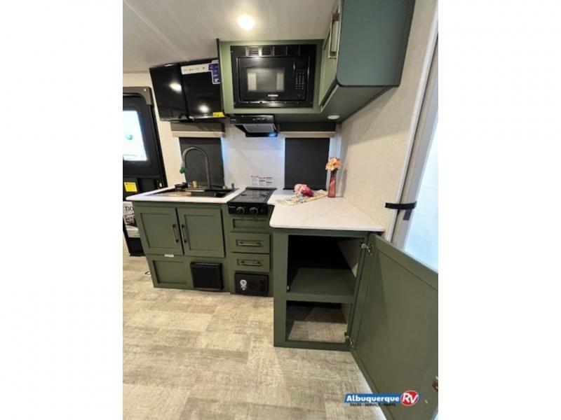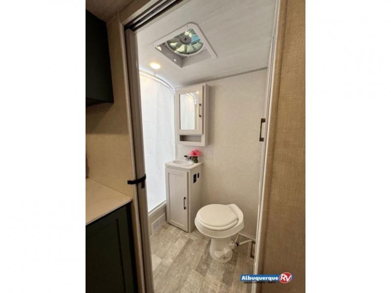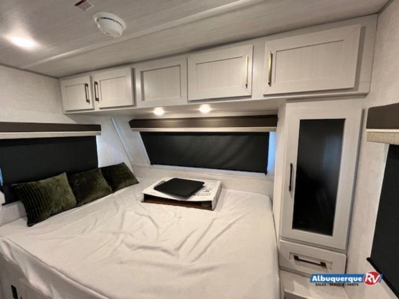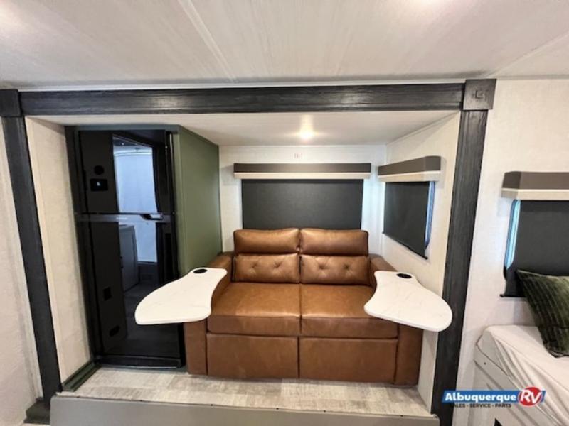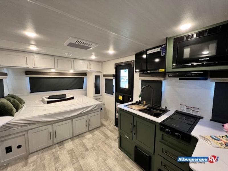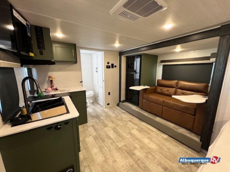 This spacious trailer is perfect for weekend trips to the lake! Once you're set up at camp, put out the patio awning, make lunch on the outside kitchen, and grab your camp chairs from the slam latch cargo doors with pass-thru lighting. A jackknife sofa slide inside will provide more space and a place to relax in the evenings, and a full bath means you won't have to use the camp's facilities. The kitchen includes an all-in-one microwave and air fryer, plus a refrigerator and overhead cabinets for food storage. When it's time to call it a night, the front queen bed is sure to bring comfort!