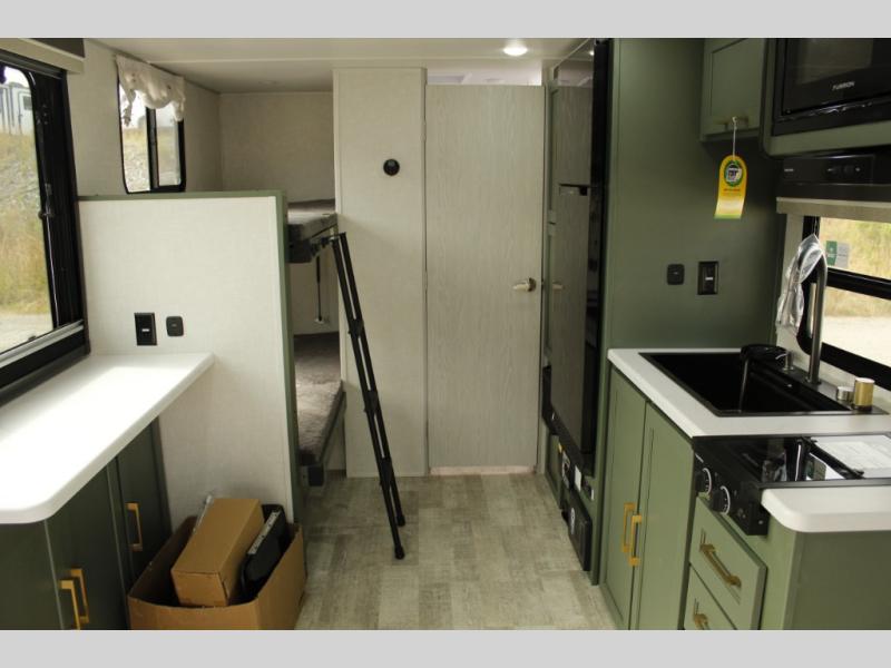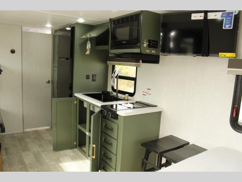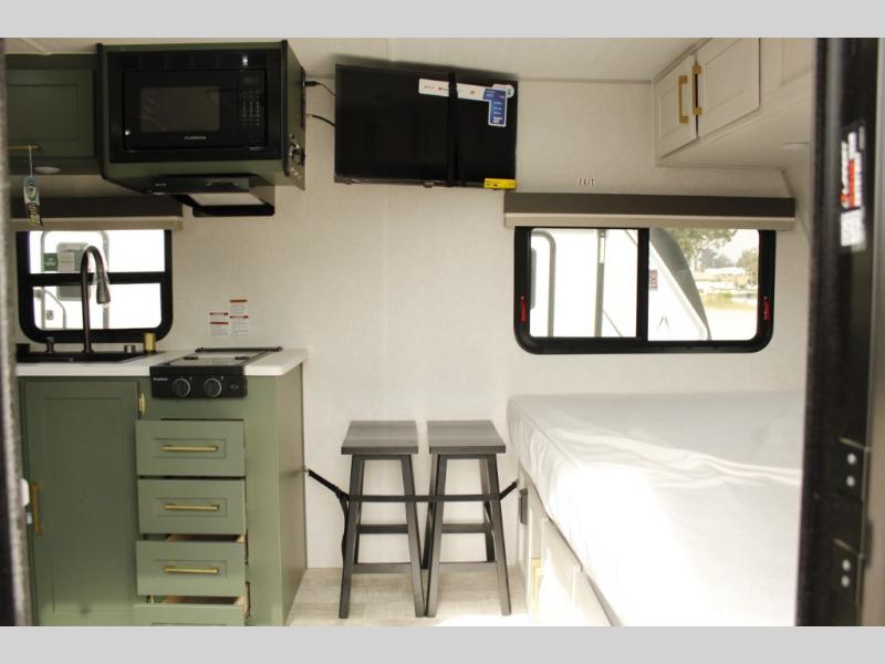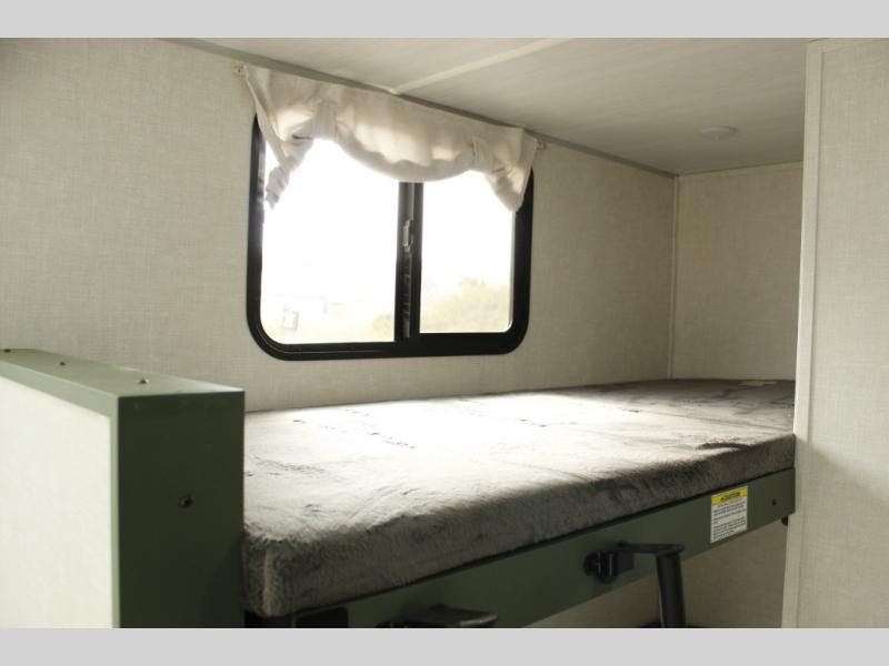 This easy to tow trailer is perfect for weekend trips to the lake! Once you're set up at camp, put out the patio awning, make lunch on the outside kitchen, and grab your camp chairs from the slam latch cargo doors with pass-thru lighting. There are 30" x 74" bunk beds and a front queen bed for sleeping space, and the bar top with two seats and a flip-up window will provide a place to enjoy your coffee at in the morning. You'll have the option to cook indoors on the all-in-one microwave and air fryer or head outdoors to cook on the outside kitchen!