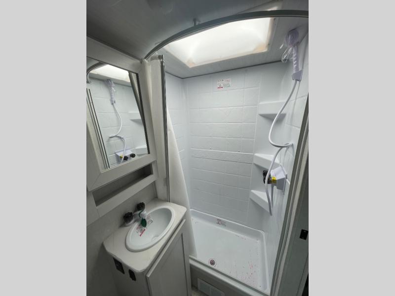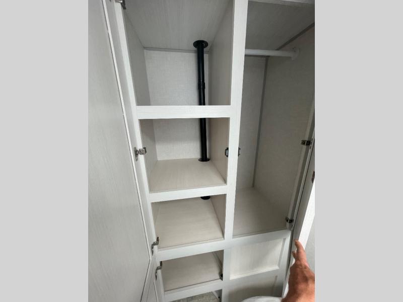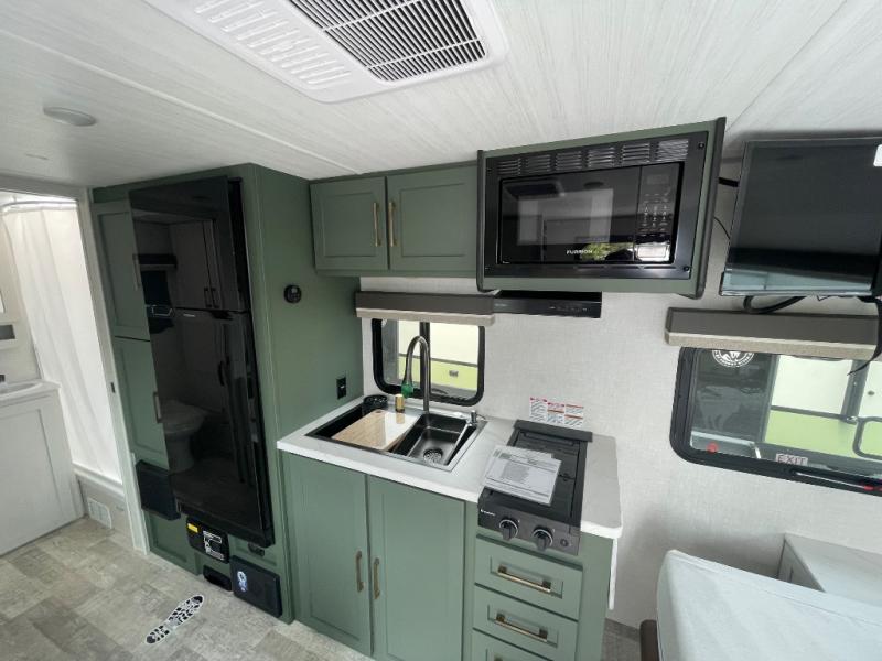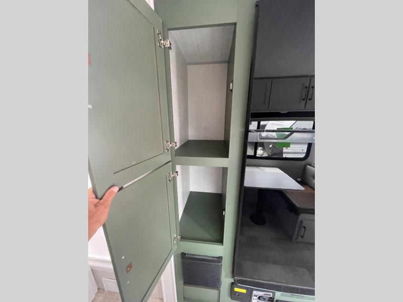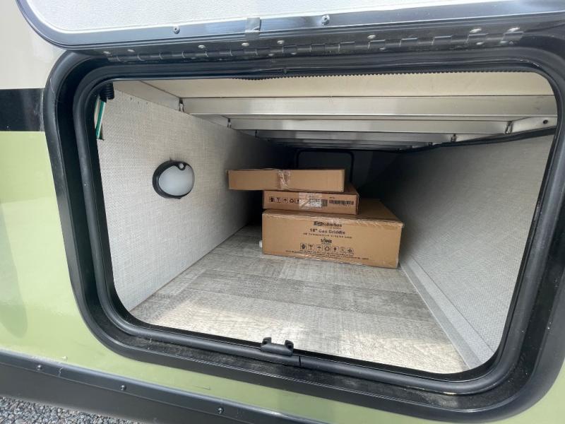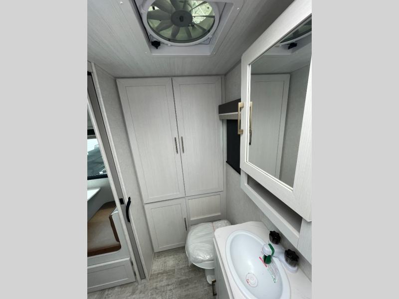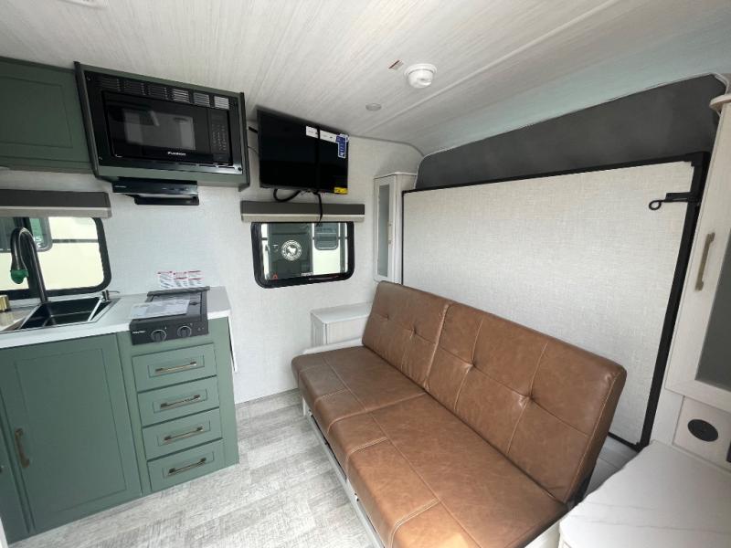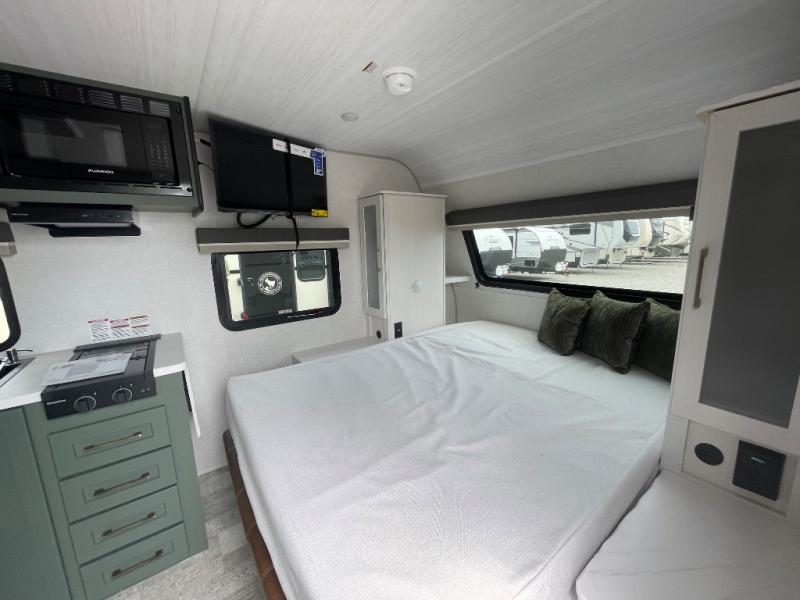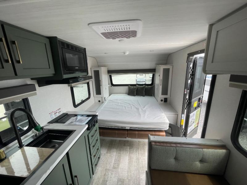 Take this No Boundaries travel trailer out for a no-stress weekend! You'll have a rear bathroom complete with a shower, toilet, vanity, and linen closet, and the kitchen comes with a pantry, microwave and air fryer plus a sink to help you stay on top of the daily meals. A booth dinette will provide a place to dine and play games in the evening, and an overnight guest can make their bed here. Up front, the Murphy bed can be set up for a great night's rest, and there are dual bedside wardrobes to keep your things tidy.