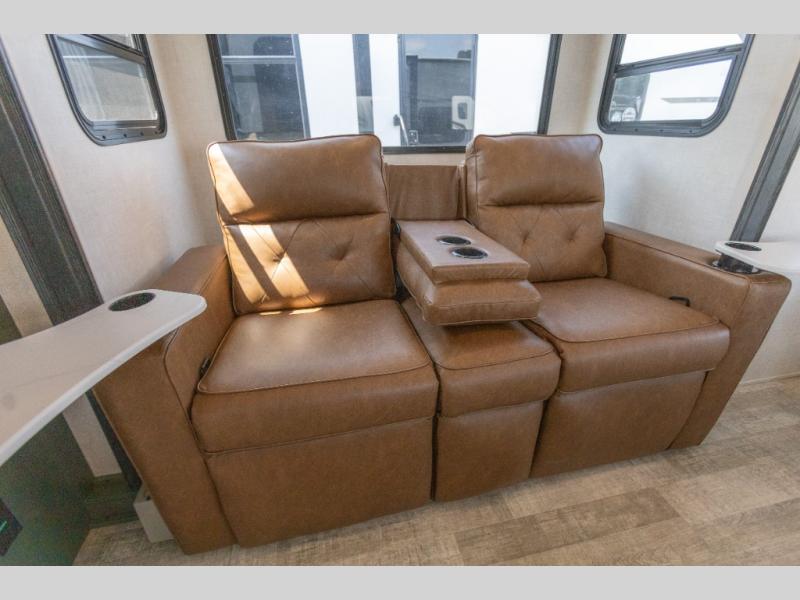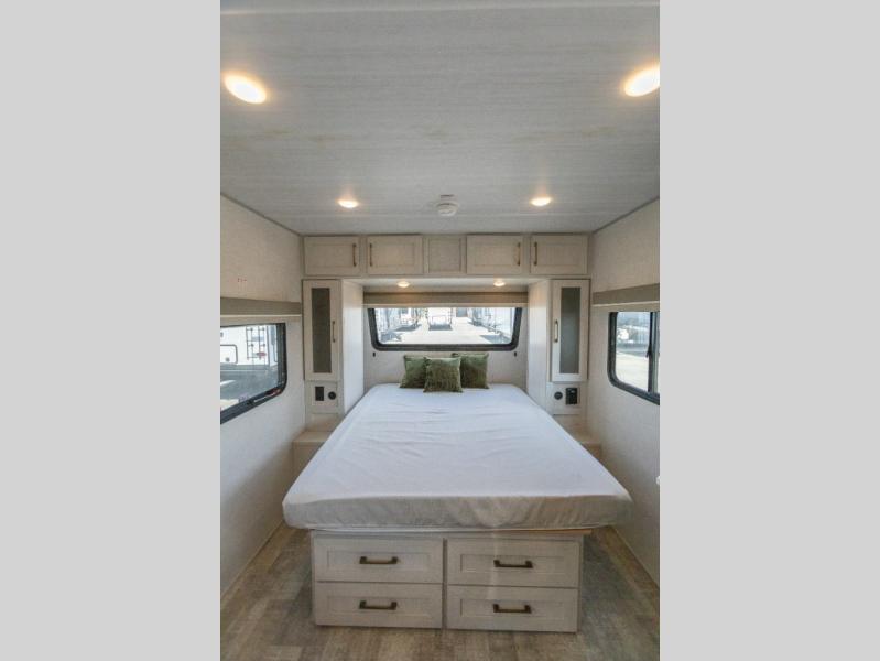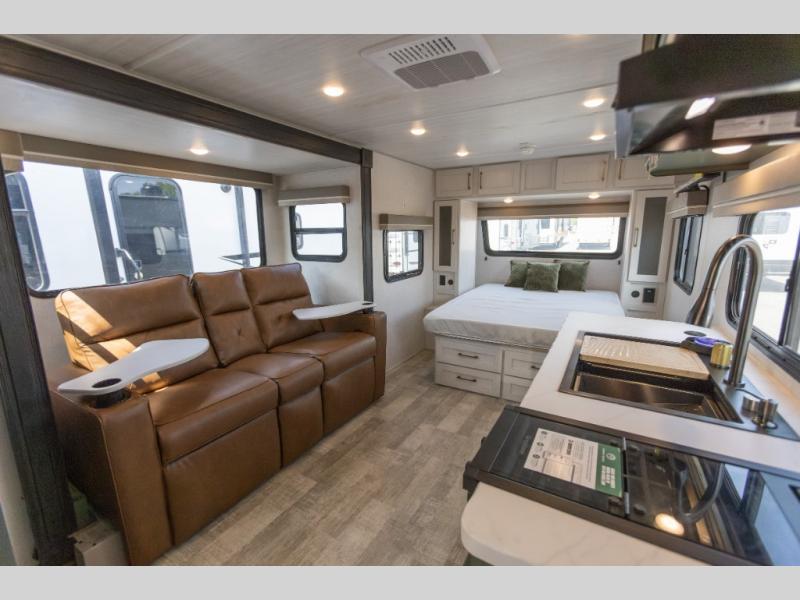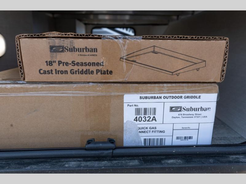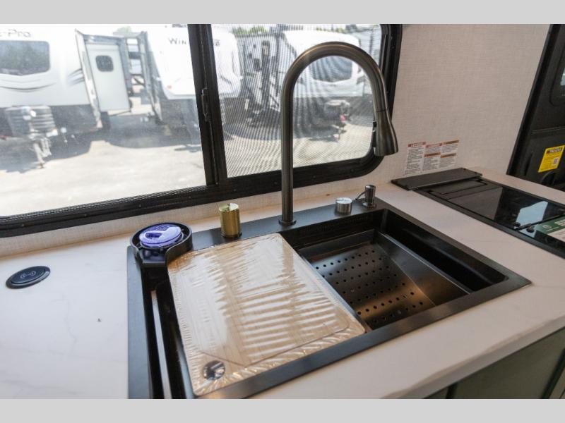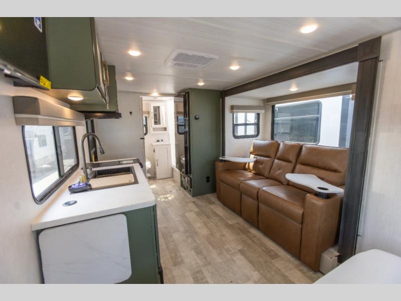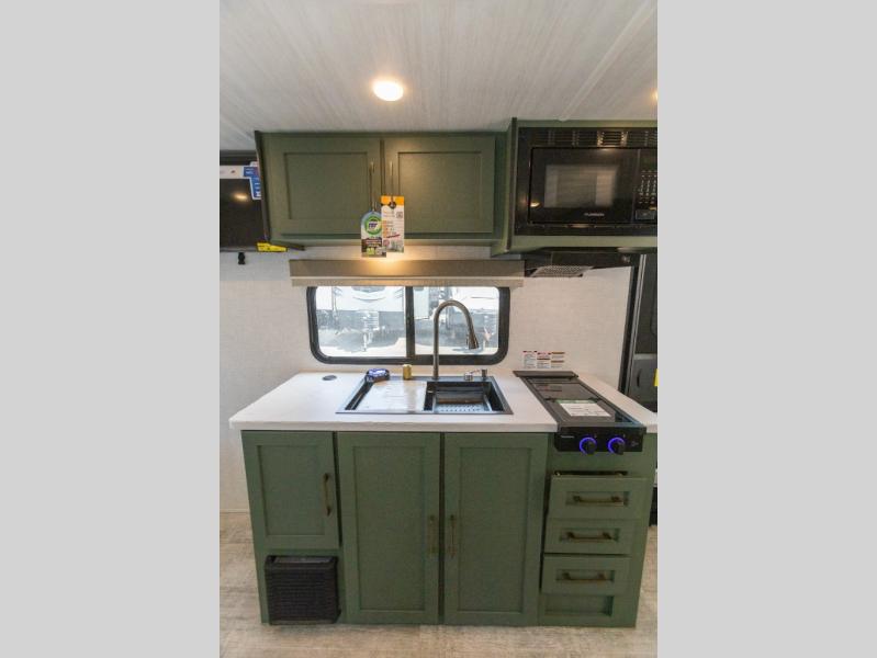 Make your camping dreams come true with this No Boundaries travel trailer! The kitchen has great amenities, like an all-in-one microwave and air fryer, a refrigerator, and a sink to clean up, but you may just find yourselves cooking on the outside kitchen. A jackknife sofa slide will provide seating and sleeping space for a guest, while you take the front queen bed. There are dual bedside wardrobes to keep your clothes organized, and the exterior slam latch cargo doors include pass-thru lighting so you can easily find what you're looking for even at night!