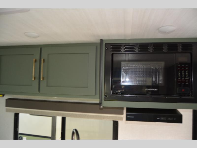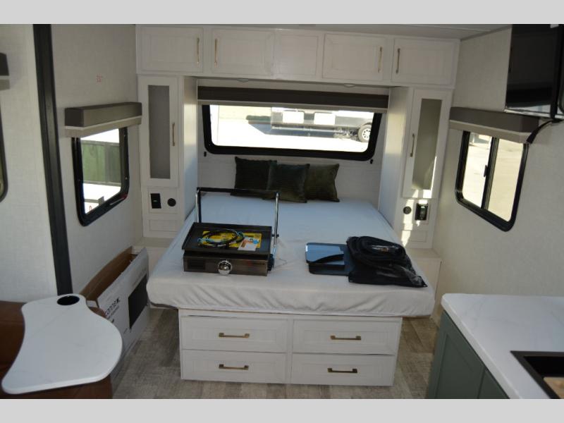 Make your camping dreams come true with this No Boundaries travel trailer! The kitchen has great amenities, like an all-in-one microwave and air fryer, a refrigerator, and a sink to clean up, but you may just find yourselves cooking on the outside kitchen. A jackknife sofa slide will provide seating and sleeping space for a guest, while you take the front queen bed. There are dual bedside wardrobes to keep your clothes organized, and the exterior slam latch cargo doors include pass-thru lighting so you can easily find what you're looking for even at night! The Beast Mode Package on this model comes with an additional 200W solar panel, a 2,000W inverter, and an independent suspension for better clearance and handling!